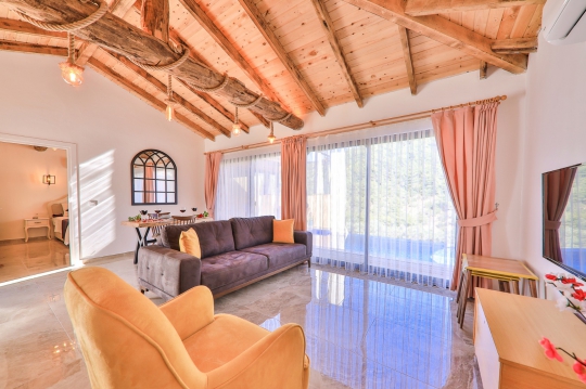 Oturma grubu, uydu alıcı, TV, klima, ütü ve ütü masası, elektrik süpürgesi, havuza çıkış bulunmaktadır.