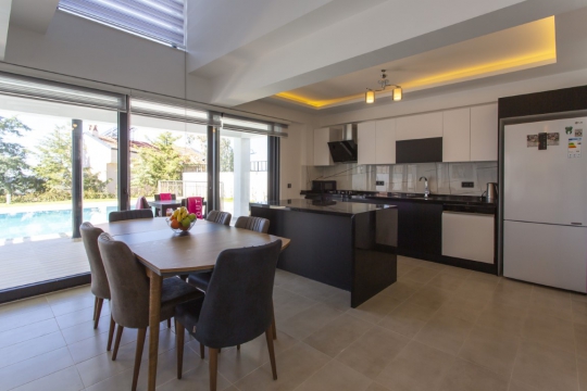 Villa içerisinde, modern ve şık bir tasarıma sahip olan geniş bir oturma odası ve tam donanımlı bir Amerikan mutfak bulunmaktadır. Villamızda tatil boyunca ihtiyaç duyabileceğiniz her türlü araç gereç ve ekipman mevcuttur.