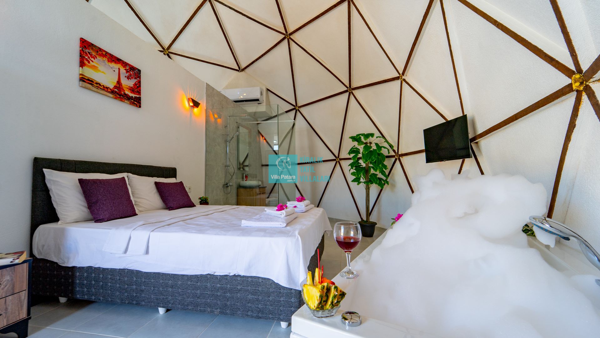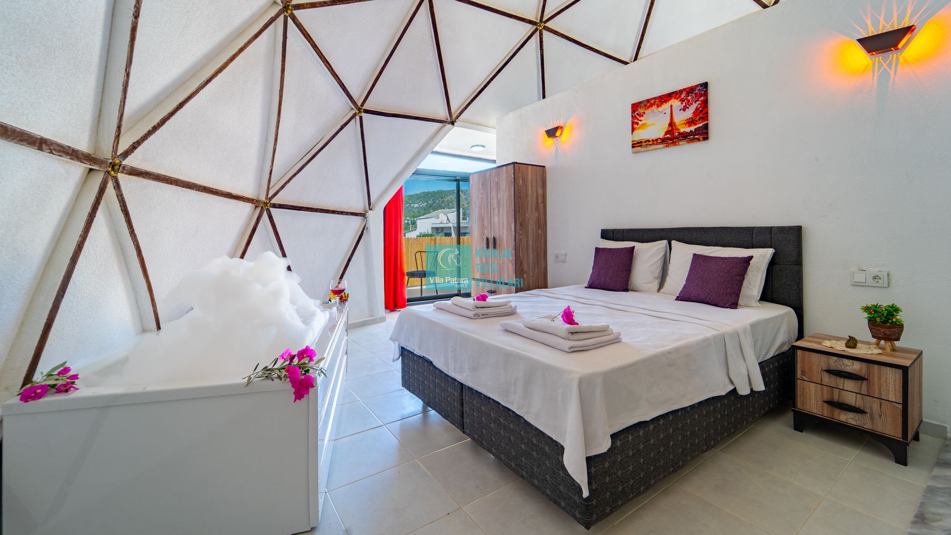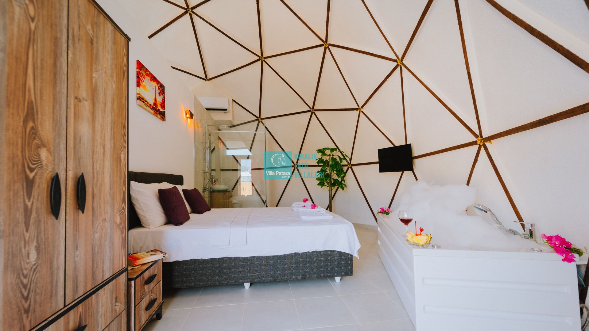 Dome balayı evimiz özel, korunaklı bahçesi, 1 yatak odasından oluşuyor. Yatak odasının içerisinde ebeveyn tuvalet & banyosu yer almaktadır. Yatak odasında aynı zamanda 2 kişilik büyük bir jakuzi bulunmaktadır.