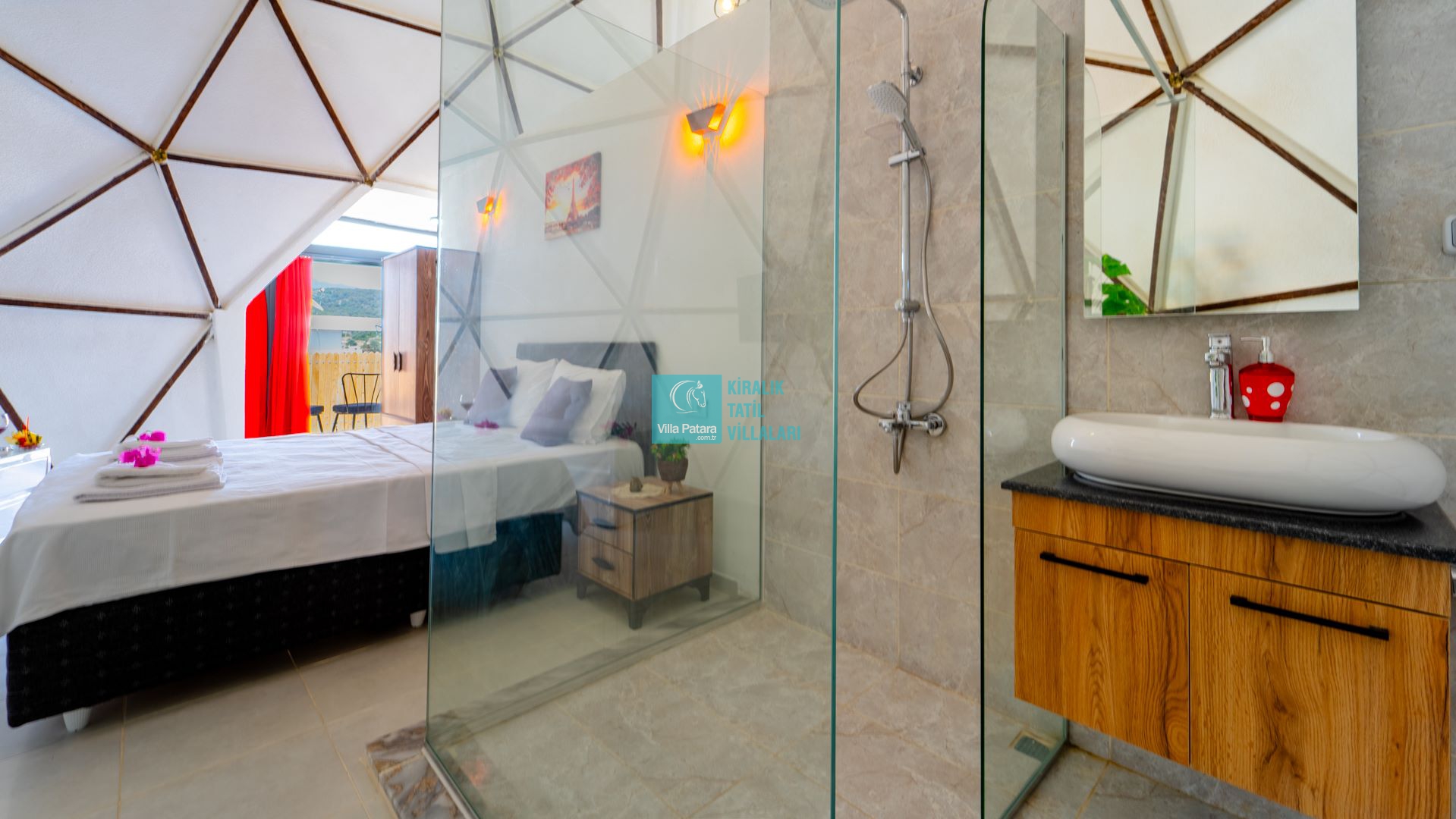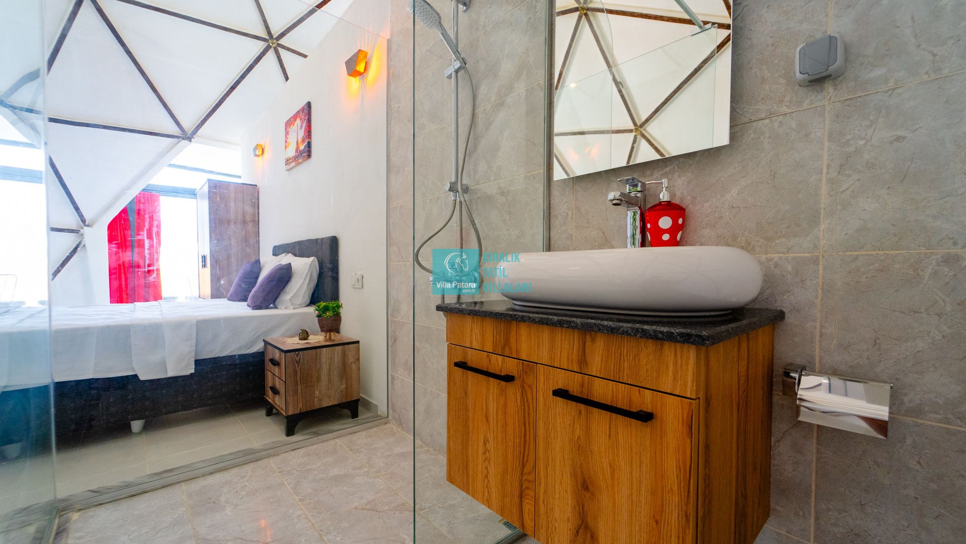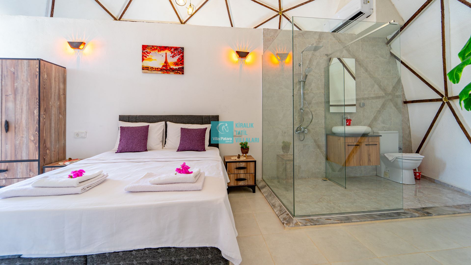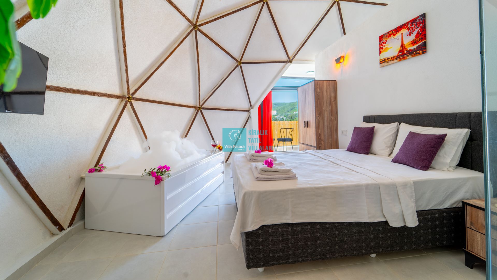 Dome balayı evimiz özel, korunaklı bahçesi, 1 yatak odasından oluşuyor. Yatak odasının içerisinde ebeveyn tuvalet & banyosu yer almaktadır. Yatak odasında aynı zamanda 2 kişilik büyük bir jakuzi bulunmaktadır.