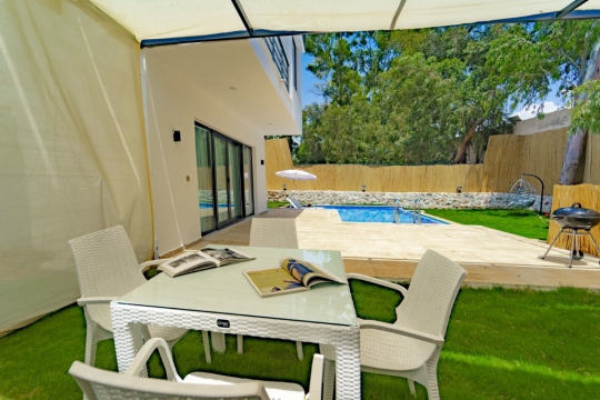 Detayları; Şezlonglar, güneş şemsiyesi, 4 kişilik yemek masası, jakuzi.