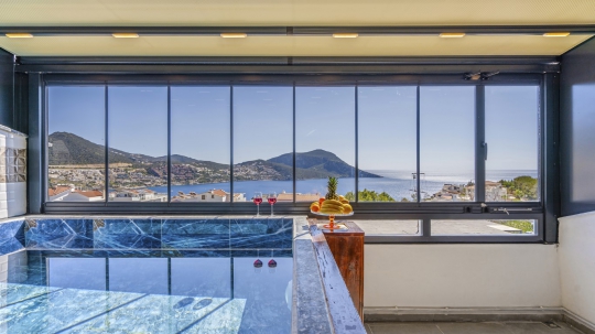 Aparat süit manzara 2 , 2 yatak odasına sahiptir ve 4 kişinin konaklayabileceği kapasiteye göre modern ve şık dekore edilmiştir. Terasında havuz bulunmaktadır.