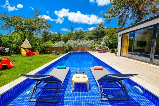 Terasında özel yüzme havuzu, şezlonglar, güneş şemsiyeleri, hamak, masa ve sandalyeler, mangal bulunmaktadır.
