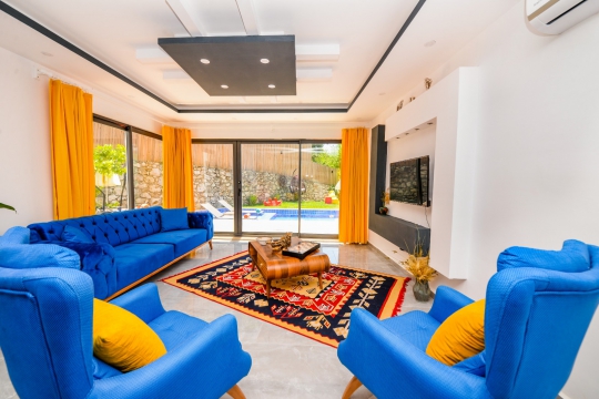 Şık dekore edilmiş salonda, oturma grubu, TV, uydu alıcı ve klima yer almaktadır. Ayrıca salondan havuz terasına çıkışta bulunmaktadır.