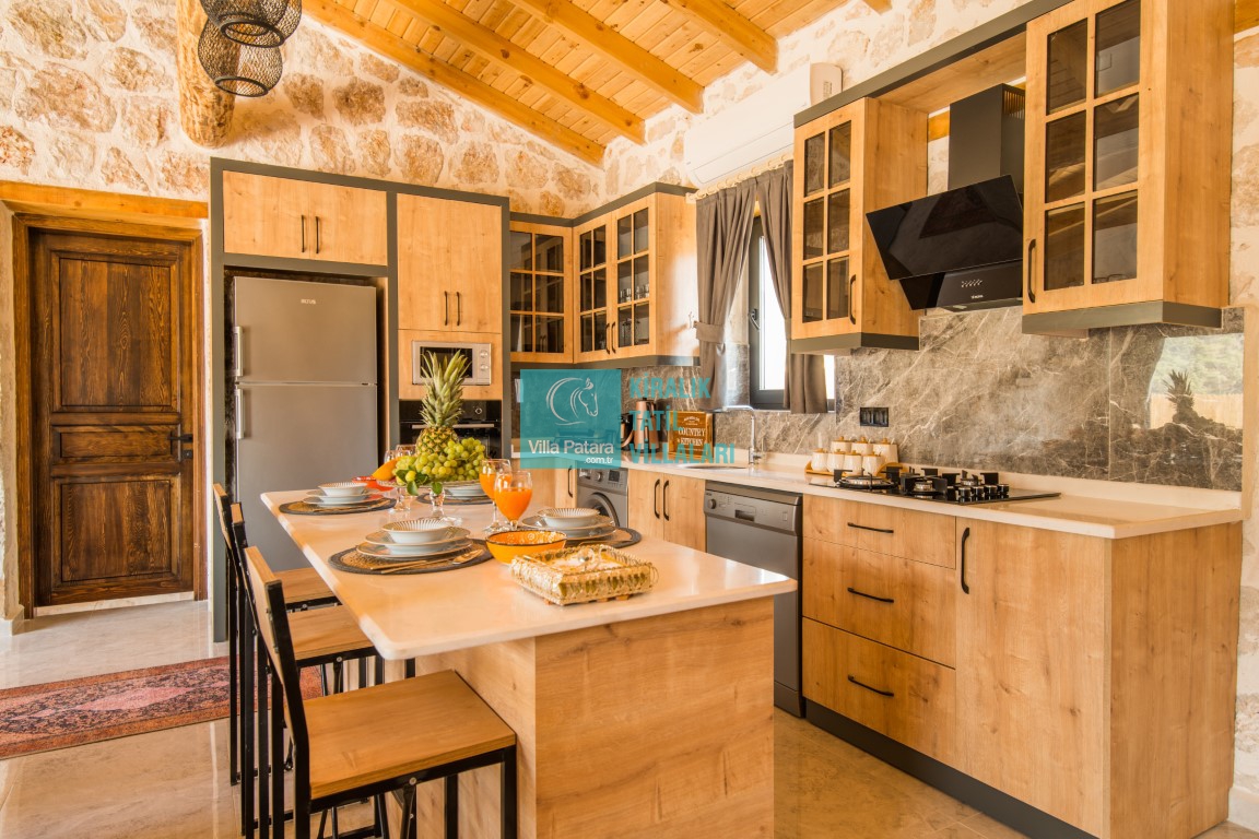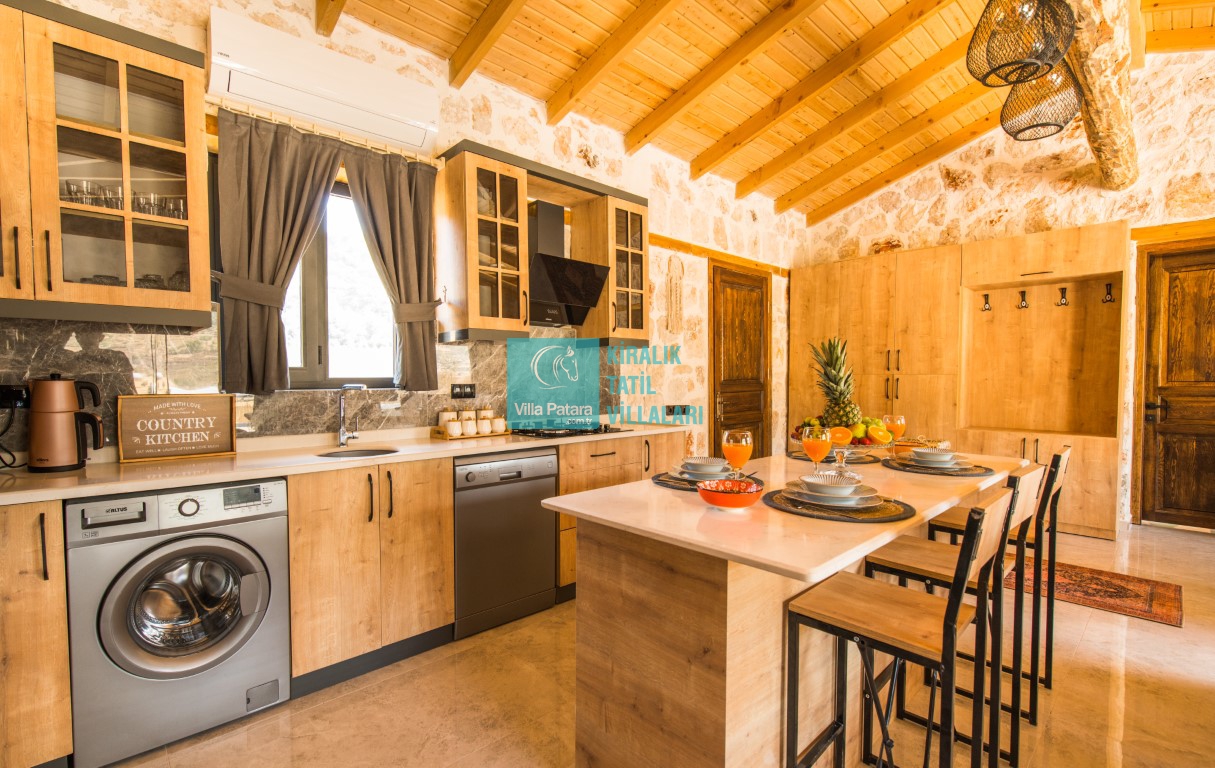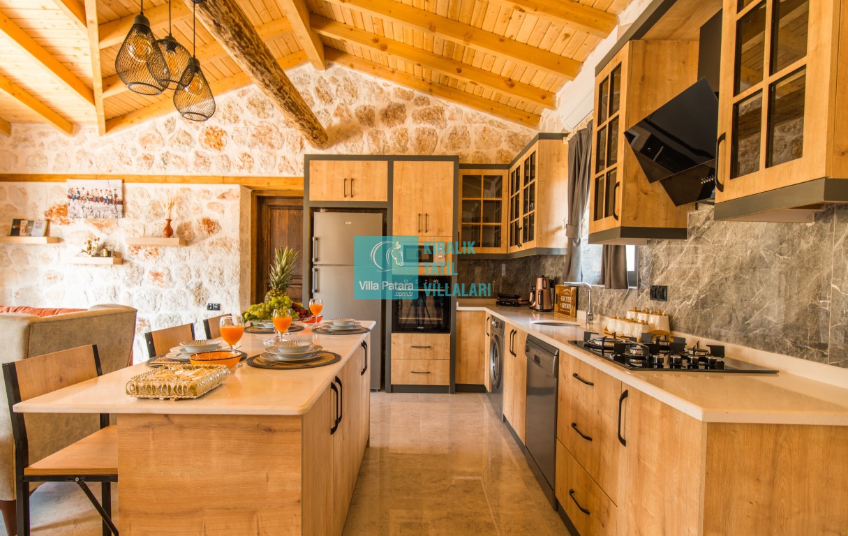 Mutfak : Şık bir Amerikan mutfağa sahip olan villamızın mutfağında tüm ihtiyaçlarınız düşünülerek dizayn edilmiştir. Buzdolabı, ocak, fırın, yemek takımları, bulaşık makinesi gibi pek çok imkan sizler için sunulmuştur.