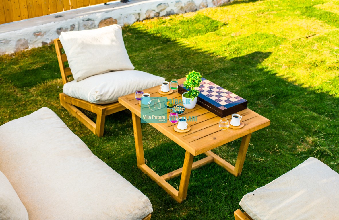 Bahçe : barbekü, dış duş, şezlong, şemsiye, oturma grubu, yemek masası, salıncak ve pergole bulunmaktadır.