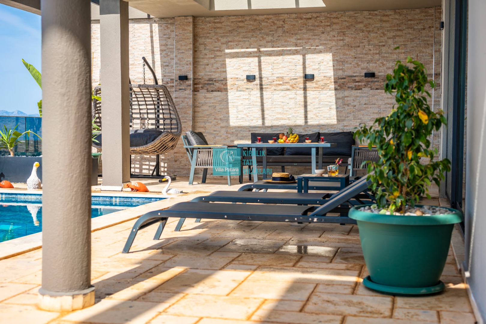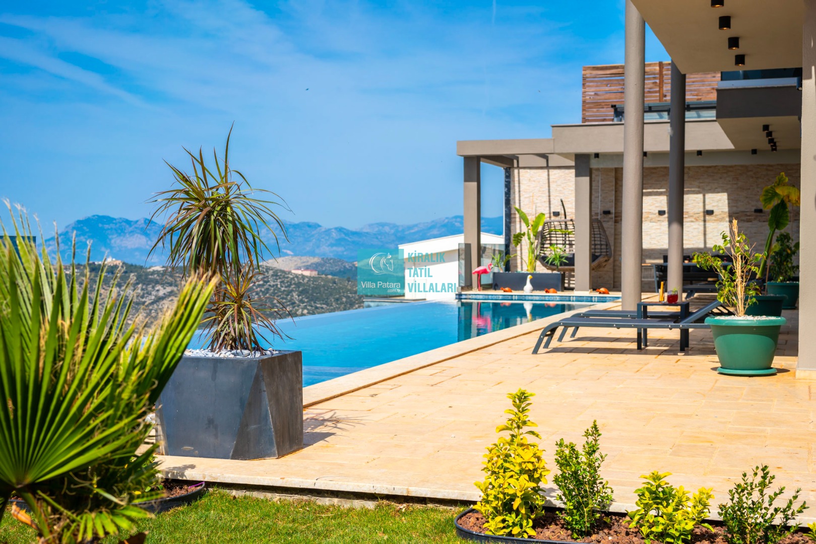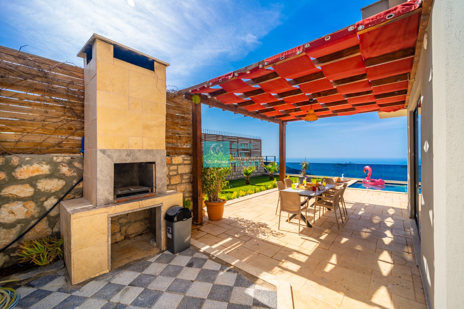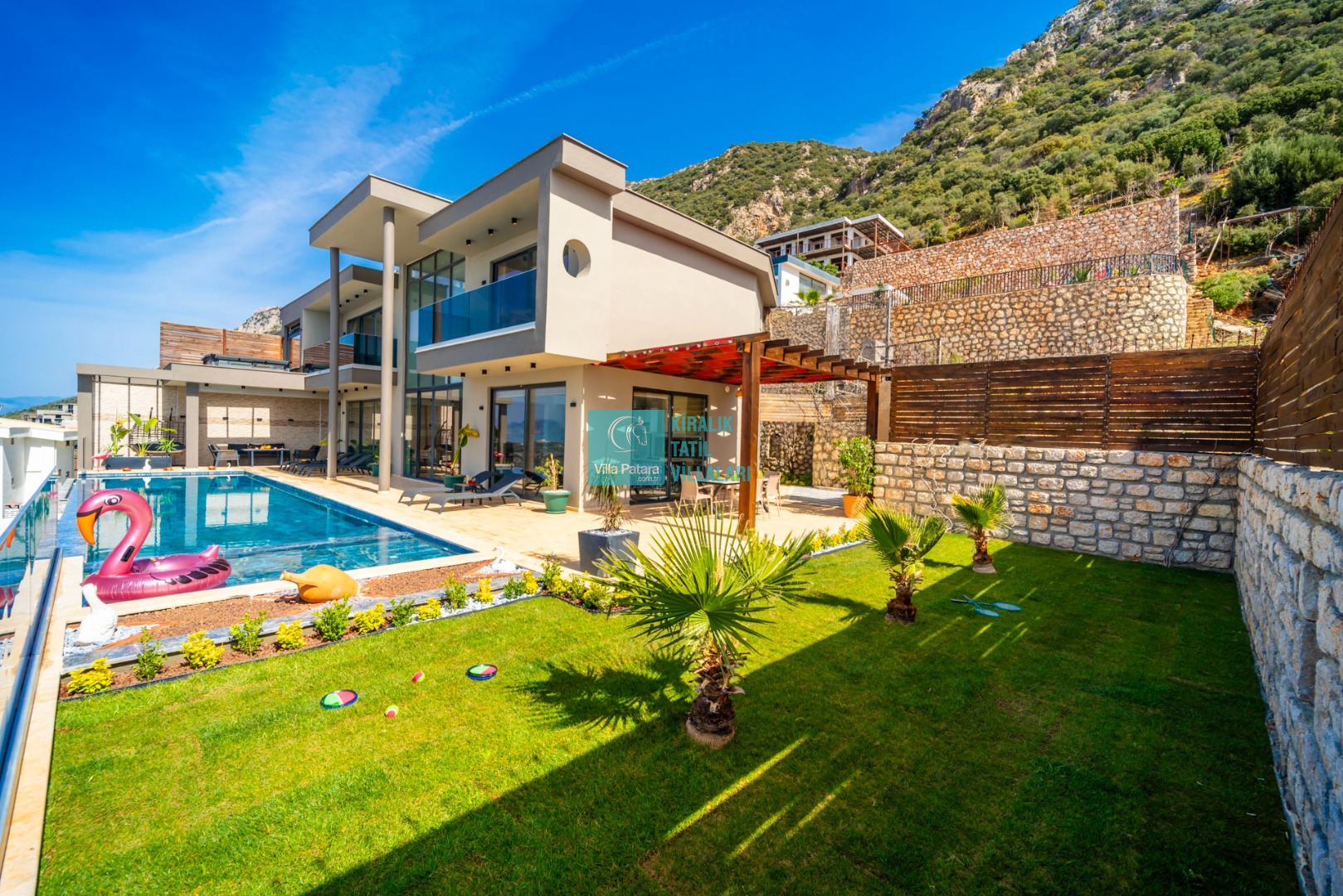 Havuz ve Bahçe : Özel yüzme havuzu bulunan villamızın havuz terasında şemsiye, şezlong, barbekü, pergola, oturma alanı, yemek masası ve sandalyeler bulunmaktadır.
