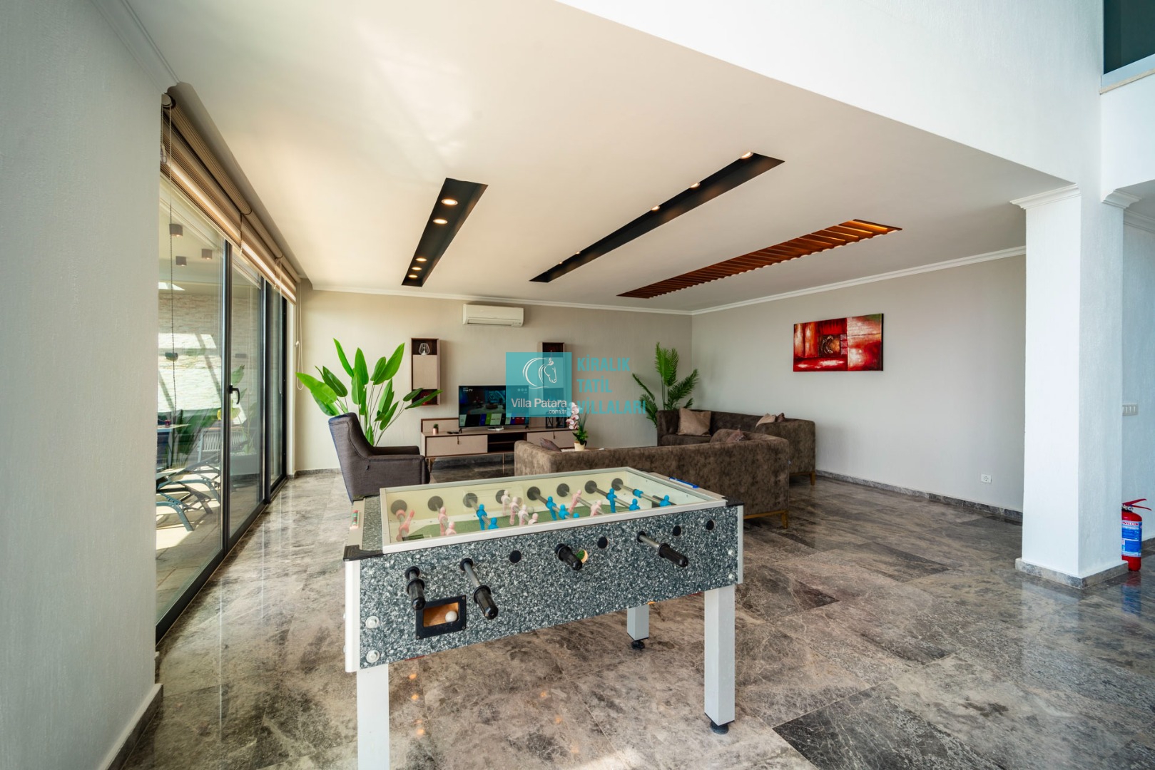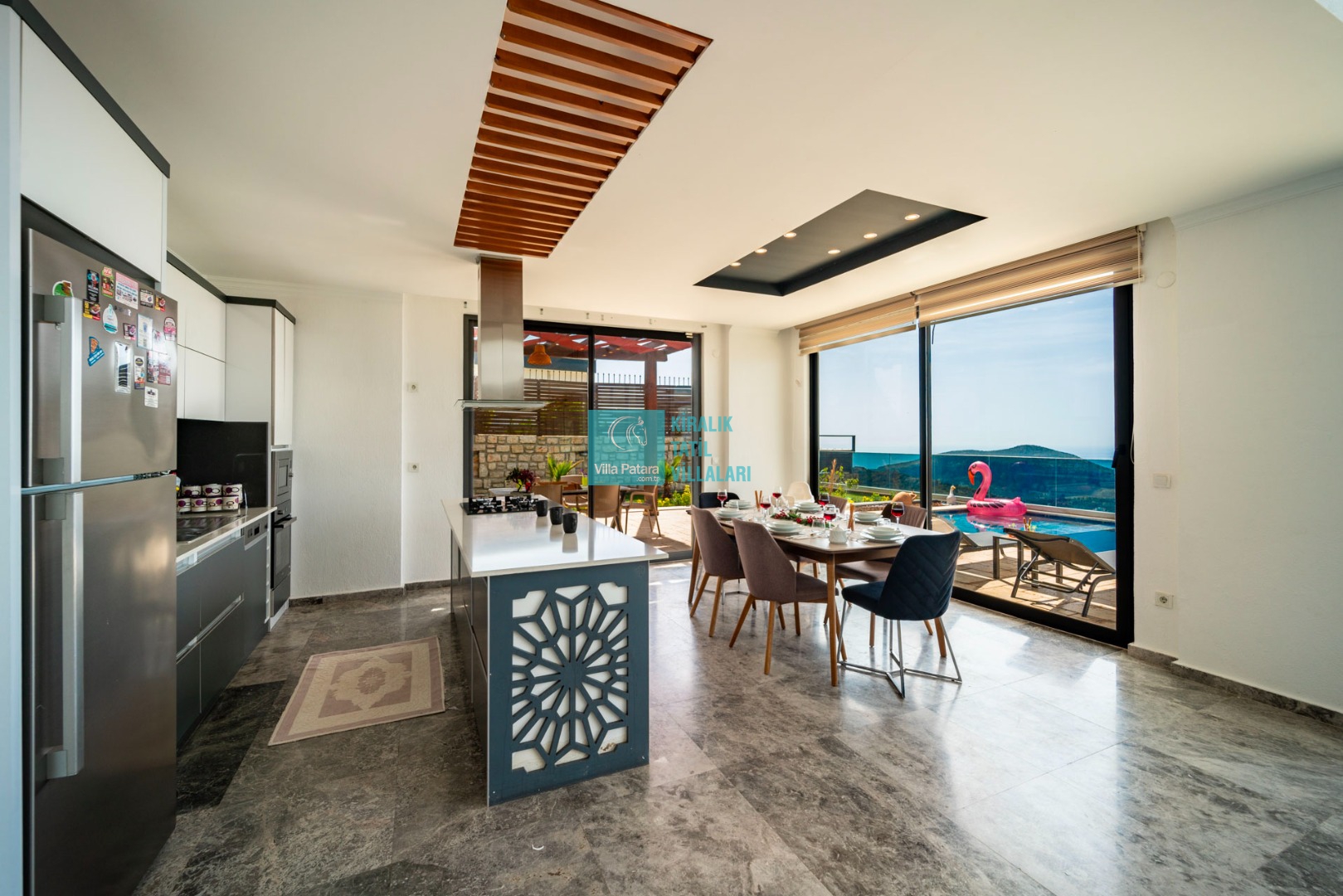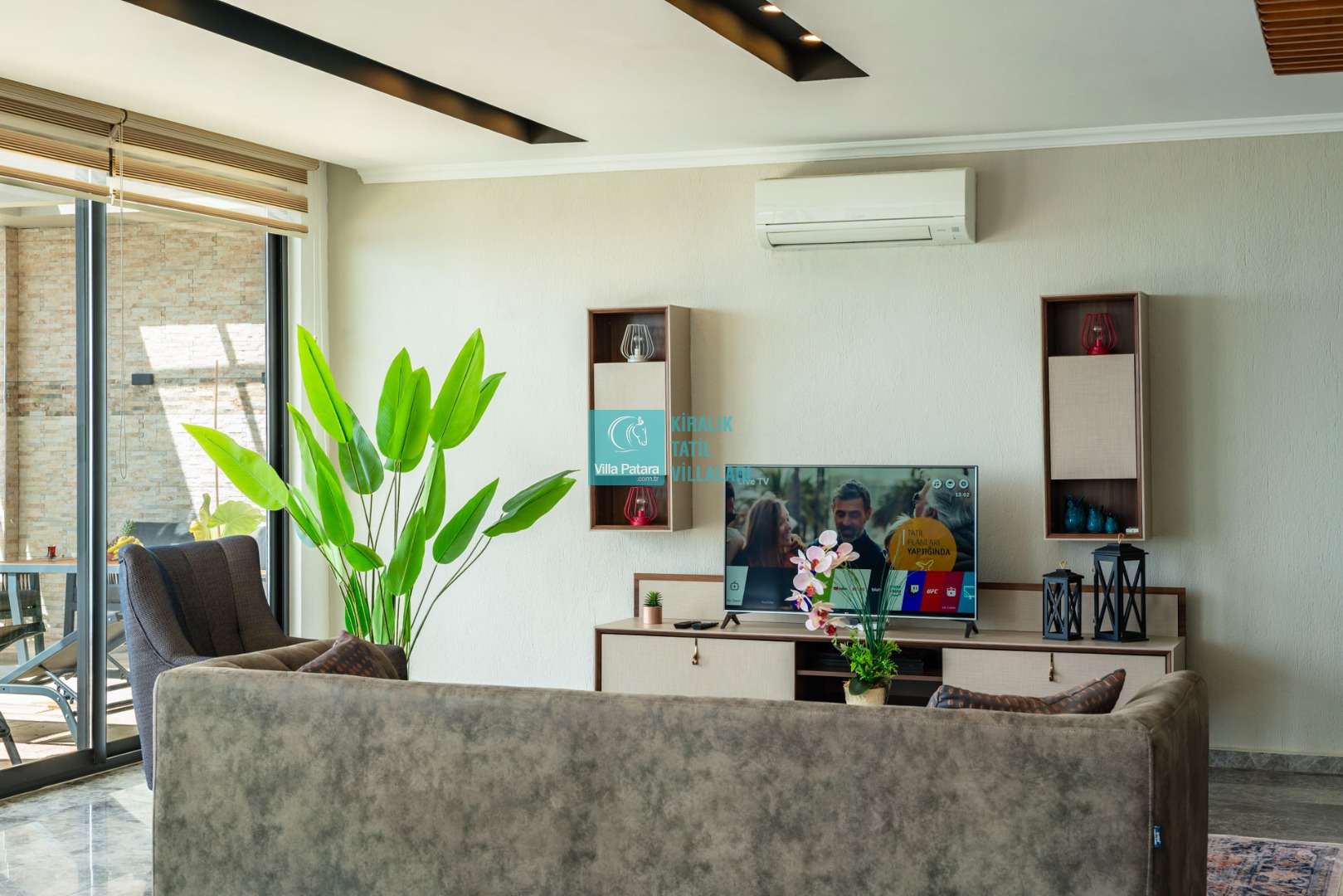 Salon : Oturma grubu, Uydu TV (LCD), Klima, 6 kişilik yemek masası, Havuz terasına çıkış bulunmaktadır.
