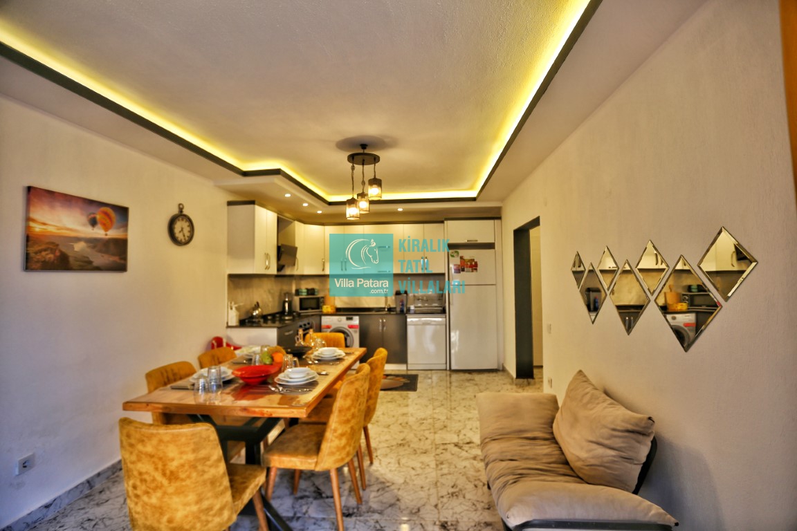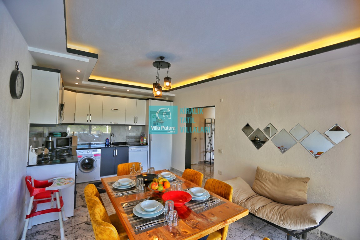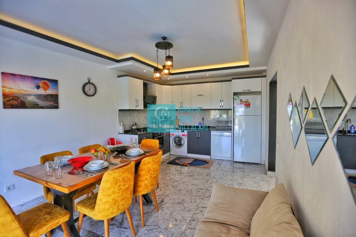 Salon ve mutfak bağımsız iki bölümden oluşmaktadır ve her ikisinden havuz terasına çıkış mevcuttur. bu katta ortak kullanım WC de yer almaktadır. Oturma grubu, TV, wifi, orta sehpa, vestiyer, yemek masası ve sandalyeler, buzdolabı, çamaşır makinesi, bulaşık makinesi, fırın, ütü masası ve ütü, kettle, tost makinesi, yemek takımı ve mutfak ekipmanları bulunmaktadır.
