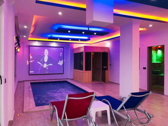 Giriş katta kapalı havuzu, hamamı, saunası,ve sinema projeksiyonu bulunmaktadır.