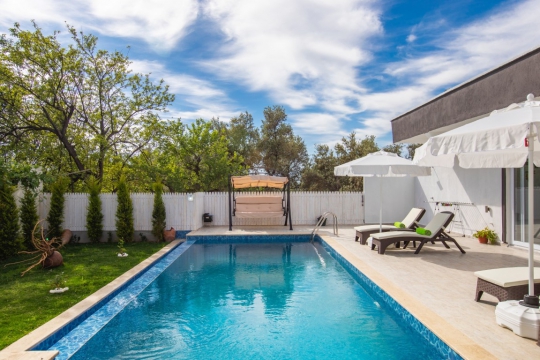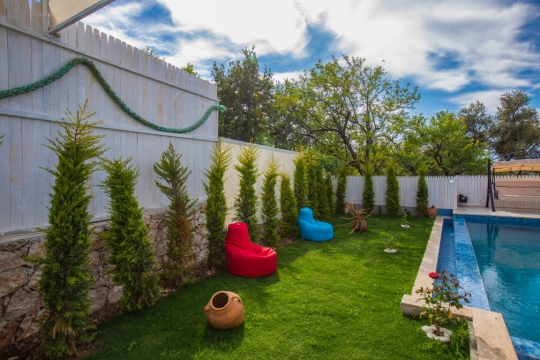 Havuz ve Bahçe Detayı : 3,5 m x 8 m x 1,5 m ölçülerinde özel korunaklı yüzme havuzu, çocuk havuzu, gölgelik, salıncak, şezlonglar, şemsiye, mangal, dış mekan oturma grubu, yeşil alan ve özel otopark bulunmaktadır.