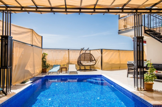 Bahçe : Şezlonglar, yemek masası, barbekü, salıncak, açık hava mobilyaları,langırt, özel yüzme havuzu bulunmaktadır.