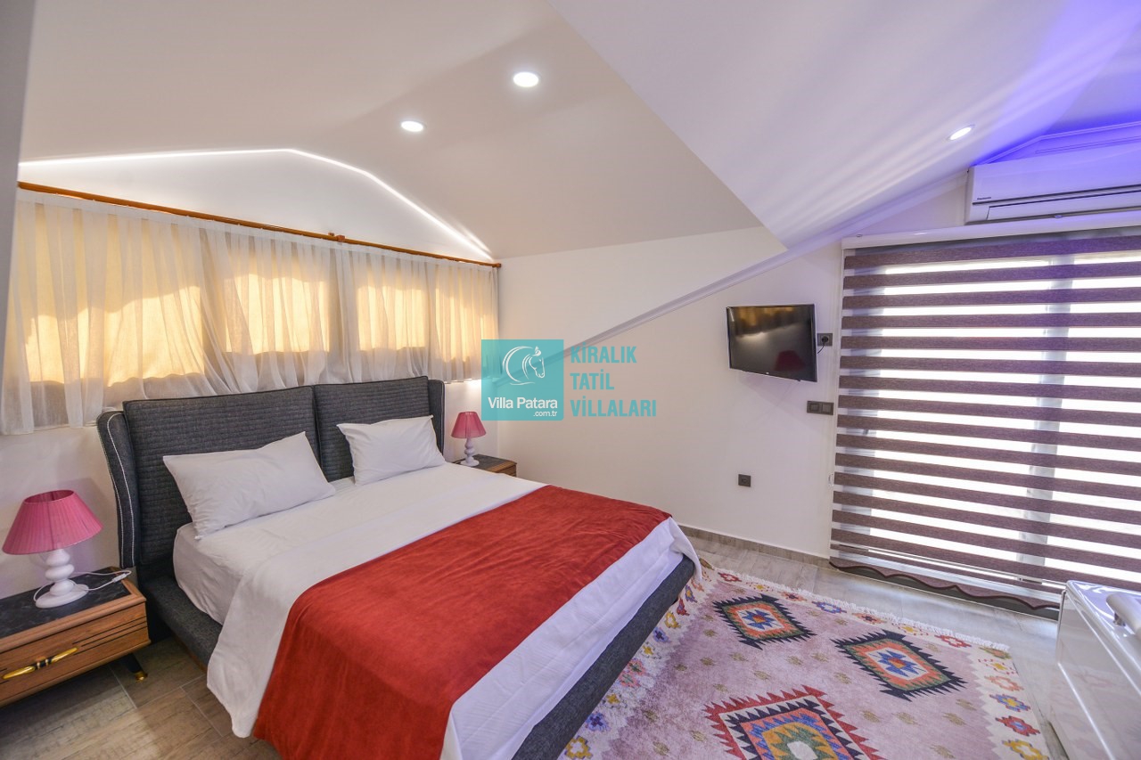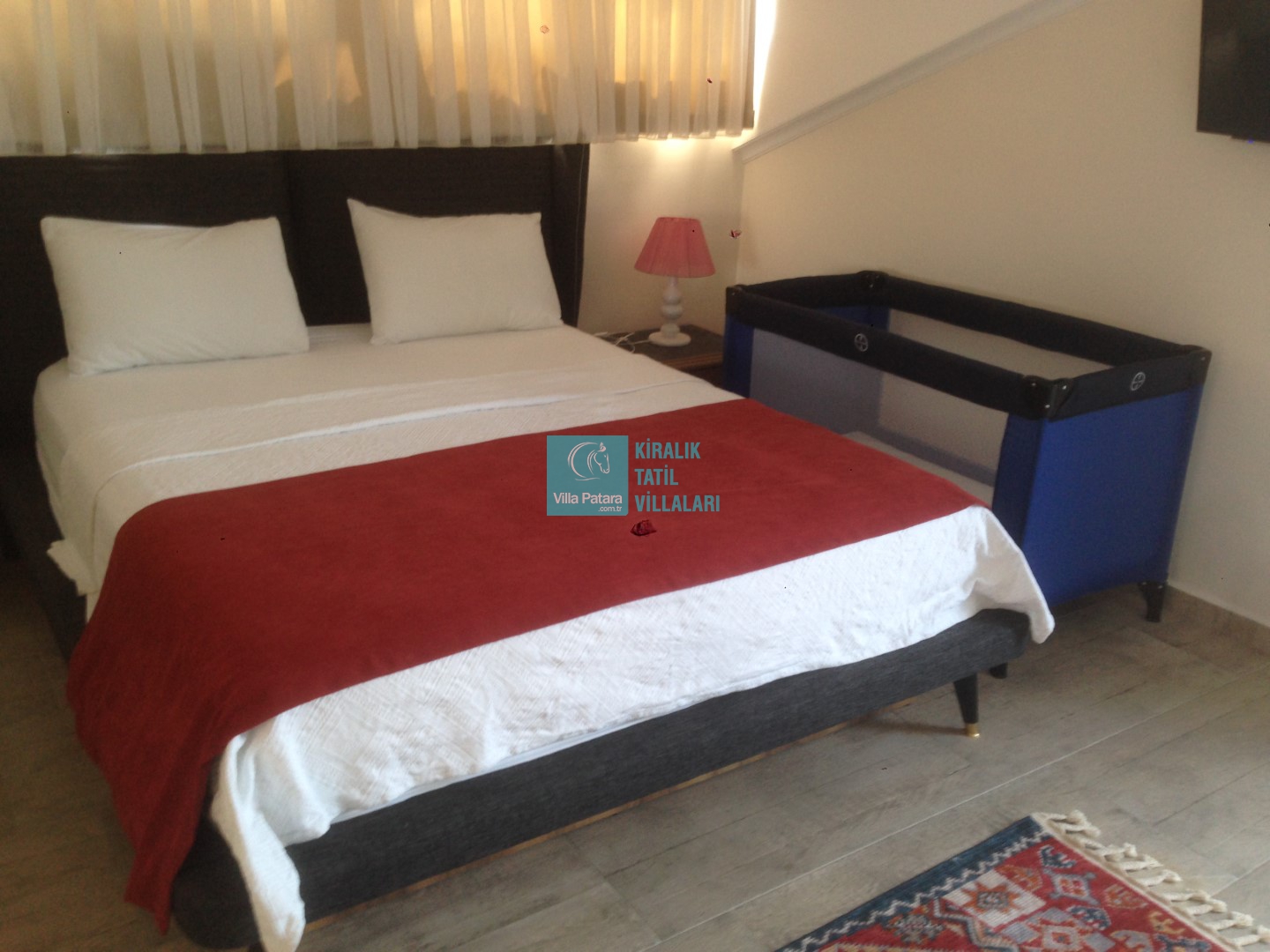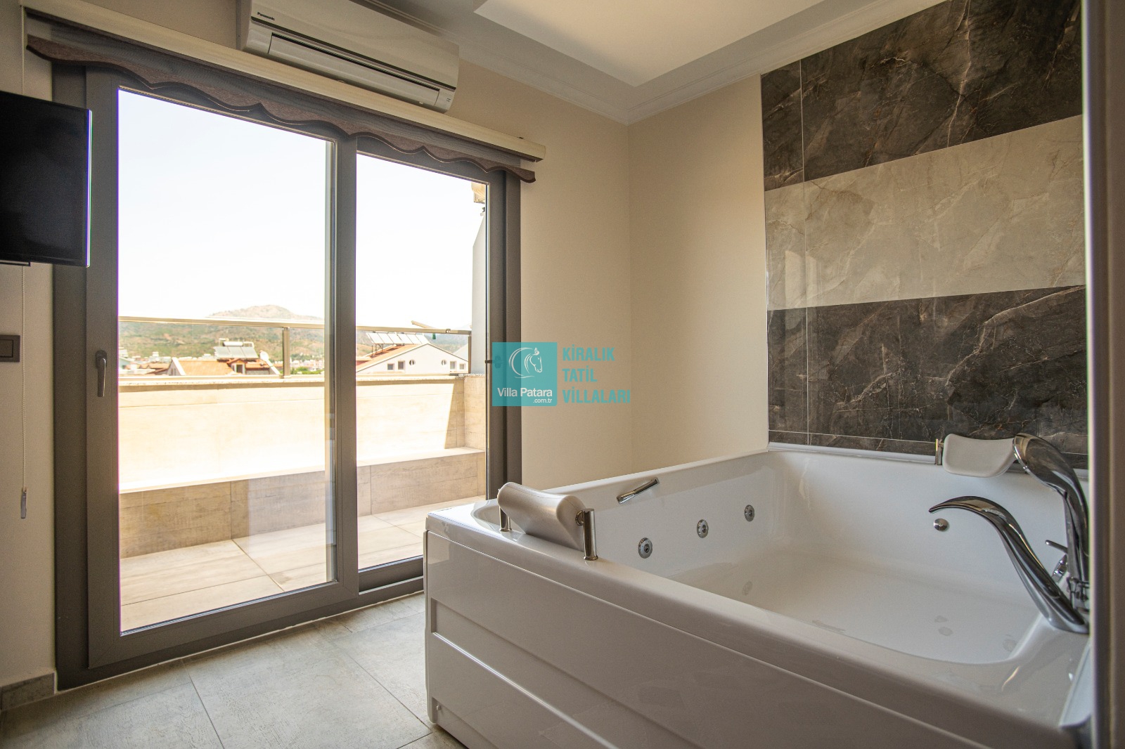 Fethiye merkezde konumlu villa Batı, 3 suit yatak odalı ve 6 kişi kapasitelidir. Ek olarak 2 çocuk konaklamasına da uygundur. 1 yatak odasında jakuzi de bulunan villamızın tüm odalarında banyo tuvalet ve klima bulunmaktadır.