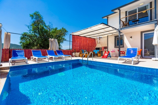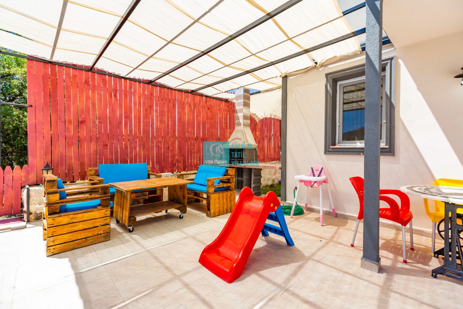Villa Belencik bahçesinde özel yüzme havuzu, şezlong, şemsiye, oturma grubu, mangal, yemek masası bulunmaktadır.