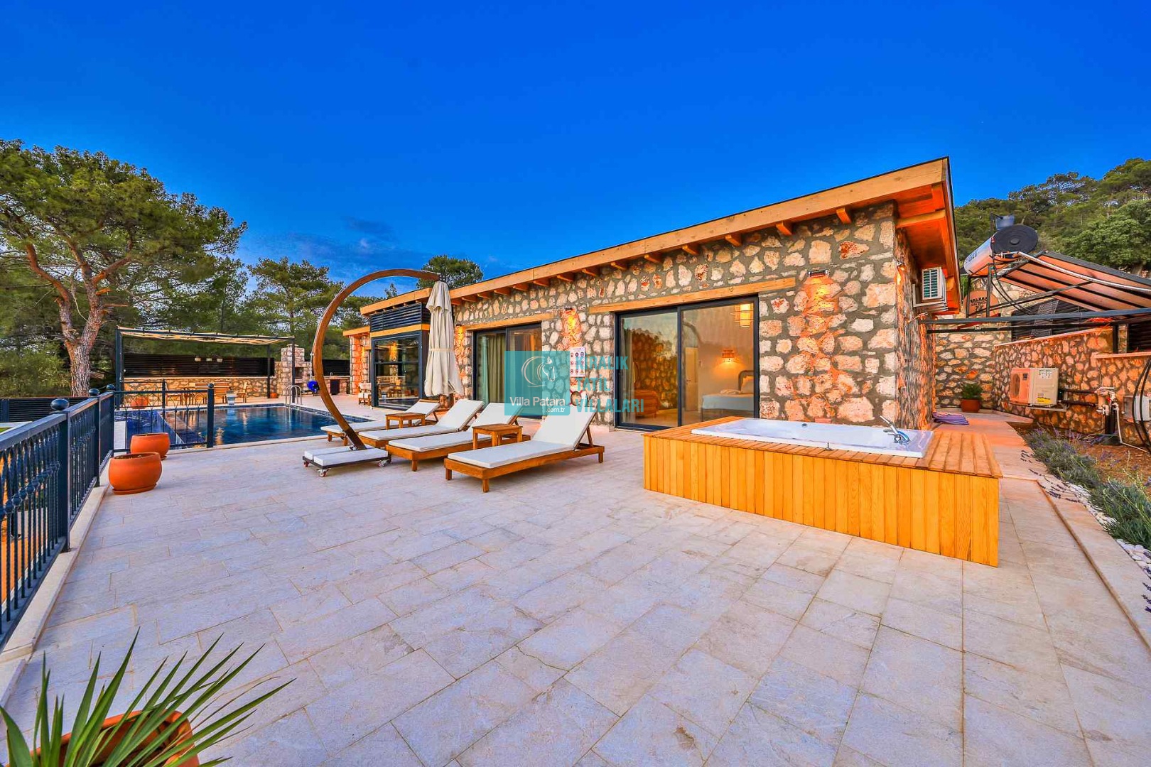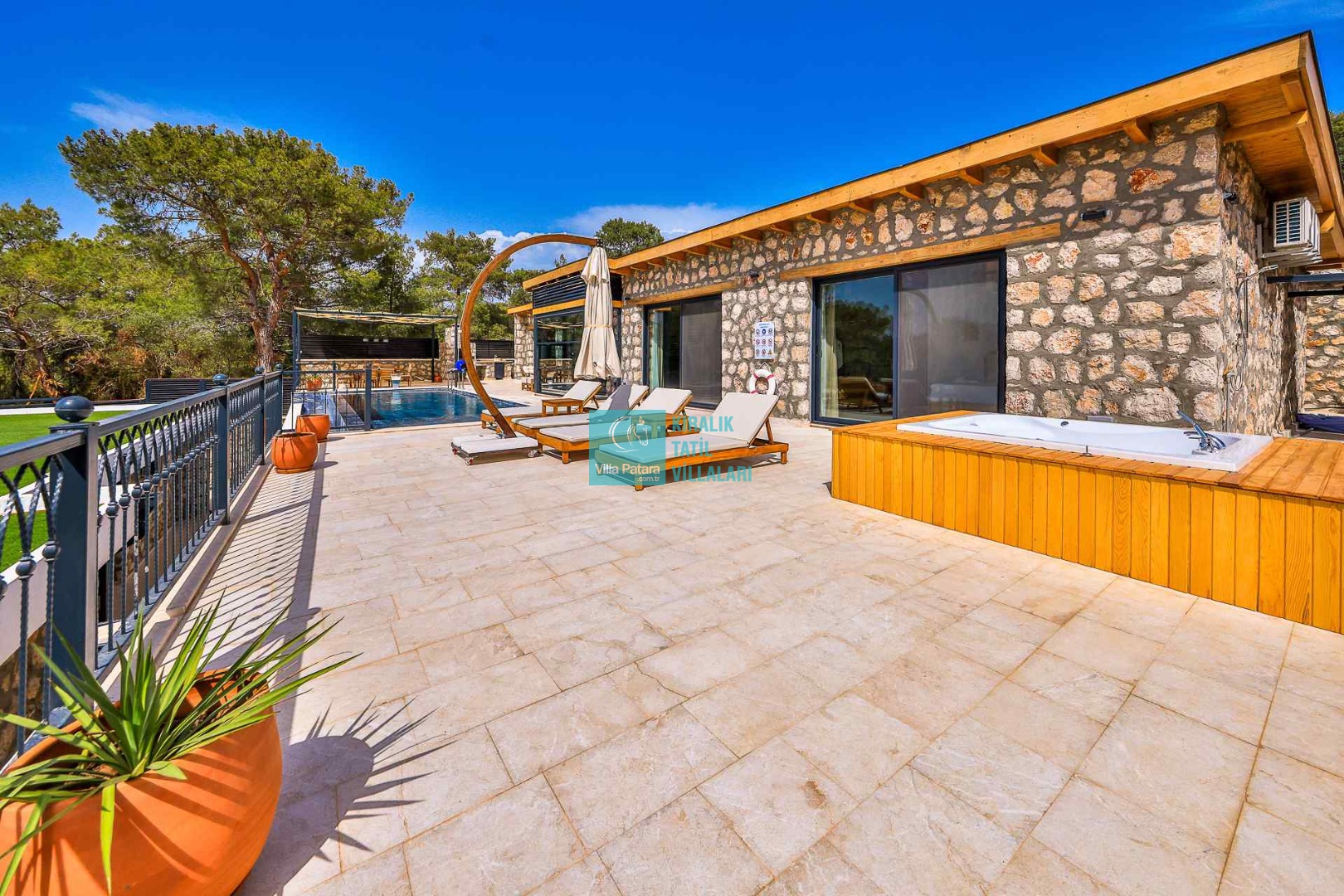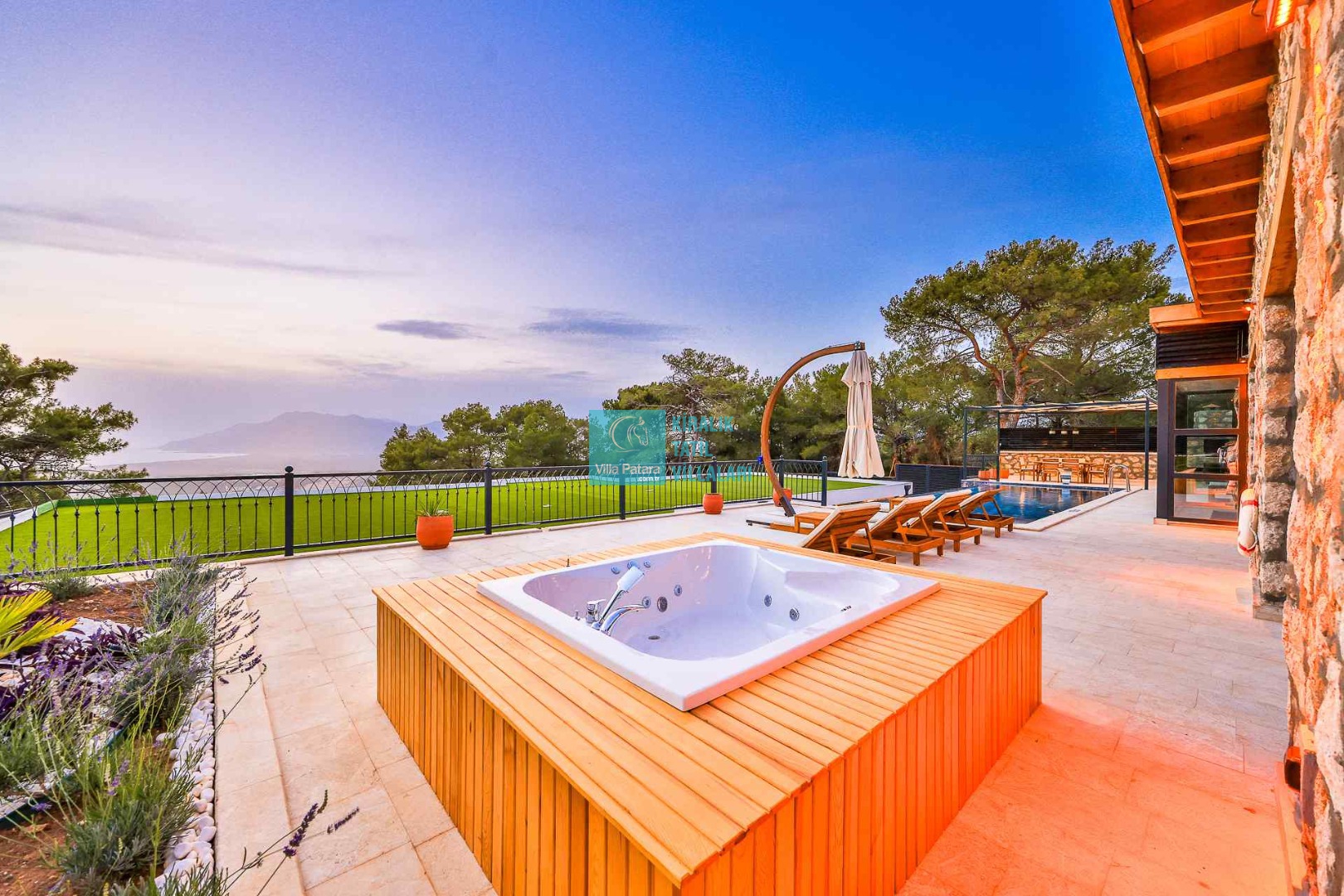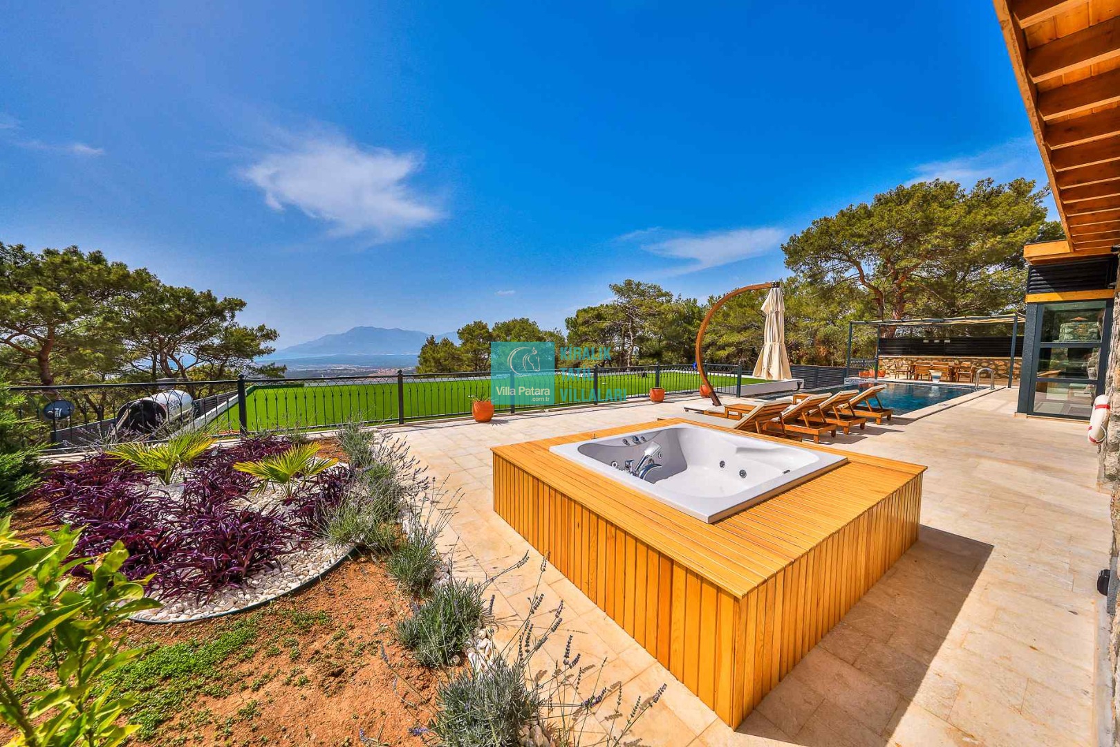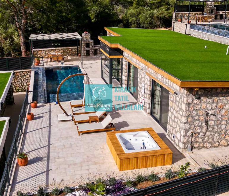 HAVUZ TERASI: Geniş havuz terası ve özel yüzme havuzunun bulunduğu bahçede; muhteşem Patara manzarasına karşı jakuzi, şezlonglar, güneş şemsiyesi,6 kişilik yemek masası, mangal yeri ve salıncak bulunmaktadır.