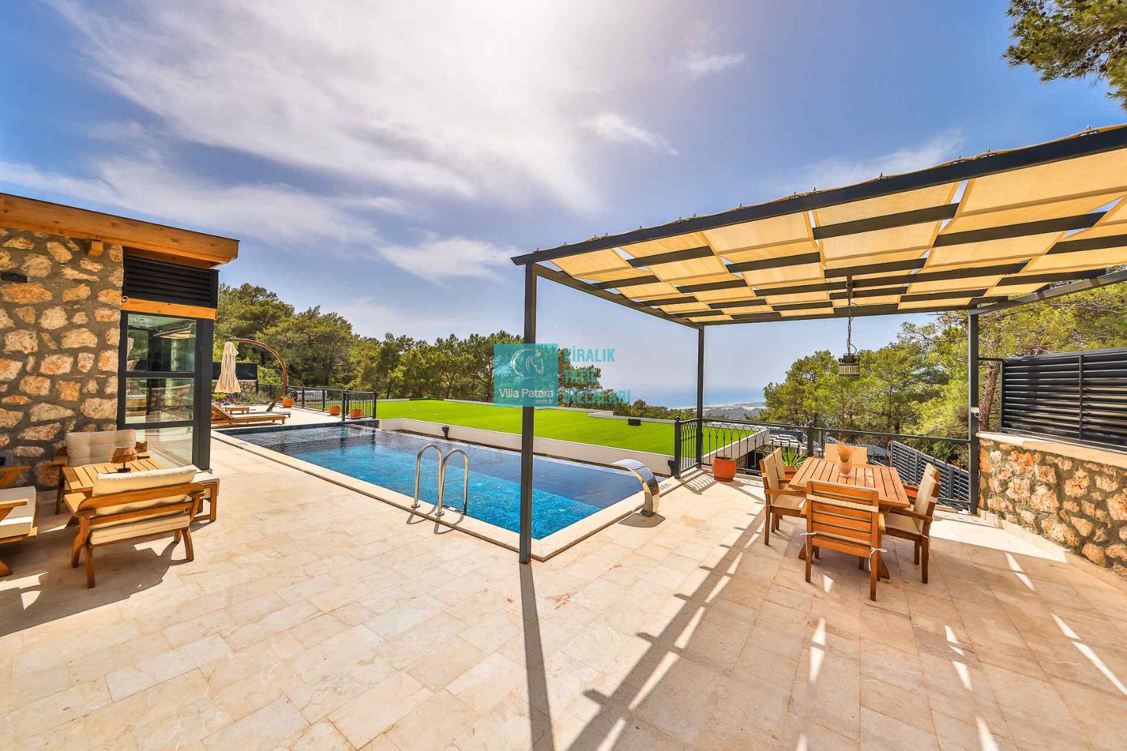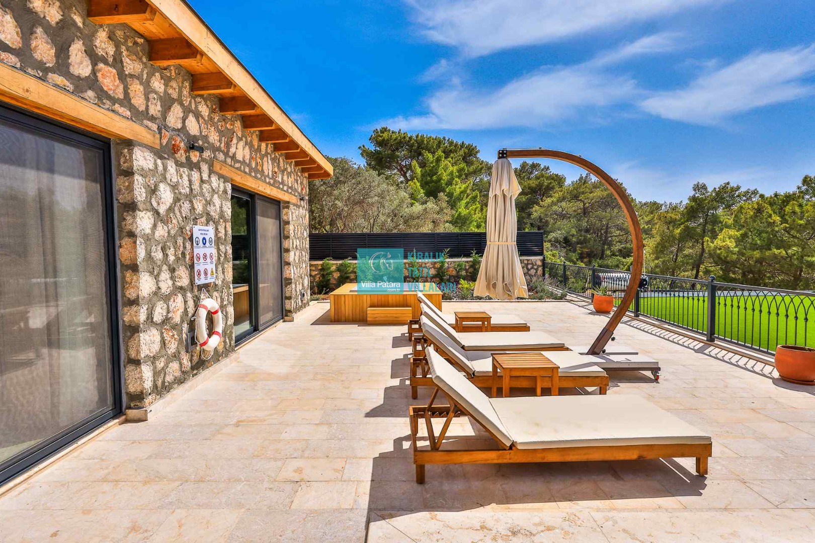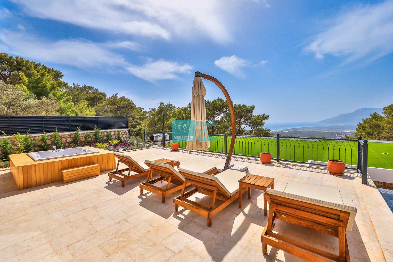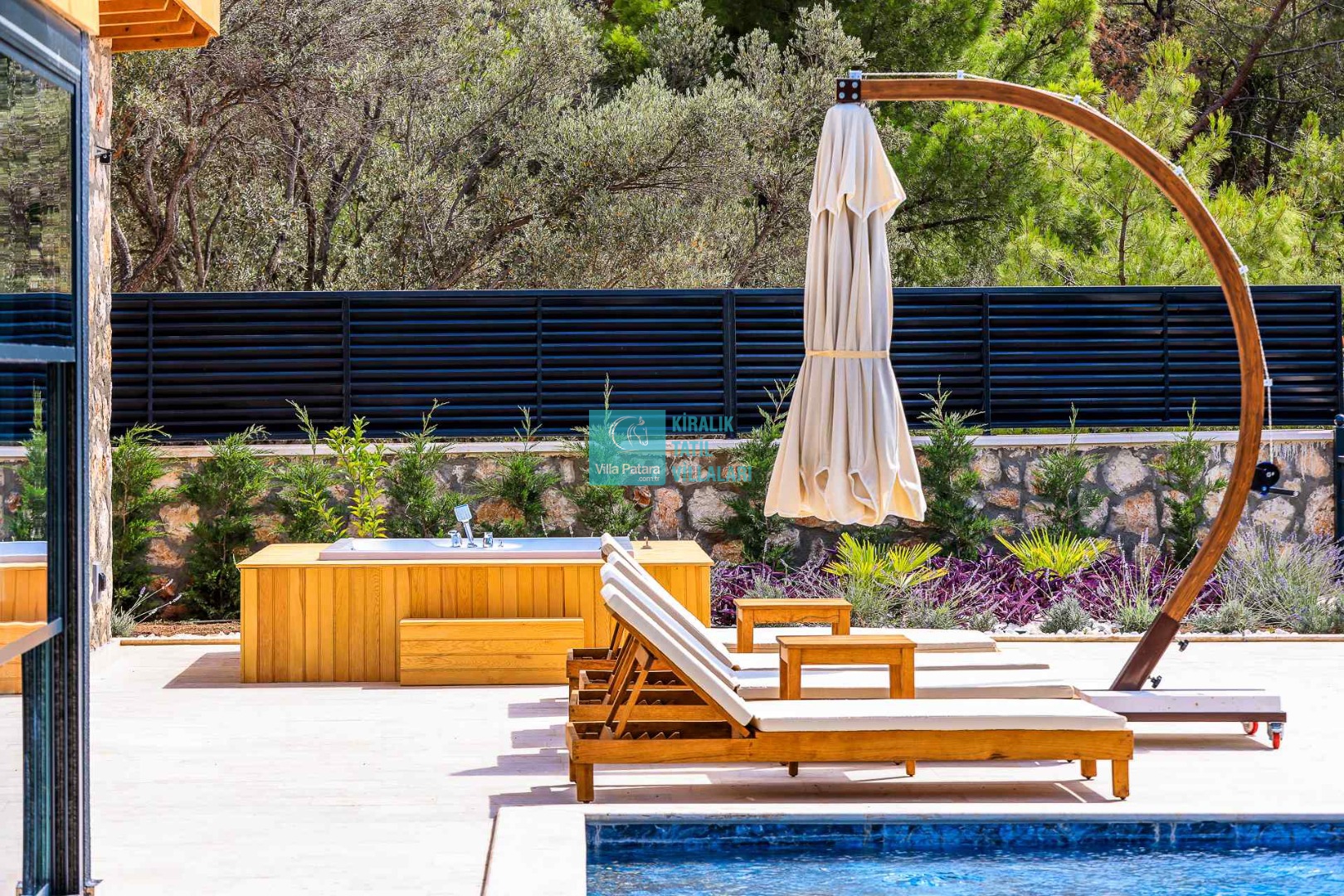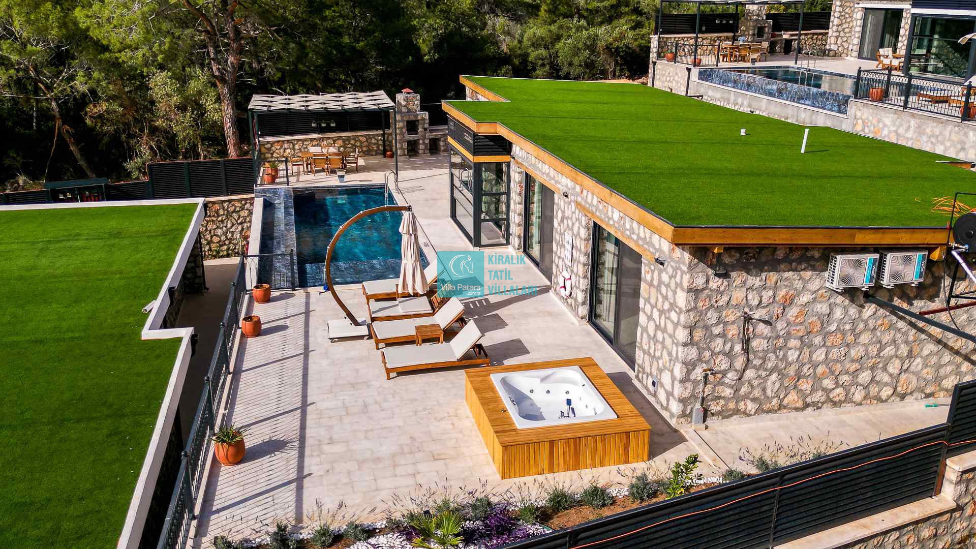 HAVUZ TERASI: Geniş havuz terası ve özel yüzme havuzunun bulunduğu bahçede; muhteşem Patara manzarasına karşı jakuzi, şezlonglar, güneş şemsiyesi,6 kişilik yemek masası, mangal yeri ve salıncak bulunmaktadır.