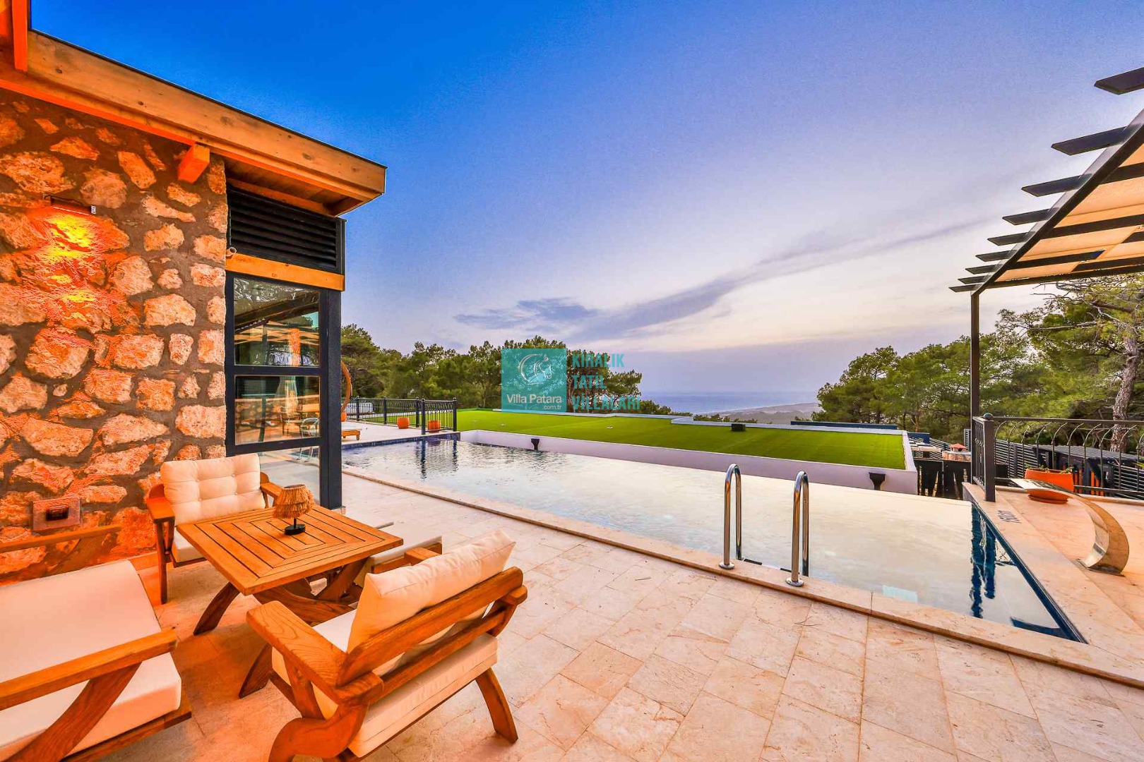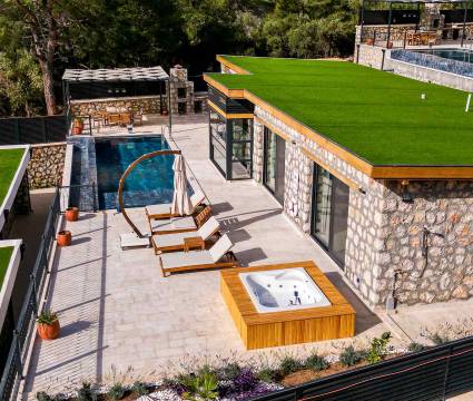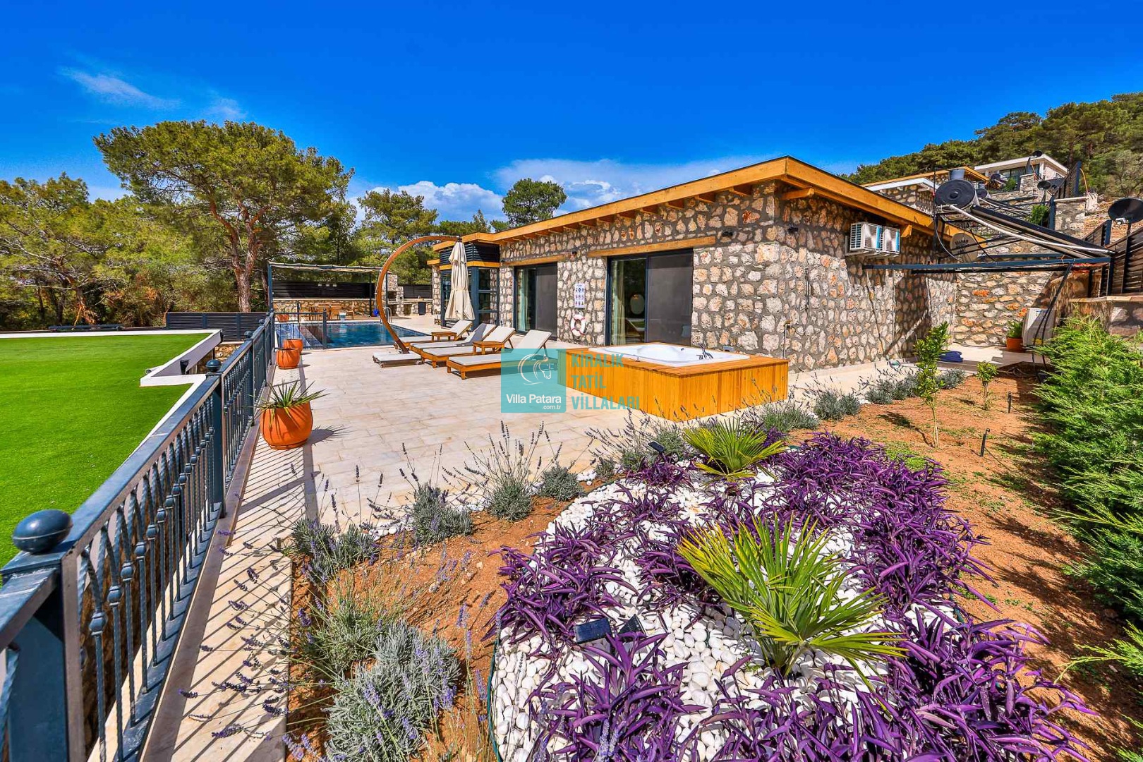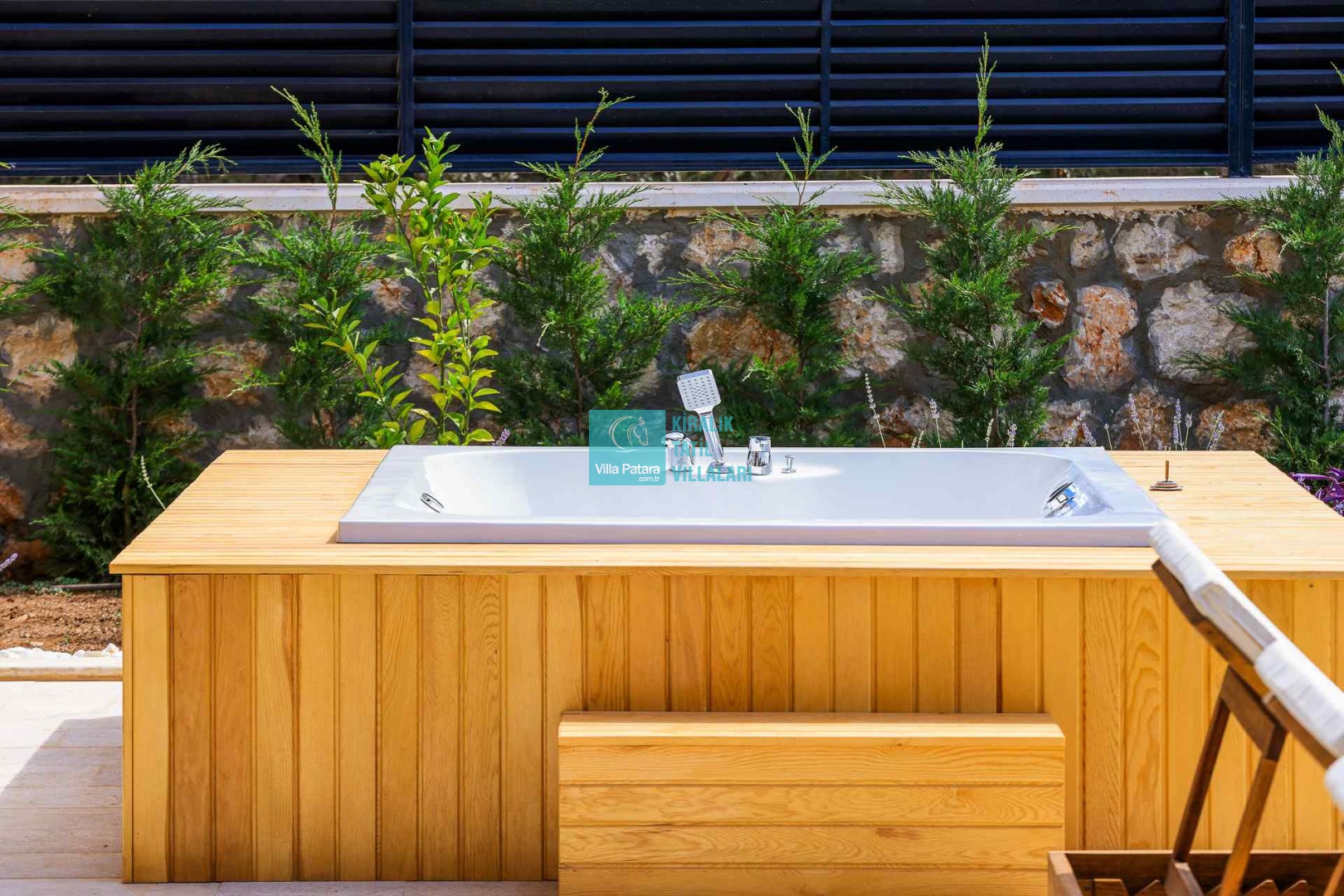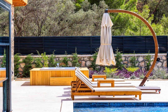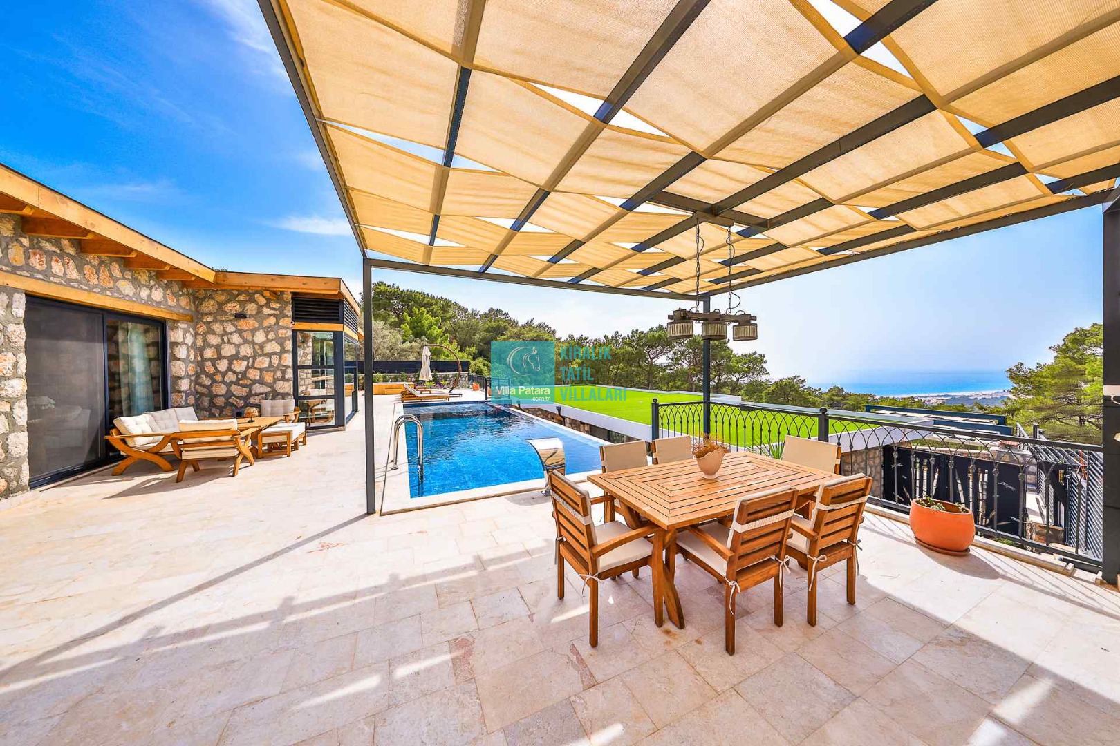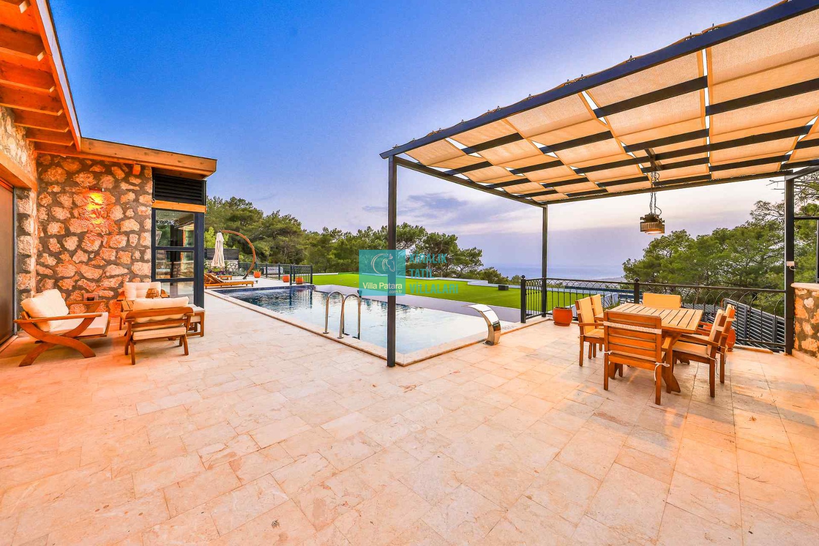 HAVUZ TERASI: Geniş havuz terası ve özel yüzme havuzunun bulunduğu bahçede; muhteşem Patara manzarasına karşı jakuzi, şezlonglar, güneş şemsiyesi,6 kişilik yemek masası, mangal yeri ve salıncak bulunmaktadır.