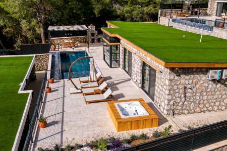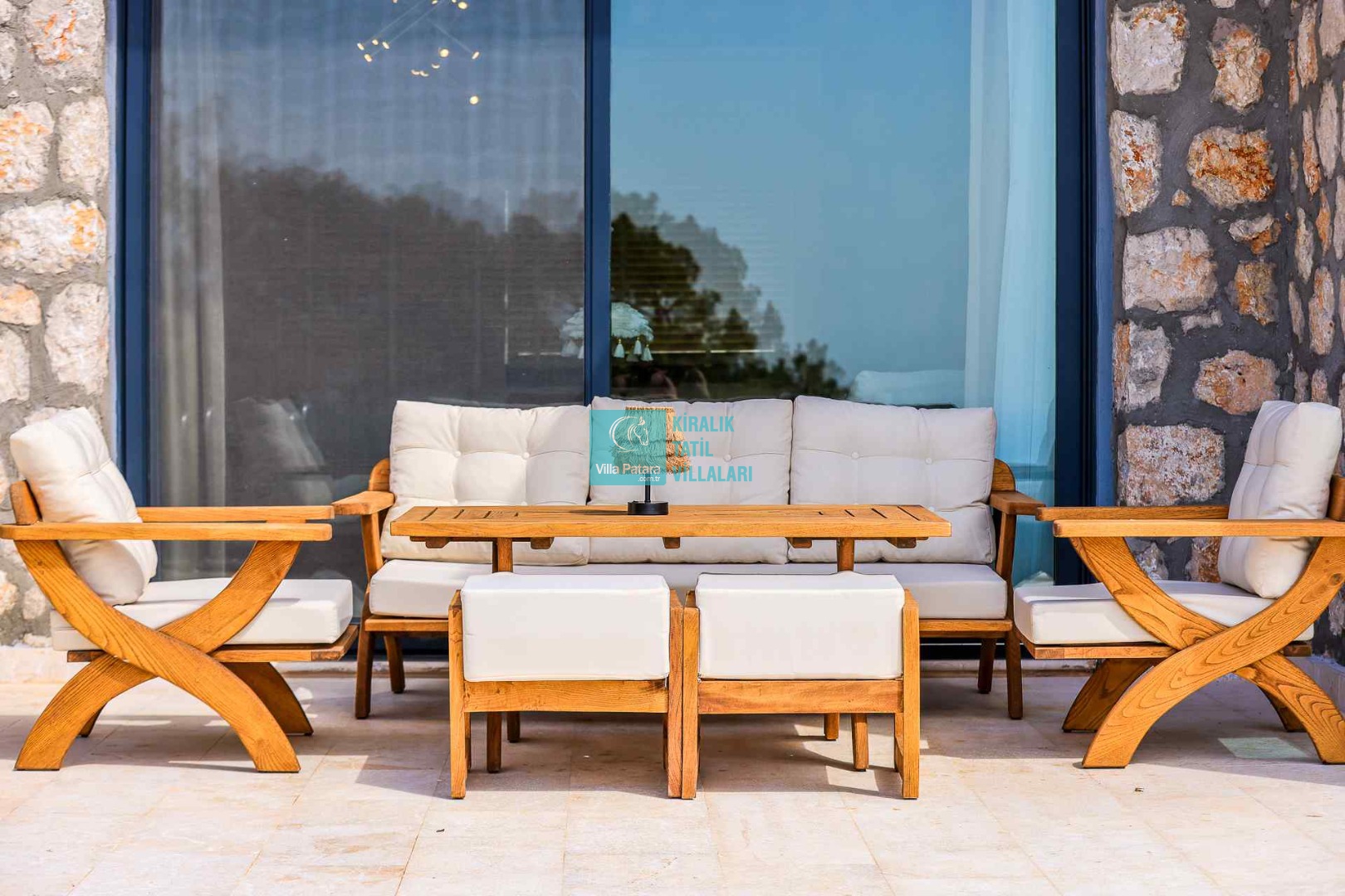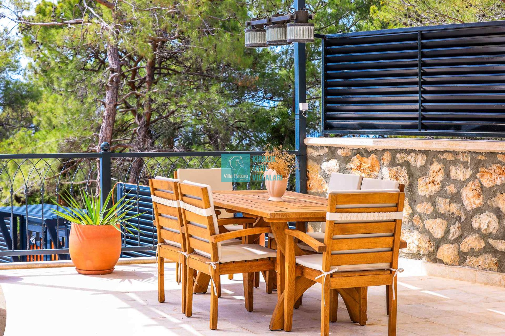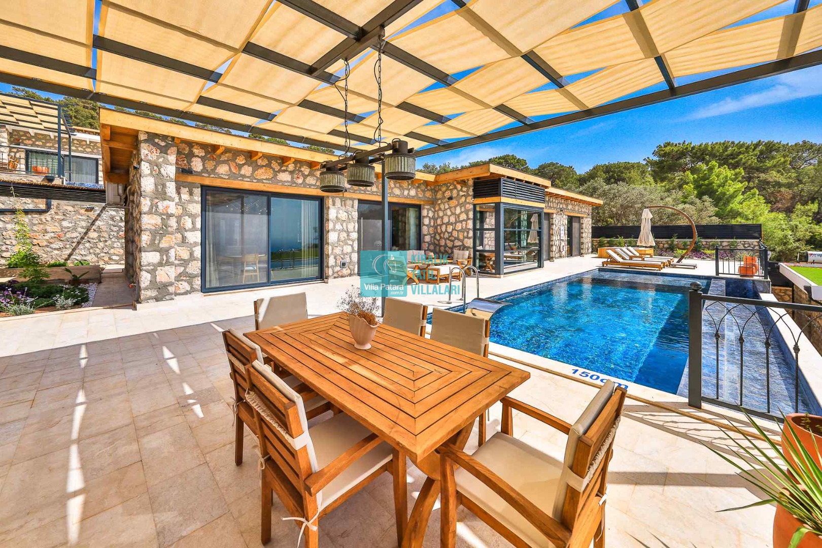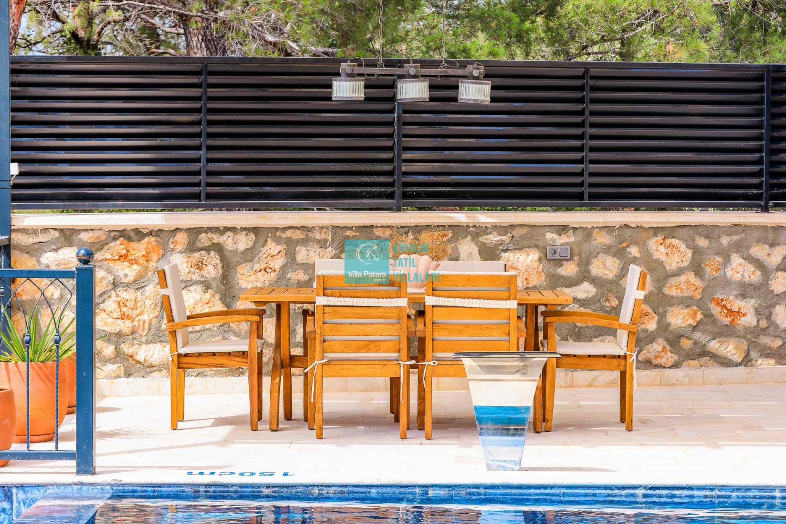 HAVUZ TERASI: Geniş havuz terası ve özel yüzme havuzunun bulunduğu bahçede; muhteşem Patara manzarasına karşı jakuzi, şezlonglar, güneş şemsiyesi,6 kişilik yemek masası, mangal yeri ve salıncak bulunmaktadır.