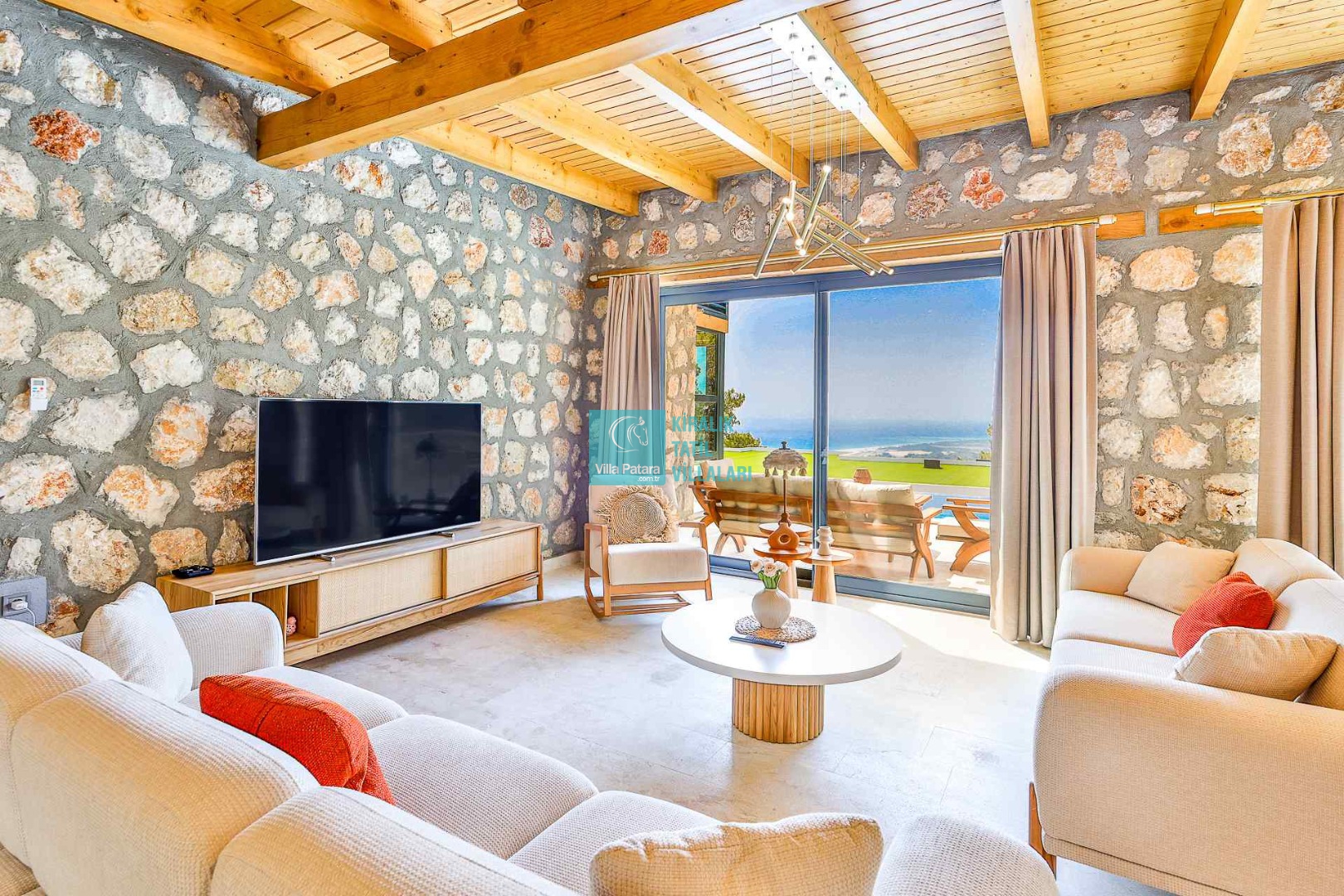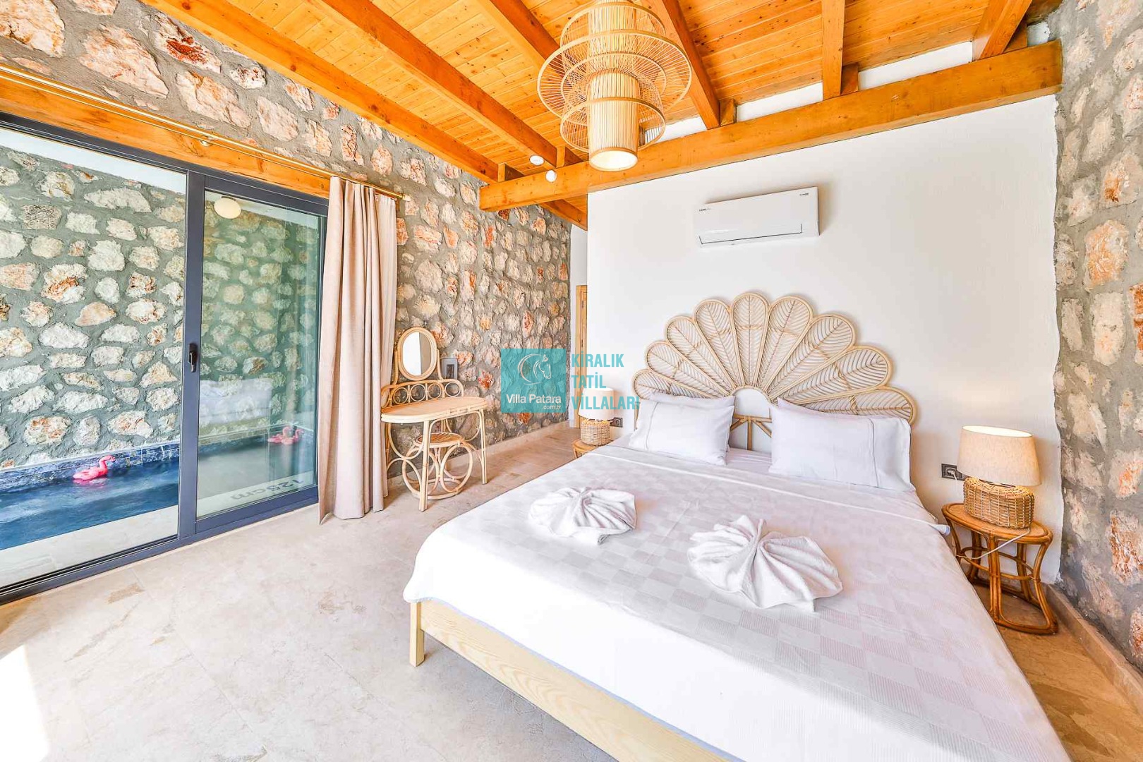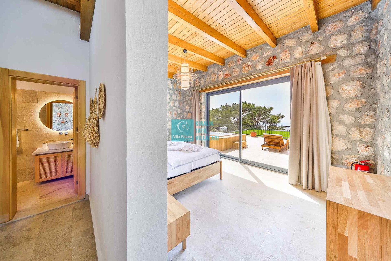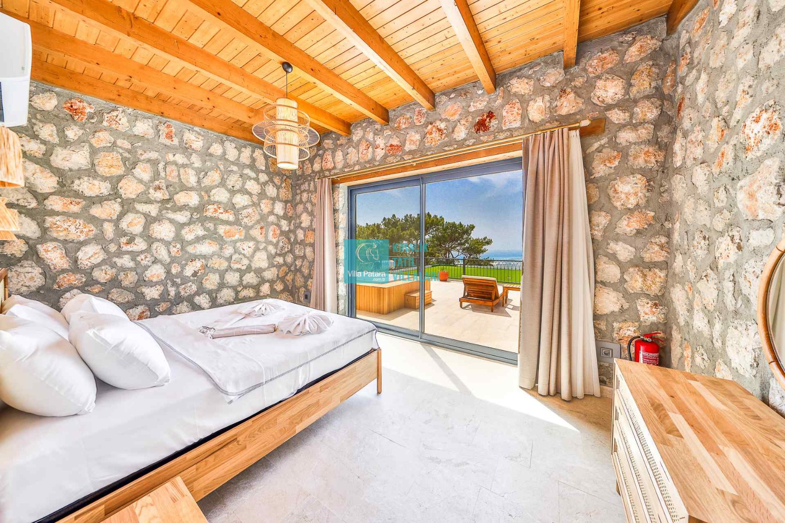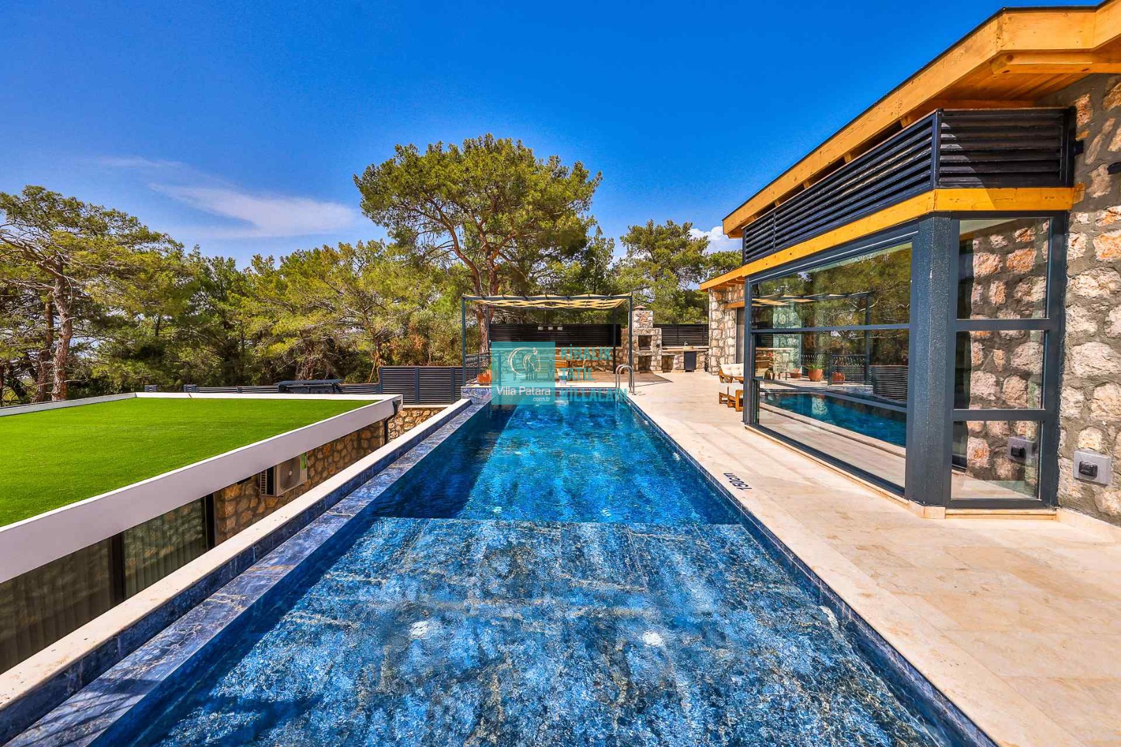 HAVUZ TERASI: Geniş havuz terası ve özel yüzme havuzunun bulunduğu bahçede; muhteşem Patara manzarasına karşı jakuzi, şezlonglar, güneş şemsiyesi,6 kişilik yemek masası, mangal yeri ve salıncak bulunmaktadır.