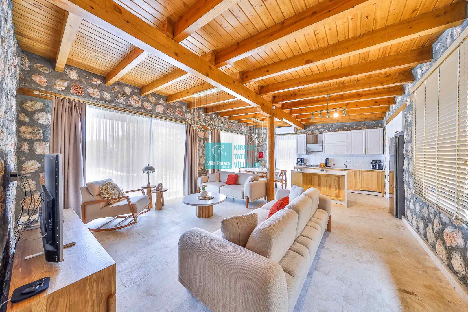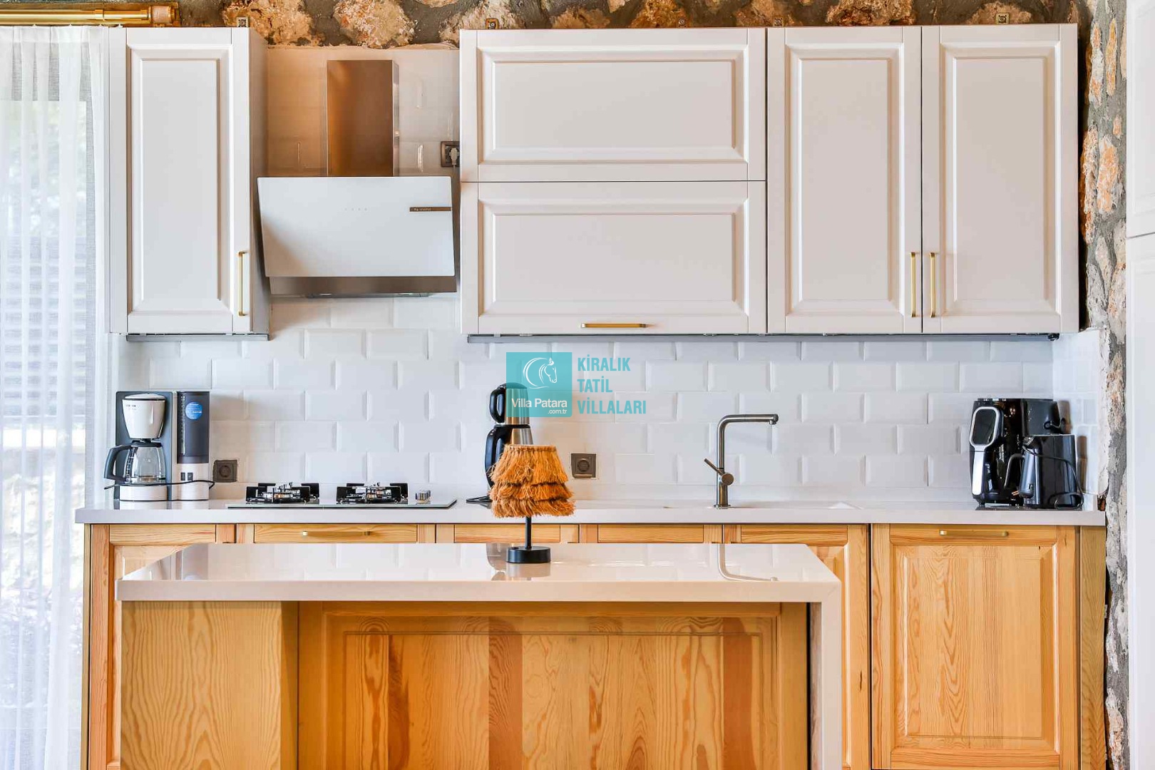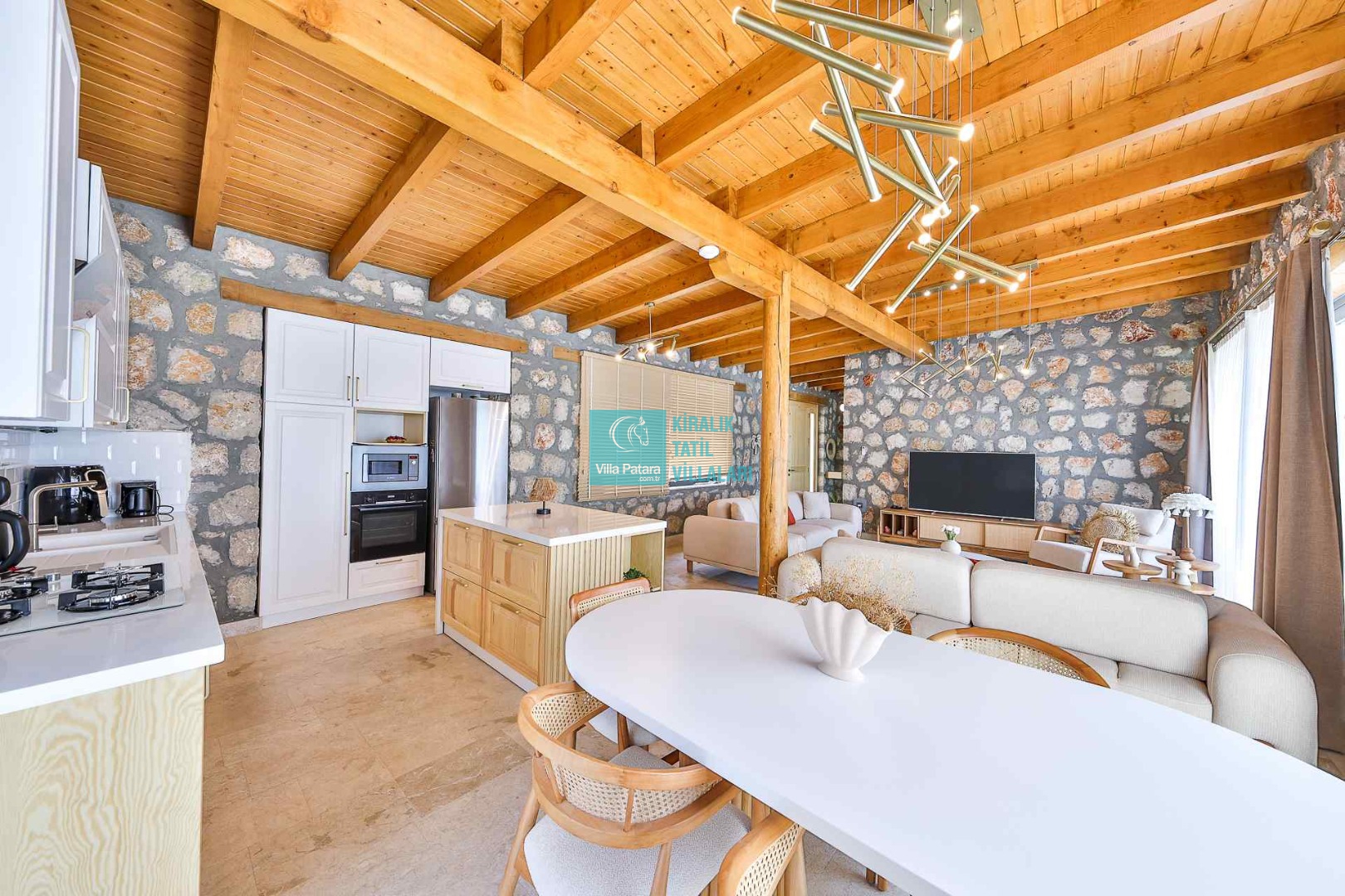 MUTFAK: Modern Amerikan mutfağa sahip olan villada; buzdolabı, bulaşık makinesi, çamaşır makinesi, ankastre fırın, mikrodalga fırın, ankastre 4’lü ocak, filtre kahve ve Türk kahve makineleri, portakal sıkacağı, soğuk su sebili, tost makinesi, 6 kişilik yemek masası, yemek takımı, tava, tencereler, çatal, bıçak vs. gibi ihtiyacınız olan bütün detaylar düşünülmüştür.