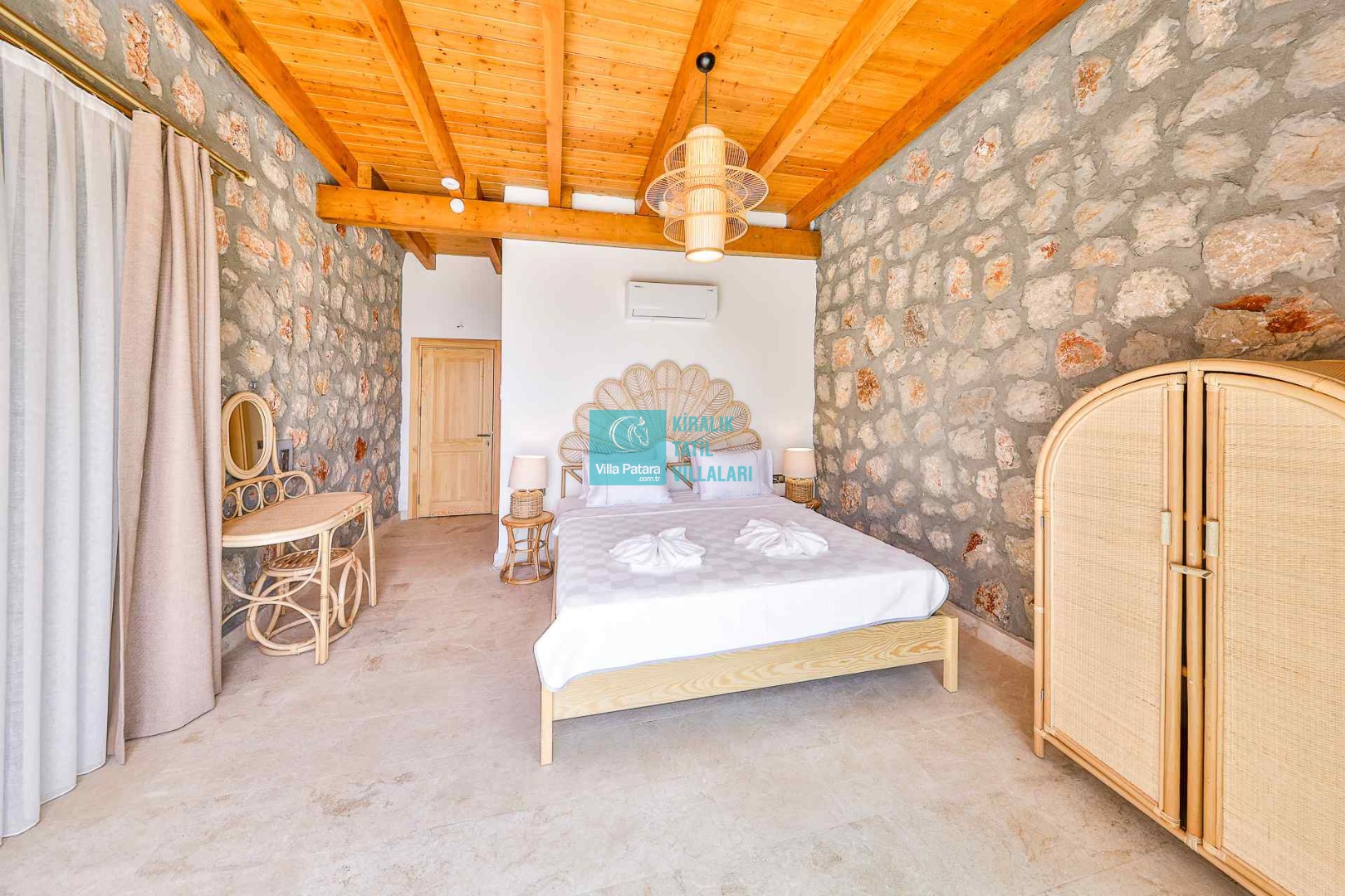 YATAK ODASI 1: Ebeveyn banyolu aile yatak odası; 1 adet çift kişilik yatak, klima, komodin, giyinme odası ve elbise dolabı, makyaj masası bulunmaktadır.