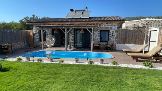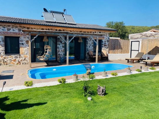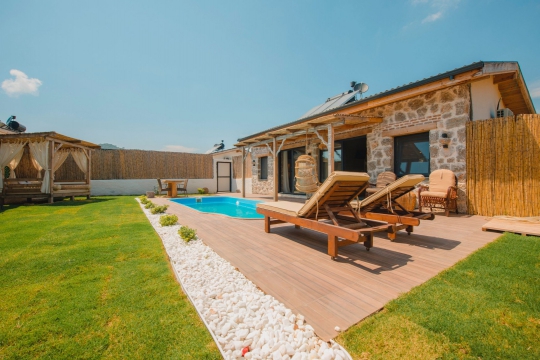 Fethiye Kayaköy mevkiinde bulunan villa, 1 yatak odasıyla 2 kişilik konaklama kapasitesi sunmaktadır. Balayı çiftleri tarafından tercih edilen villa, havuz alanı korunaklı bir yapıya sahiptir. Çam ağaçlarıyla çevrelenmiş, Kayaköy'ün eşsiz doğasına sırtını yaslamış; doğa içinde dingin konumu ve yemyeşil geniş bahçesiyle sakin ve huzurlu bir tatil arayan misafirlerimiz için oldukça uygun olan villa, sizlere Kayaköy'ün büyülü tarihinde kısa bir mola vaadetmektedir. Bu bağlamdan esinlenerek dizayn edilmiş bahçe alanı geniş havuz terasında sahiptir; yine havuz terasında kapasiteye uygun şezlong takımı, konforlu oturma grubu ve barbekü bulunmaktadır. Konforunuz gözetilerek tasarlanmış olan muhafazakar havuz alanına açılan ferah, oturma odası, tam donanımlı açık mutfak; yatak odasında çift kişilik yatak, ebeveyn banyosu bulunmaktadır. Villa, ihtiyaçlarınıza tam karşılık verecek donanıma sahiptir.
