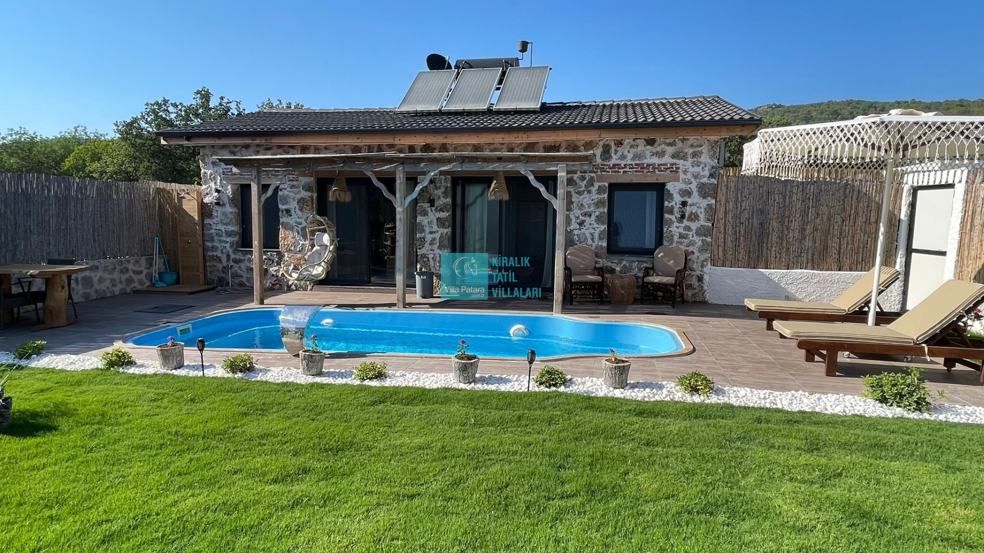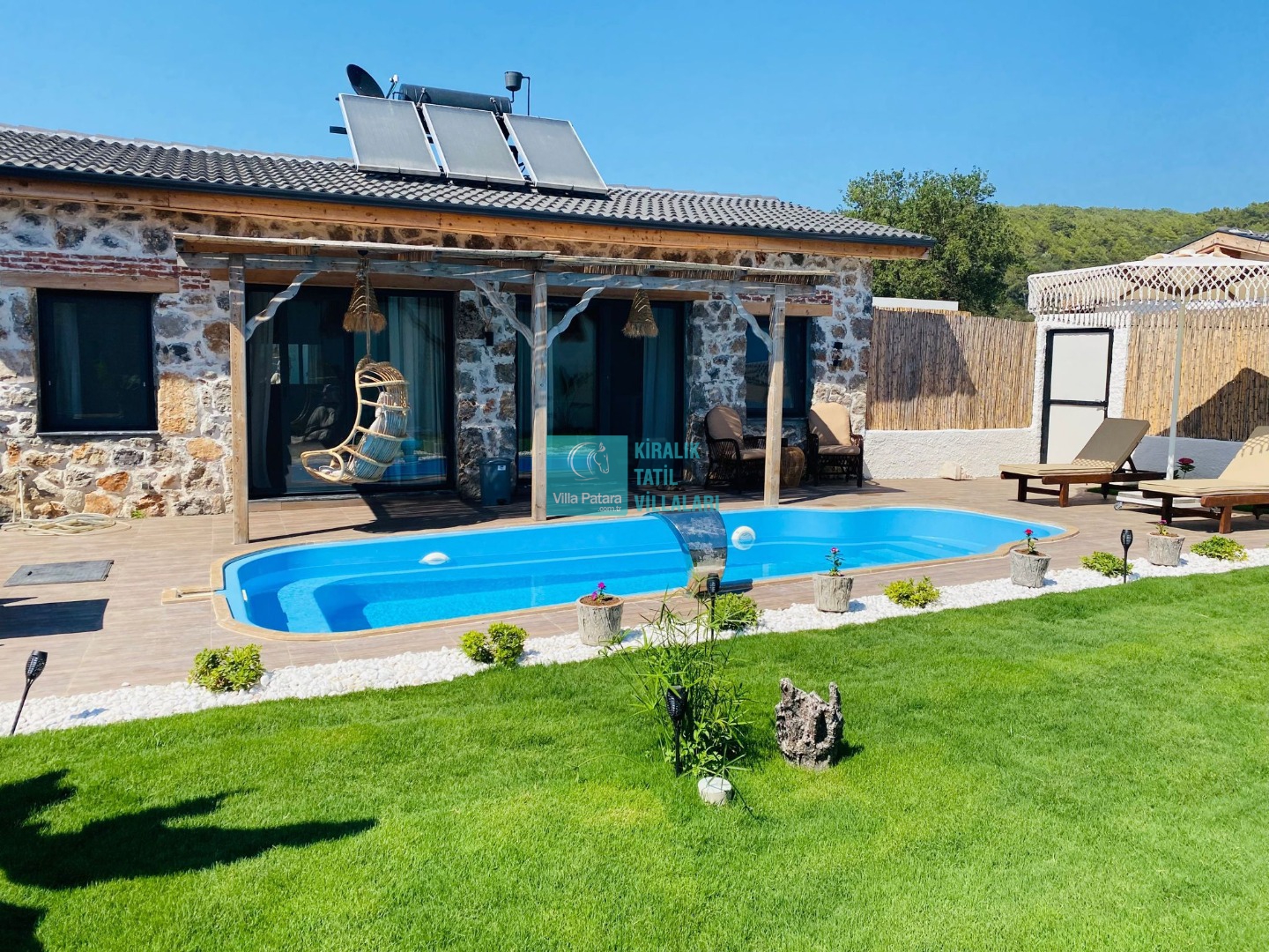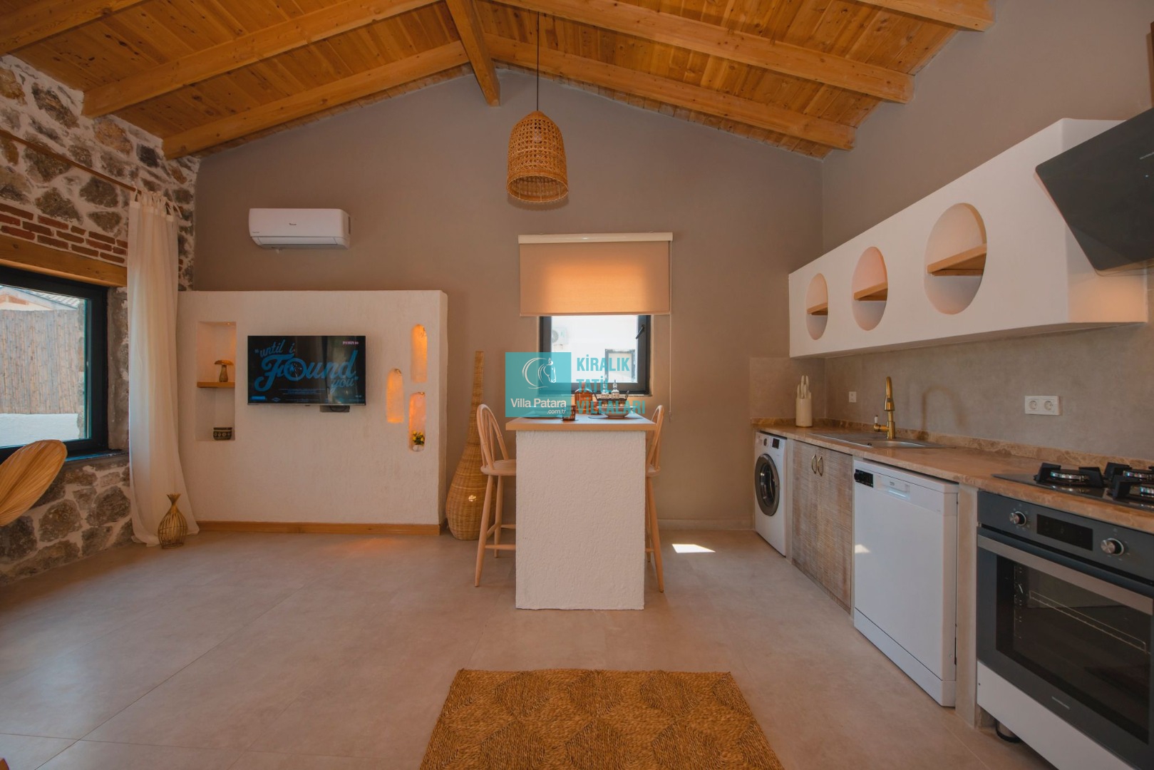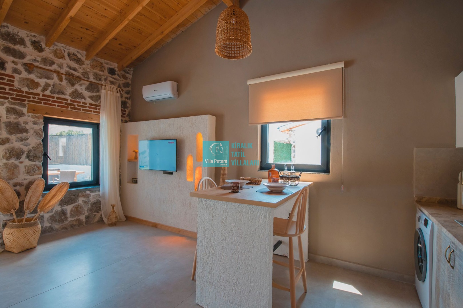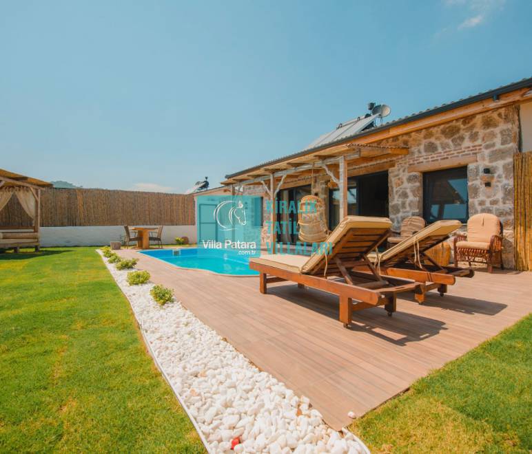 Fethiye Kayaköy mevkiinde bulunan villa, 1 yatak odasıyla 2 kişilik konaklama kapasitesi sunmaktadır. Balayı çiftleri tarafından tercih edilen villa, havuz alanı korunaklı bir yapıya sahiptir. Çam ağaçlarıyla çevrelenmiş, Kayaköy'ün eşsiz doğasına sırtını yaslamış; doğa içinde dingin konumu ve yemyeşil geniş bahçesiyle sakin ve huzurlu bir tatil arayan misafirlerimiz için oldukça uygun olan villa, sizlere Kayaköy'ün büyülü tarihinde kısa bir mola vaadetmektedir. Bu bağlamdan esinlenerek dizayn edilmiş bahçe alanı geniş havuz terasında sahiptir; yine havuz terasında kapasiteye uygun şezlong takımı, konforlu oturma grubu ve barbekü bulunmaktadır. Konforunuz gözetilerek tasarlanmış olan muhafazakar havuz alanına açılan ferah, oturma odası, tam donanımlı açık mutfak; yatak odasında çift kişilik yatak, ebeveyn banyosu bulunmaktadır. Villa, ihtiyaçlarınıza tam karşılık verecek donanıma sahiptir.