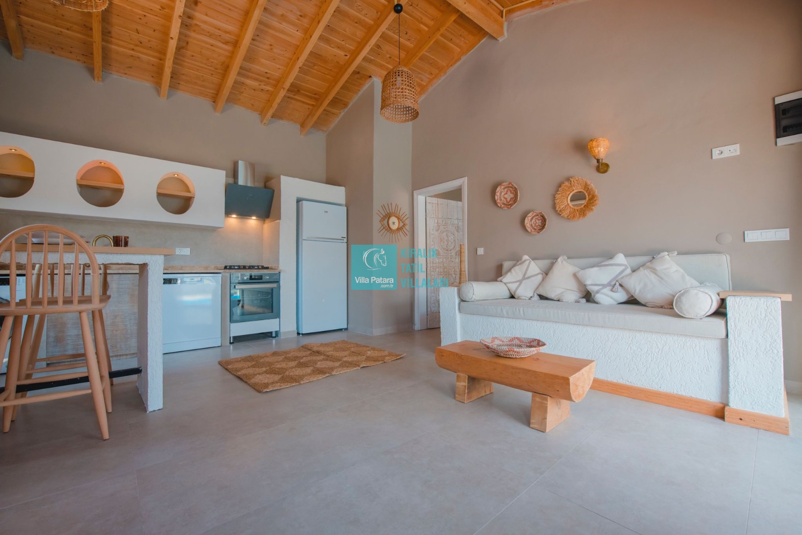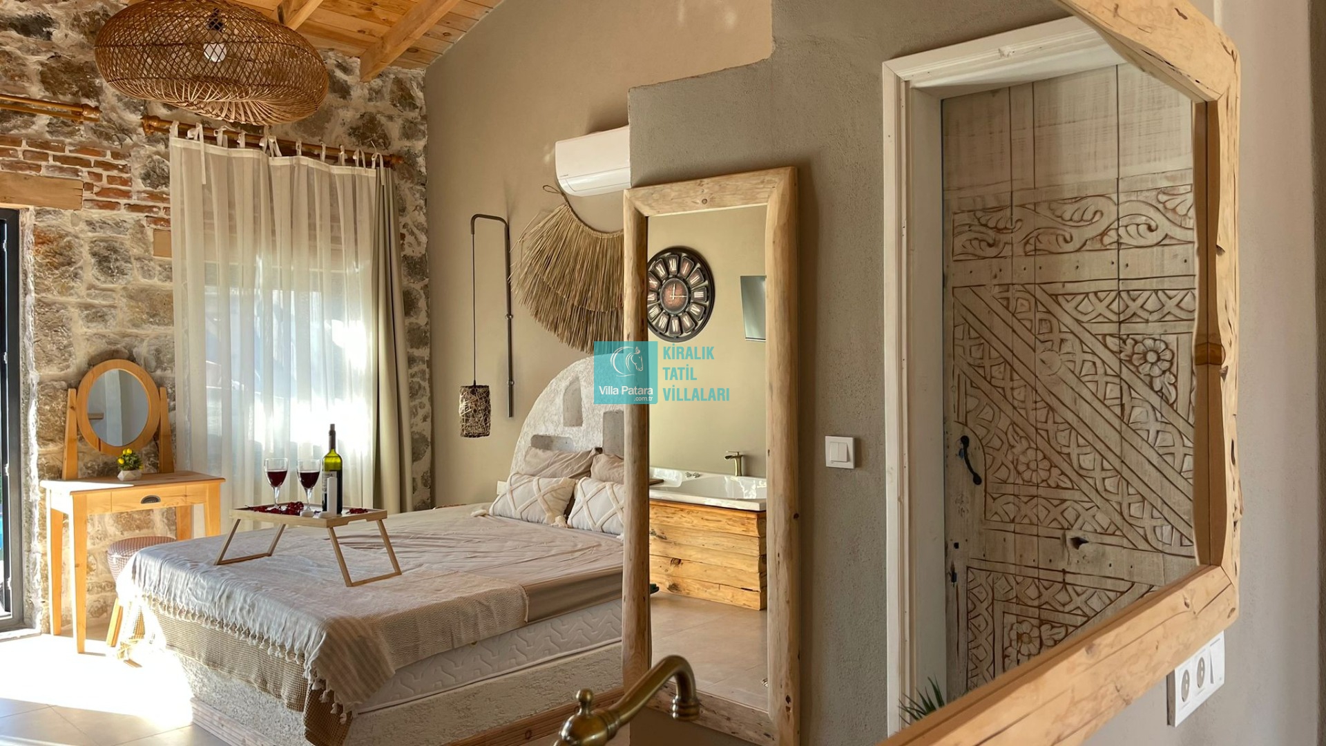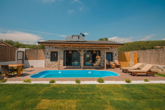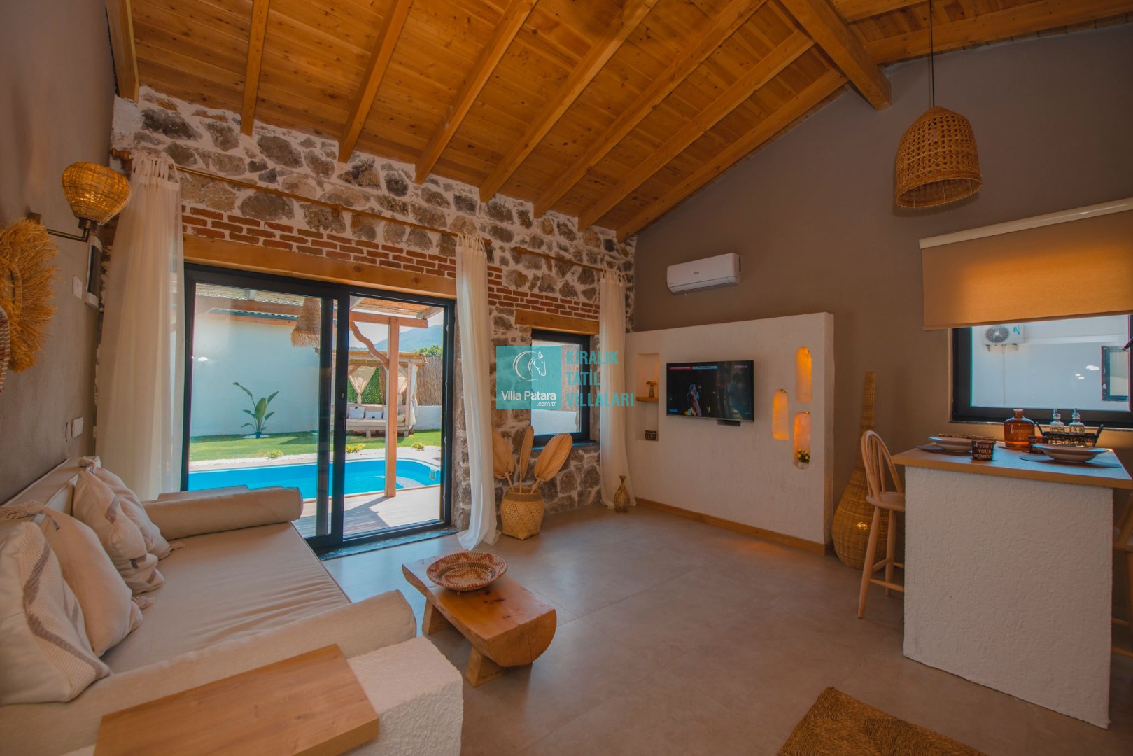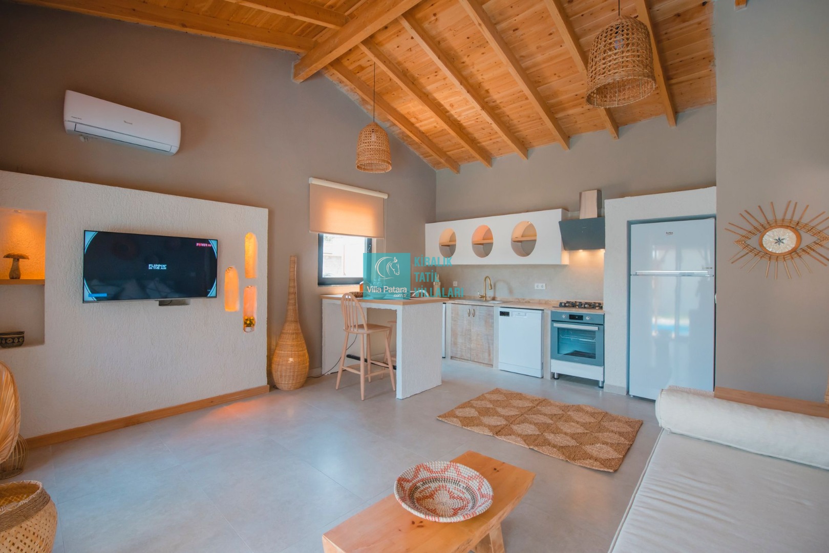 Fethiye Kayaköy mevkiinde bulunan villa, 1 yatak odasıyla 2 kişilik konaklama kapasitesi sunmaktadır. Balayı çiftleri tarafından tercih edilen villa, havuz alanı korunaklı bir yapıya sahiptir. Çam ağaçlarıyla çevrelenmiş, Kayaköy'ün eşsiz doğasına sırtını yaslamış; doğa içinde dingin konumu ve yemyeşil geniş bahçesiyle sakin ve huzurlu bir tatil arayan misafirlerimiz için oldukça uygun olan villa, sizlere Kayaköy'ün büyülü tarihinde kısa bir mola vaadetmektedir. Bu bağlamdan esinlenerek dizayn edilmiş bahçe alanı geniş havuz terasında sahiptir; yine havuz terasında kapasiteye uygun şezlong takımı, konforlu oturma grubu ve barbekü bulunmaktadır. Konforunuz gözetilerek tasarlanmış olan muhafazakar havuz alanına açılan ferah, oturma odası, tam donanımlı açık mutfak; yatak odasında çift kişilik yatak, ebeveyn banyosu bulunmaktadır. Villa, ihtiyaçlarınıza tam karşılık verecek donanıma sahiptir.