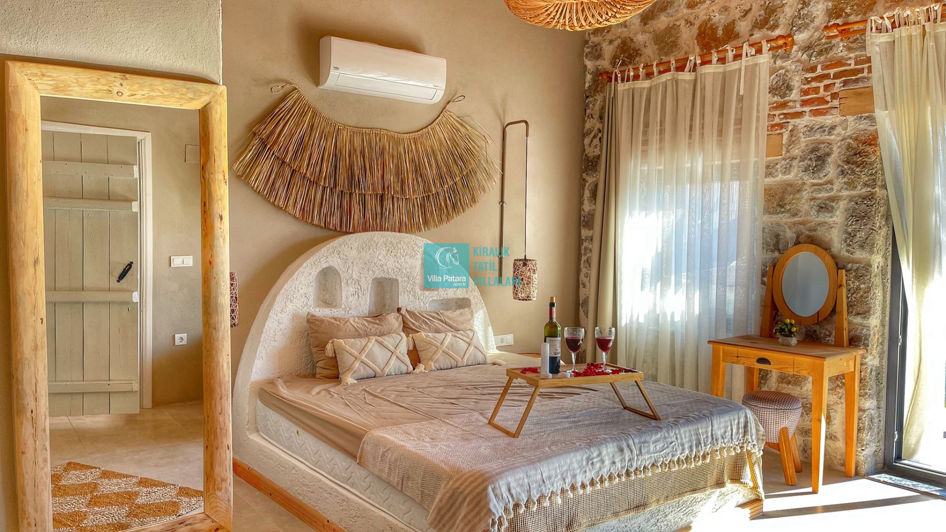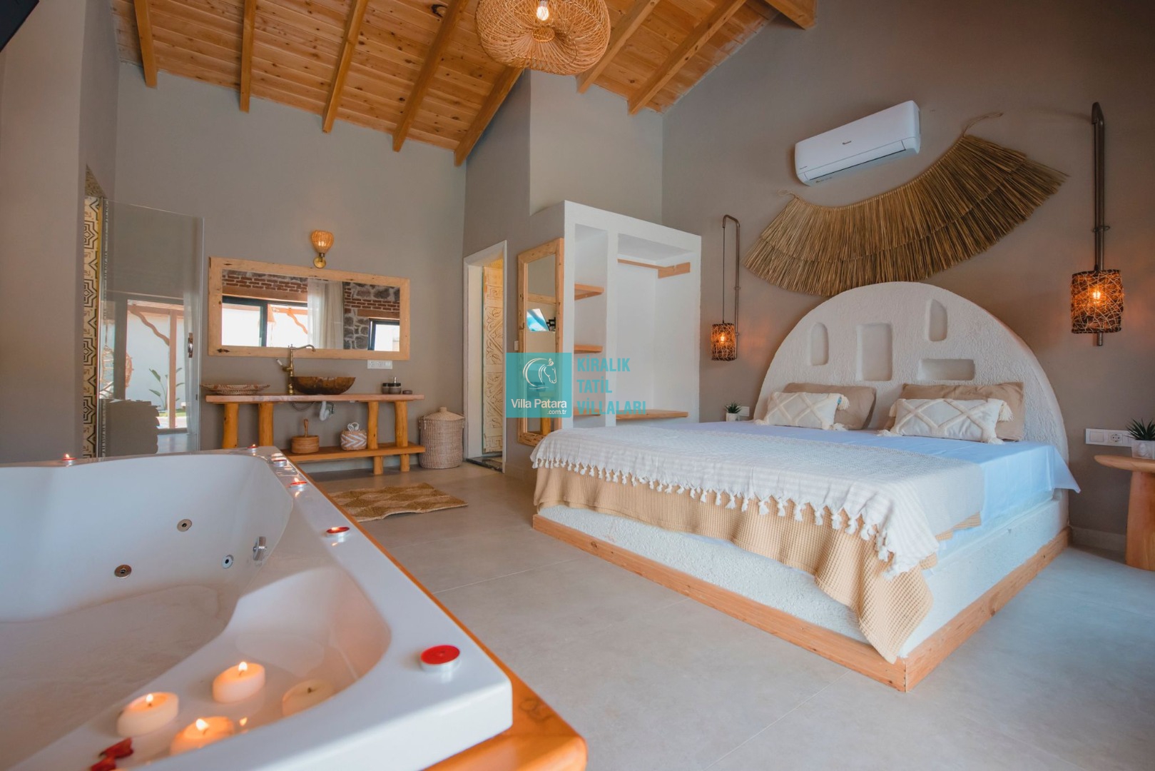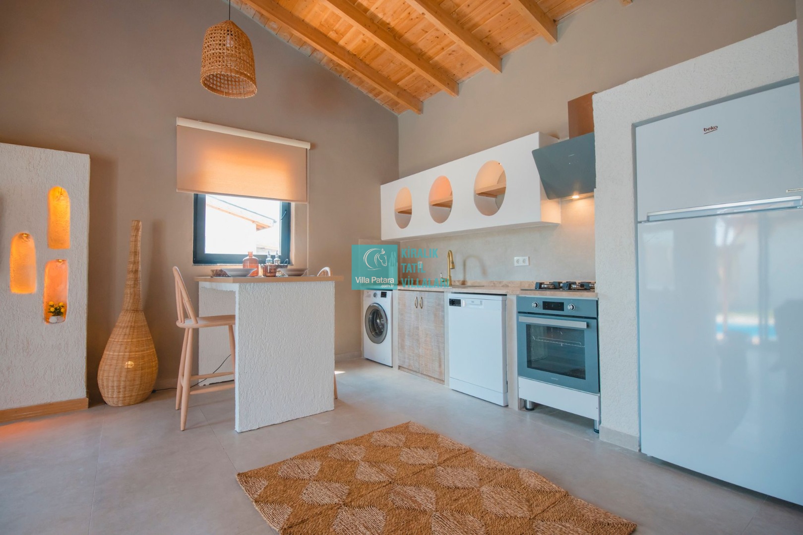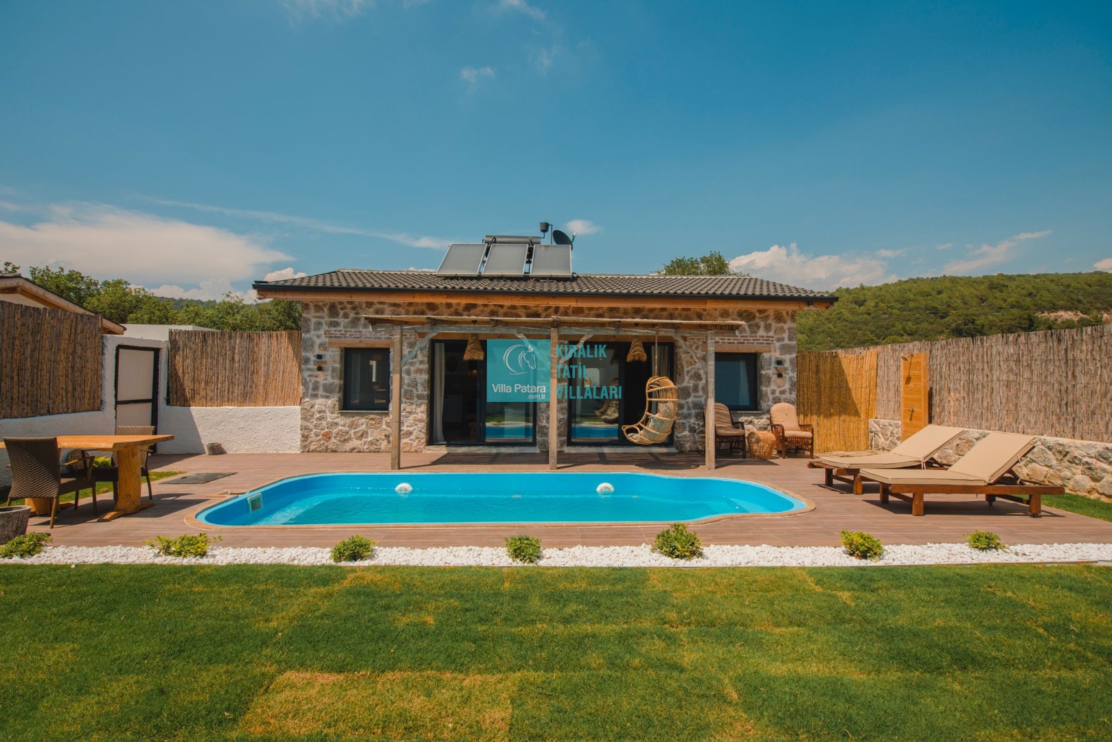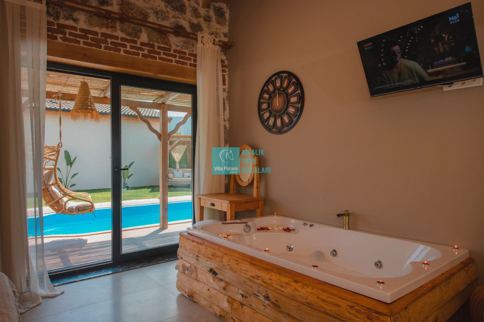 Fethiye Kayaköy mevkiinde bulunan villa, 1 yatak odasıyla 2 kişilik konaklama kapasitesi sunmaktadır. Balayı çiftleri tarafından tercih edilen villa, havuz alanı korunaklı bir yapıya sahiptir. Çam ağaçlarıyla çevrelenmiş, Kayaköy'ün eşsiz doğasına sırtını yaslamış; doğa içinde dingin konumu ve yemyeşil geniş bahçesiyle sakin ve huzurlu bir tatil arayan misafirlerimiz için oldukça uygun olan villa, sizlere Kayaköy'ün büyülü tarihinde kısa bir mola vaadetmektedir. Bu bağlamdan esinlenerek dizayn edilmiş bahçe alanı geniş havuz terasında sahiptir; yine havuz terasında kapasiteye uygun şezlong takımı, konforlu oturma grubu ve barbekü bulunmaktadır. Konforunuz gözetilerek tasarlanmış olan muhafazakar havuz alanına açılan ferah, oturma odası, tam donanımlı açık mutfak; yatak odasında çift kişilik yatak, ebeveyn banyosu bulunmaktadır. Villa, ihtiyaçlarınıza tam karşılık verecek donanıma sahiptir.