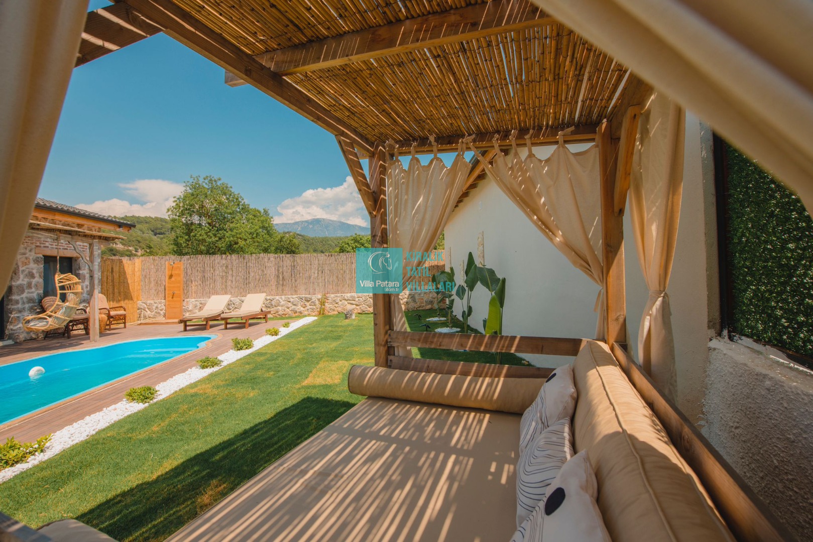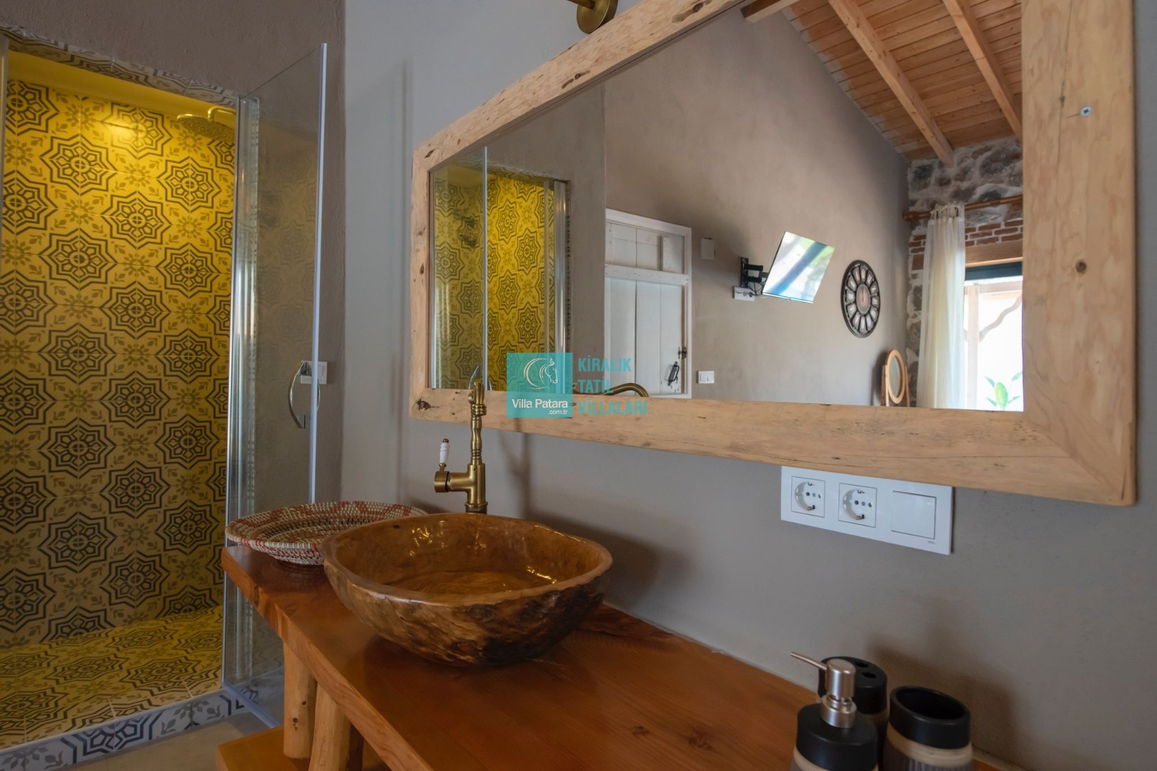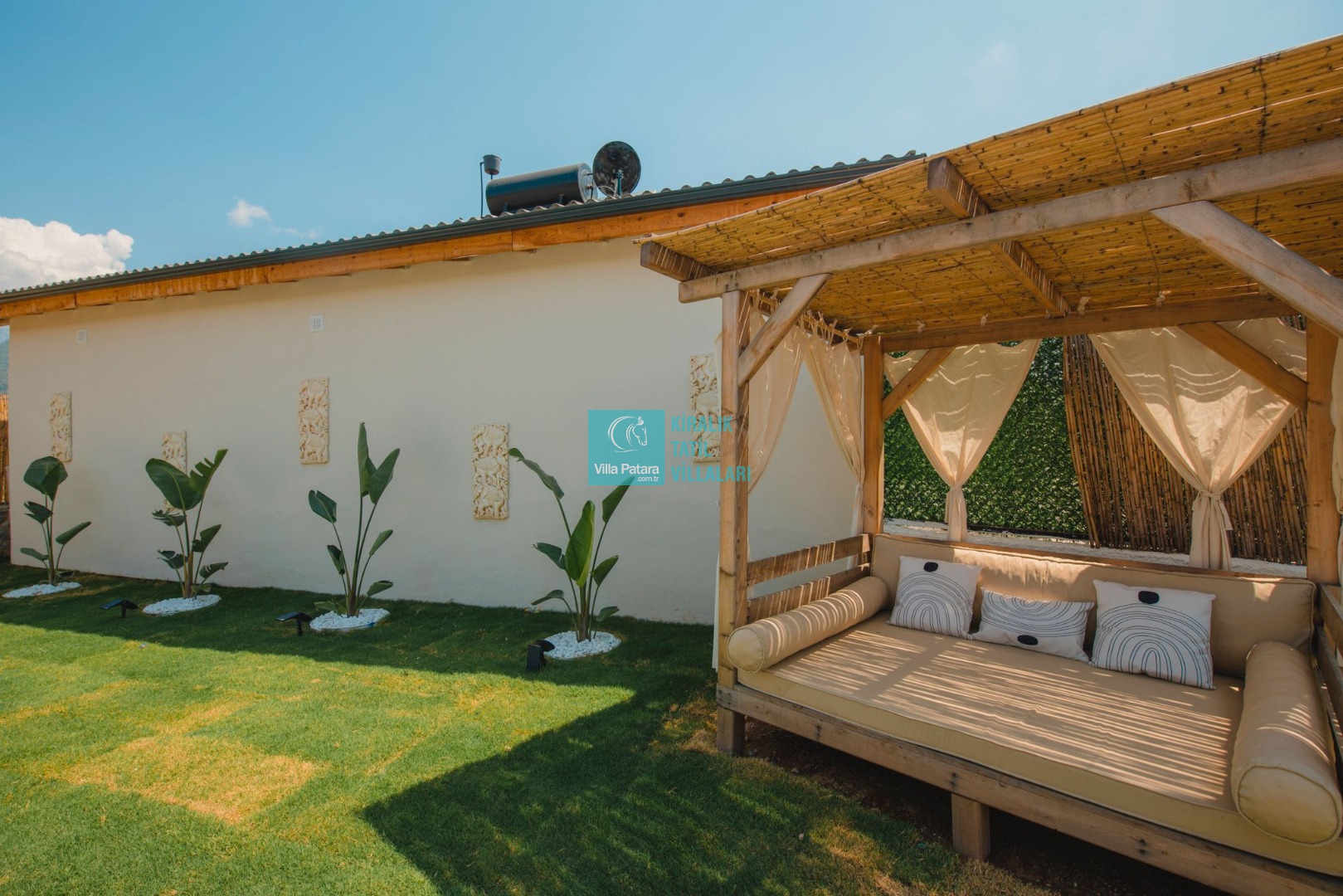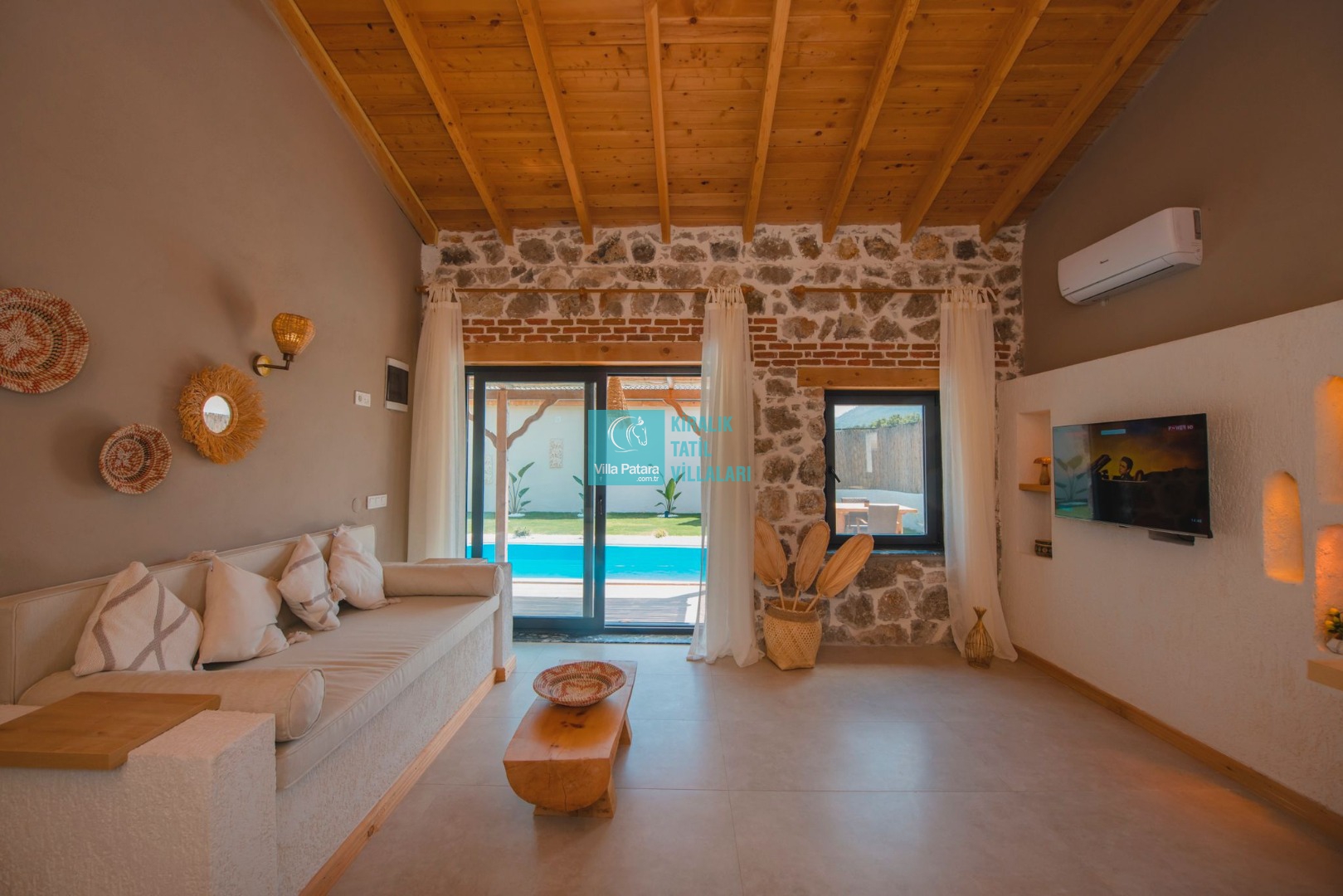 Fethiye Kayaköy mevkiinde bulunan villa, 1 yatak odasıyla 2 kişilik konaklama kapasitesi sunmaktadır. Balayı çiftleri tarafından tercih edilen villa, havuz alanı korunaklı bir yapıya sahiptir. Çam ağaçlarıyla çevrelenmiş, Kayaköy'ün eşsiz doğasına sırtını yaslamış; doğa içinde dingin konumu ve yemyeşil geniş bahçesiyle sakin ve huzurlu bir tatil arayan misafirlerimiz için oldukça uygun olan villa, sizlere Kayaköy'ün büyülü tarihinde kısa bir mola vaadetmektedir. Bu bağlamdan esinlenerek dizayn edilmiş bahçe alanı geniş havuz terasında sahiptir; yine havuz terasında kapasiteye uygun şezlong takımı, konforlu oturma grubu ve barbekü bulunmaktadır. Konforunuz gözetilerek tasarlanmış olan muhafazakar havuz alanına açılan ferah, oturma odası, tam donanımlı açık mutfak; yatak odasında çift kişilik yatak, ebeveyn banyosu bulunmaktadır. Villa, ihtiyaçlarınıza tam karşılık verecek donanıma sahiptir.