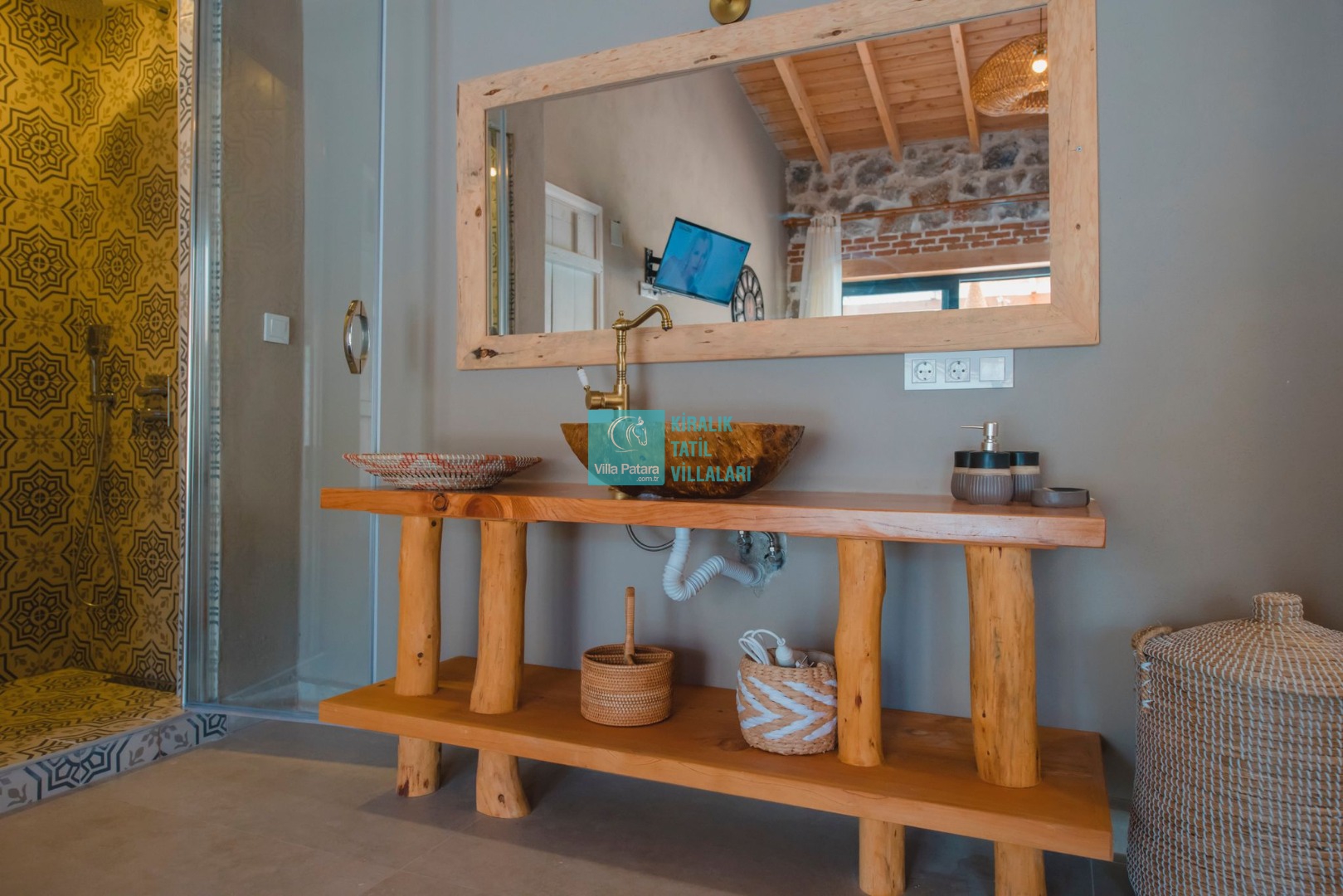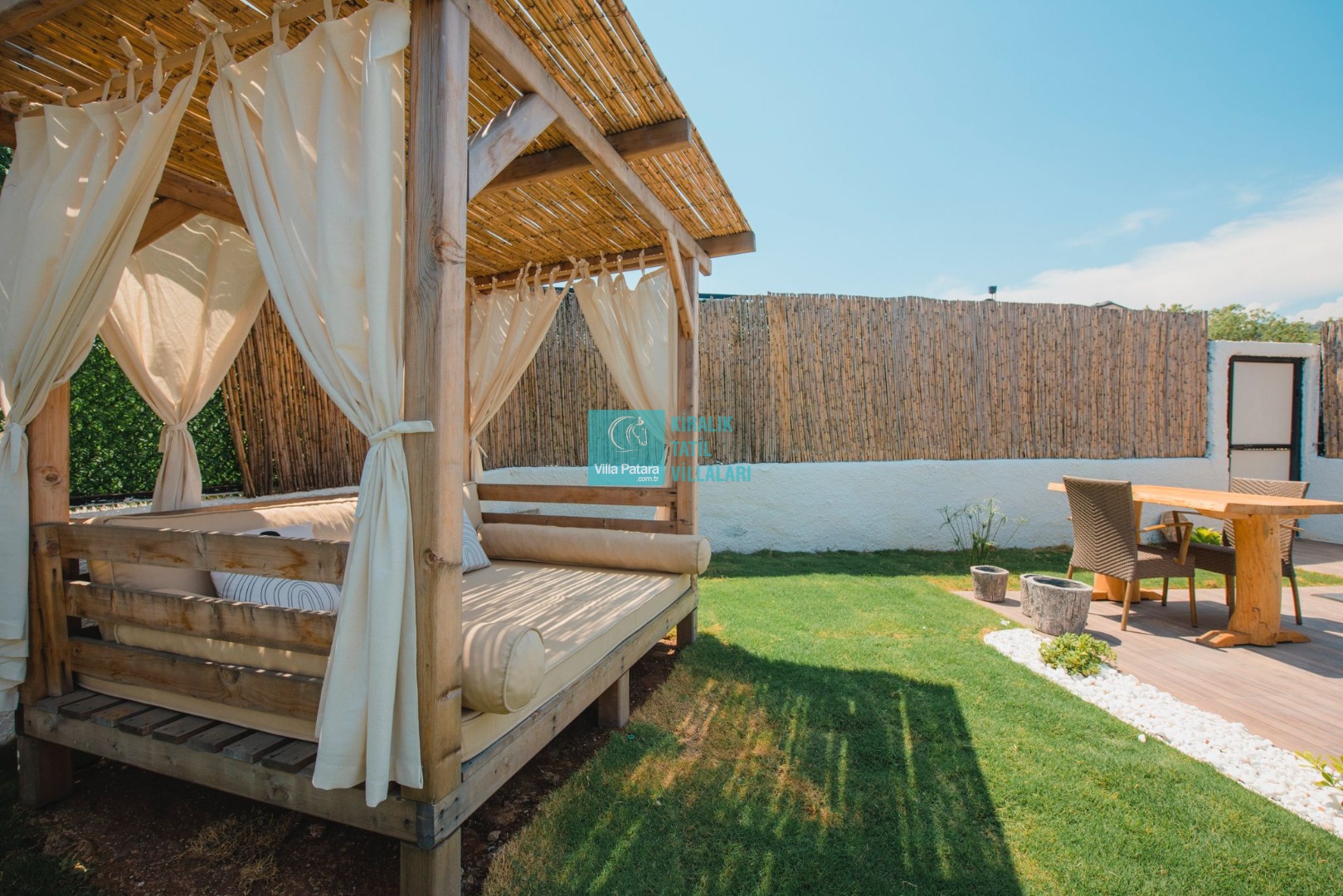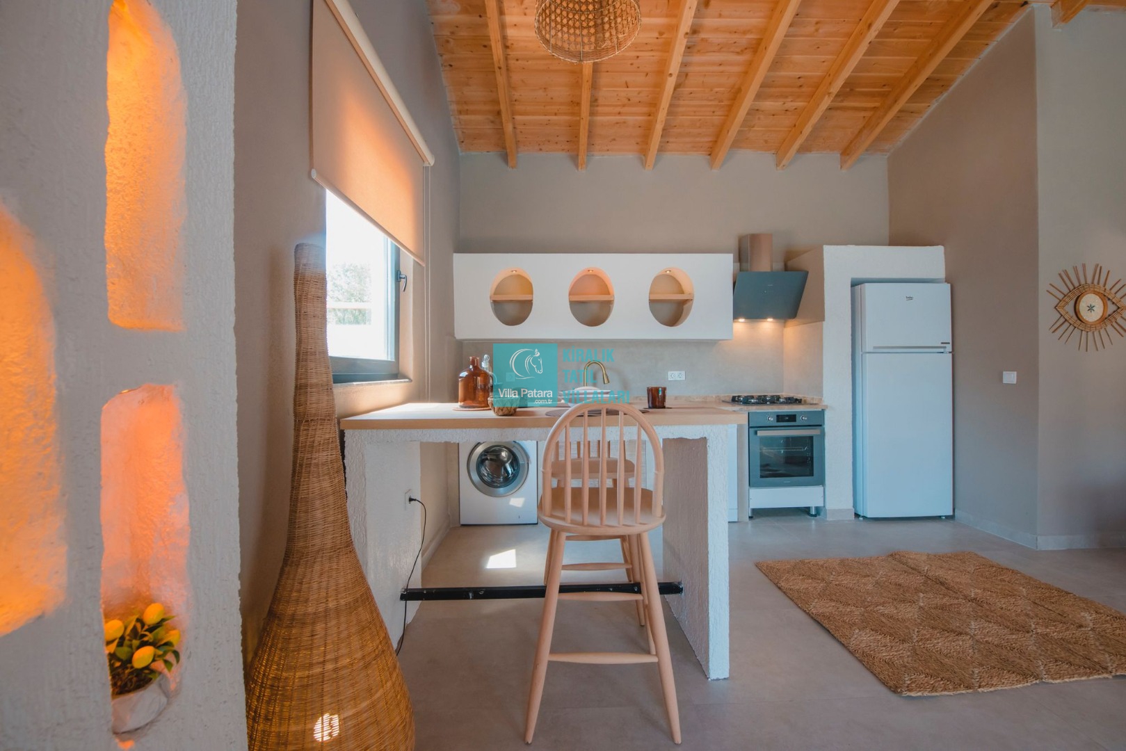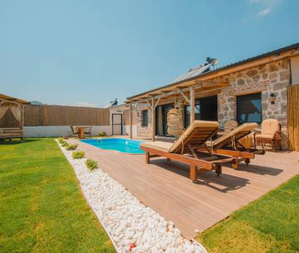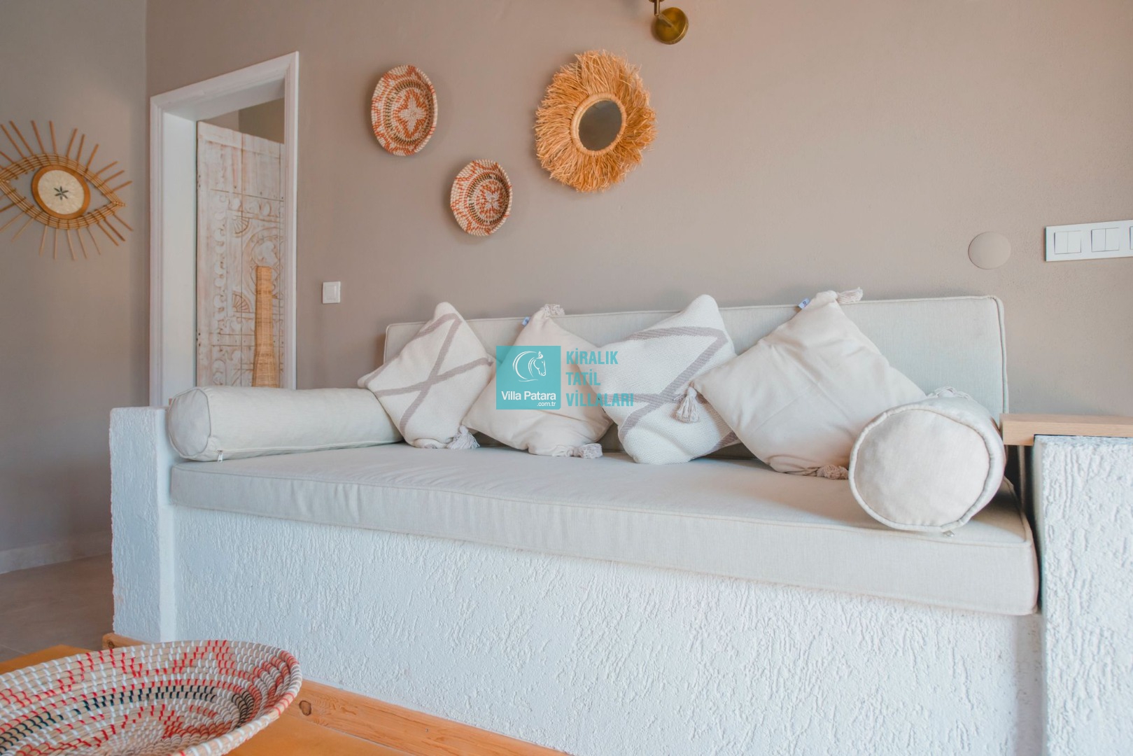 Fethiye Kayaköy mevkiinde bulunan villa, 1 yatak odasıyla 2 kişilik konaklama kapasitesi sunmaktadır. Balayı çiftleri tarafından tercih edilen villa, havuz alanı korunaklı bir yapıya sahiptir. Çam ağaçlarıyla çevrelenmiş, Kayaköy'ün eşsiz doğasına sırtını yaslamış; doğa içinde dingin konumu ve yemyeşil geniş bahçesiyle sakin ve huzurlu bir tatil arayan misafirlerimiz için oldukça uygun olan villa, sizlere Kayaköy'ün büyülü tarihinde kısa bir mola vaadetmektedir. Bu bağlamdan esinlenerek dizayn edilmiş bahçe alanı geniş havuz terasında sahiptir; yine havuz terasında kapasiteye uygun şezlong takımı, konforlu oturma grubu ve barbekü bulunmaktadır. Konforunuz gözetilerek tasarlanmış olan muhafazakar havuz alanına açılan ferah, oturma odası, tam donanımlı açık mutfak; yatak odasında çift kişilik yatak, ebeveyn banyosu bulunmaktadır. Villa, ihtiyaçlarınıza tam karşılık verecek donanıma sahiptir.