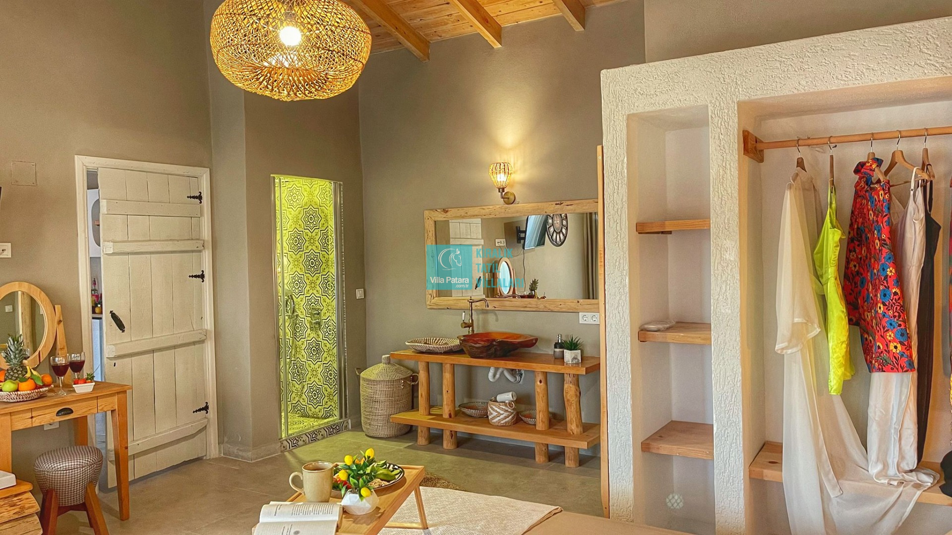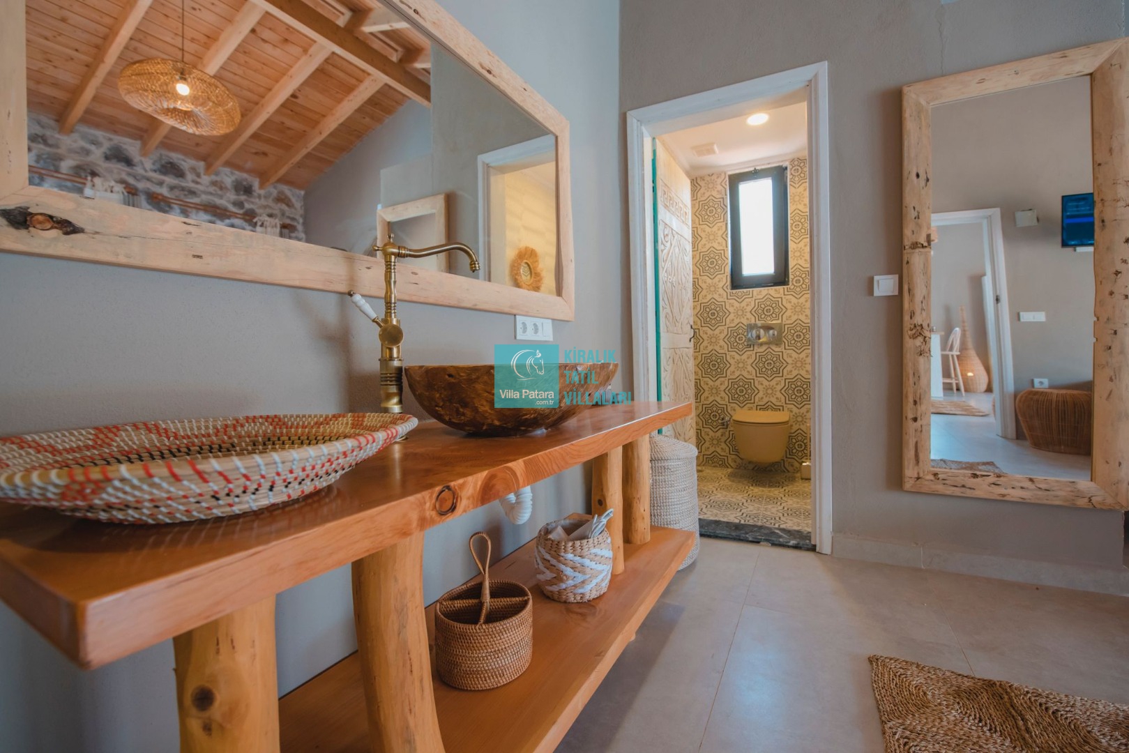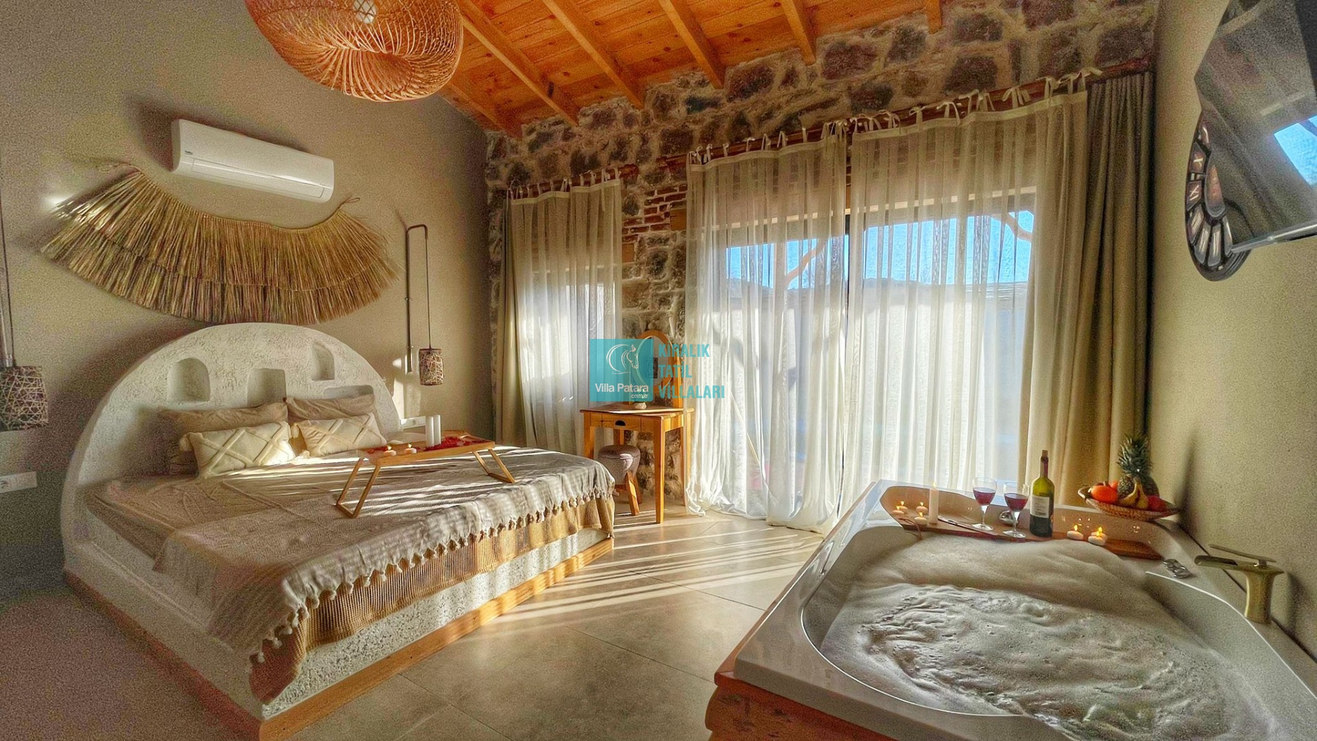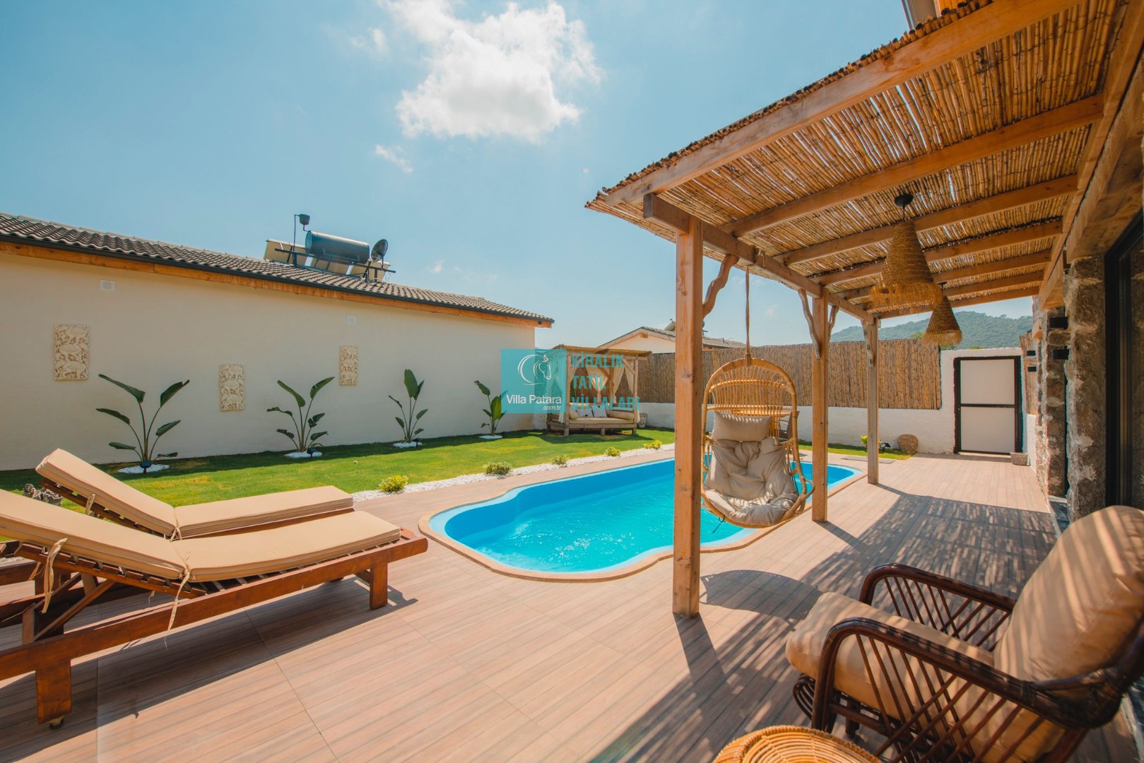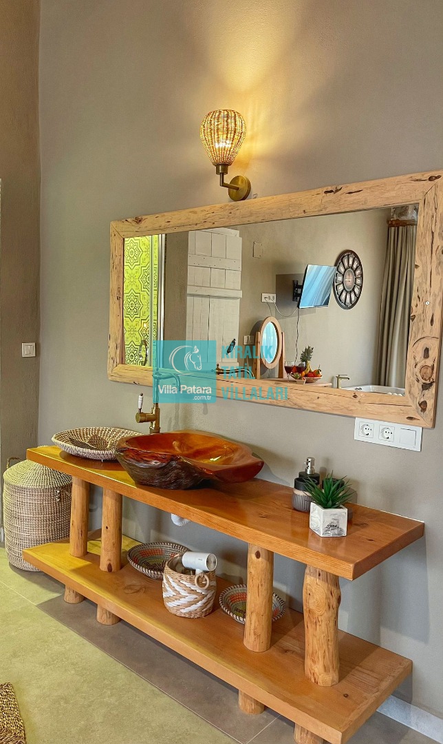 Fethiye Kayaköy mevkiinde bulunan villa, 1 yatak odasıyla 2 kişilik konaklama kapasitesi sunmaktadır. Balayı çiftleri tarafından tercih edilen villa, havuz alanı korunaklı bir yapıya sahiptir. Çam ağaçlarıyla çevrelenmiş, Kayaköy'ün eşsiz doğasına sırtını yaslamış; doğa içinde dingin konumu ve yemyeşil geniş bahçesiyle sakin ve huzurlu bir tatil arayan misafirlerimiz için oldukça uygun olan villa, sizlere Kayaköy'ün büyülü tarihinde kısa bir mola vaadetmektedir. Bu bağlamdan esinlenerek dizayn edilmiş bahçe alanı geniş havuz terasında sahiptir; yine havuz terasında kapasiteye uygun şezlong takımı, konforlu oturma grubu ve barbekü bulunmaktadır. Konforunuz gözetilerek tasarlanmış olan muhafazakar havuz alanına açılan ferah, oturma odası, tam donanımlı açık mutfak; yatak odasında çift kişilik yatak, ebeveyn banyosu bulunmaktadır. Villa, ihtiyaçlarınıza tam karşılık verecek donanıma sahiptir.