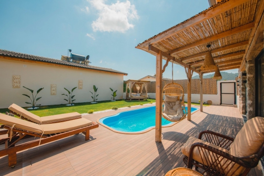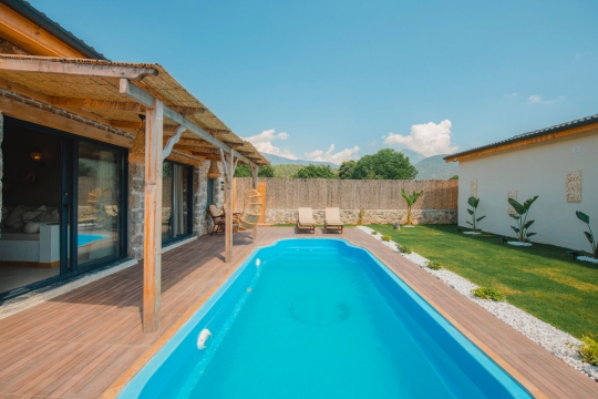 Fethiye Kayaköy mevkiinde  bulunan villa, 1 yatak odasıyla 2 kişilik konaklama kapasitesi sunmaktadır. Balayı çiftleri tarafından tercih edilen villa, havuz alanı korunaklı bir yapıya sahiptir. Çam ağaçlarıyla çevrelenmiş, Kayaköy'ün eşsiz doğasına sırtını yaslamış; doğa içinde dingin konumu ve yemyeşil geniş bahçesiyle sakin ve huzurlu bir tatil arayan misafirlerimiz için oldukça uygun olan villa, sizlere Kayaköy'ün büyülü tarihinde kısa bir mola vaadetmektedir. Bu bağlamdan esinlenerek dizayn edilmiş bahçe alanı geniş havuz terasında sahiptir; yine havuz terasında kapasiteye uygun şezlong takımı, konforlu oturma grubu ve barbekü bulunmaktadır. Konforunuz gözetilerek tasarlanmış olan muhafazakar havuz alanına açılan ferah, oturma odası, tam donanımlı açık mutfak; yatak odasında çift kişilik yatak, ebeveyn banyosu bulunmaktadır. Villa, ihtiyaçlarınıza tam karşılık verecek donanıma sahiptir.