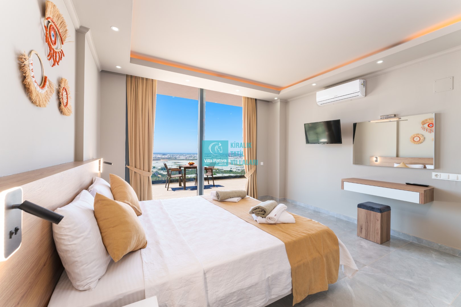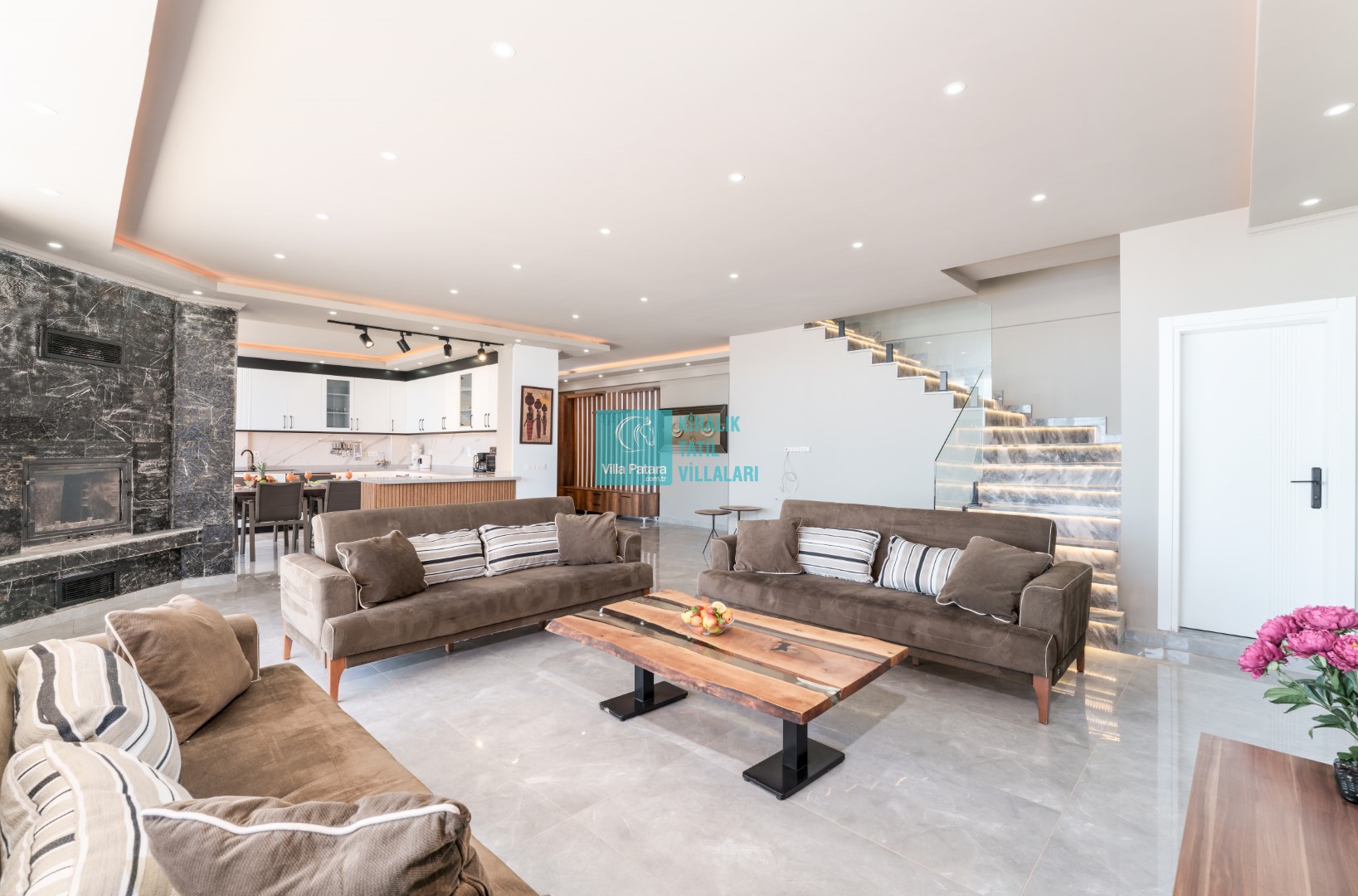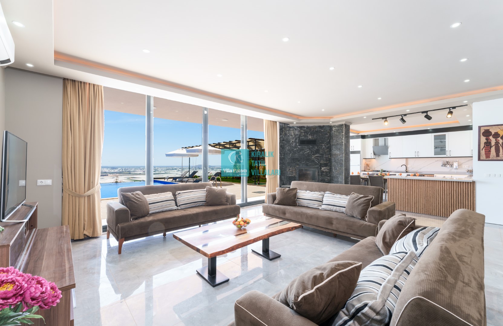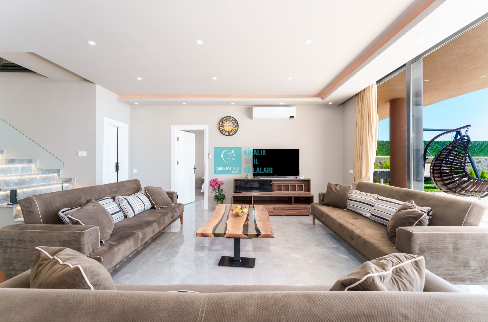 Salon : Konforlu oturma grubu, TV, orta sehpa, klima, modem, havuz terasına çıkış bulunmaktadır.