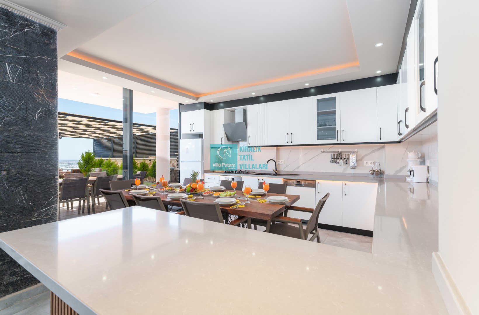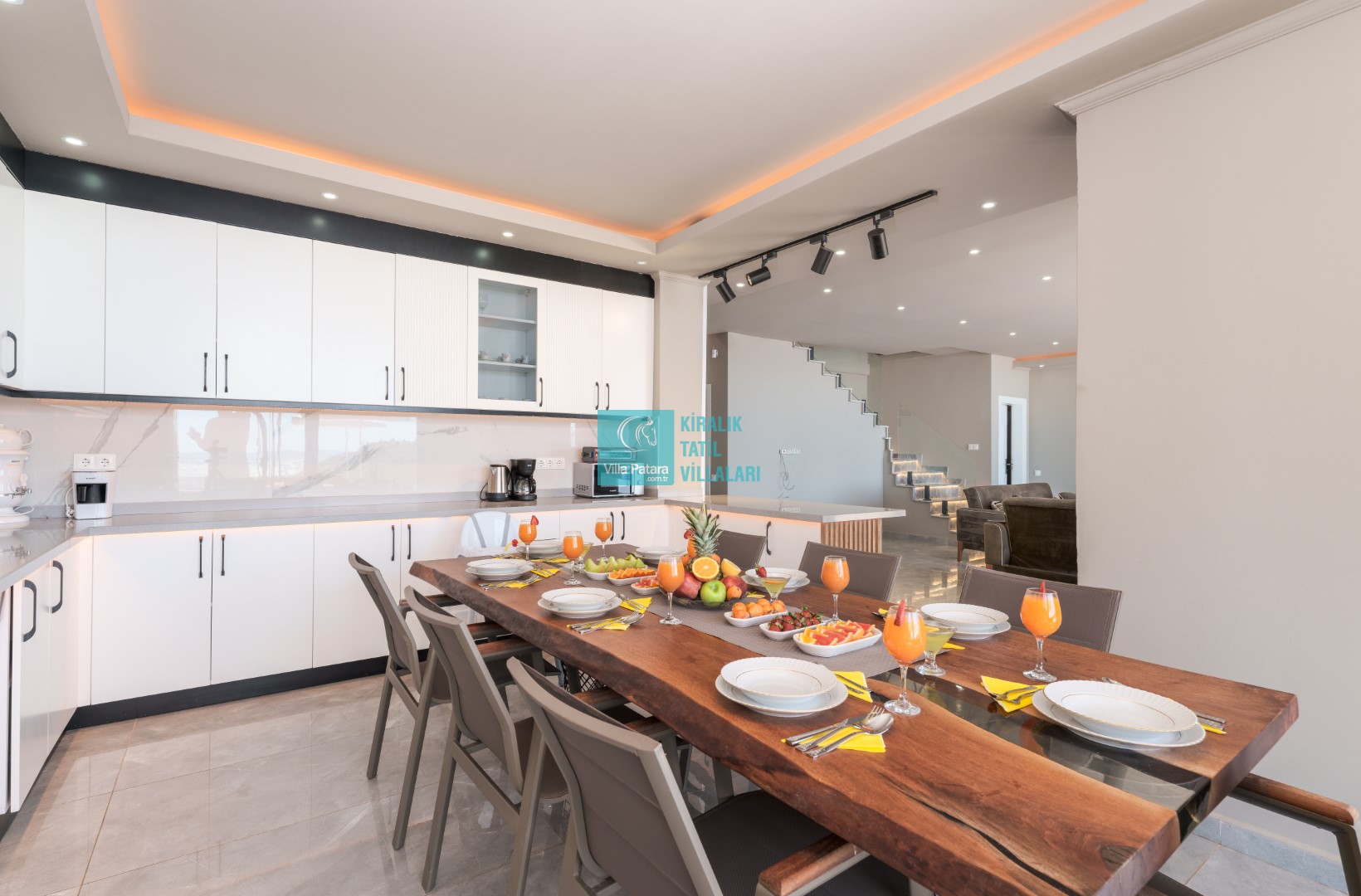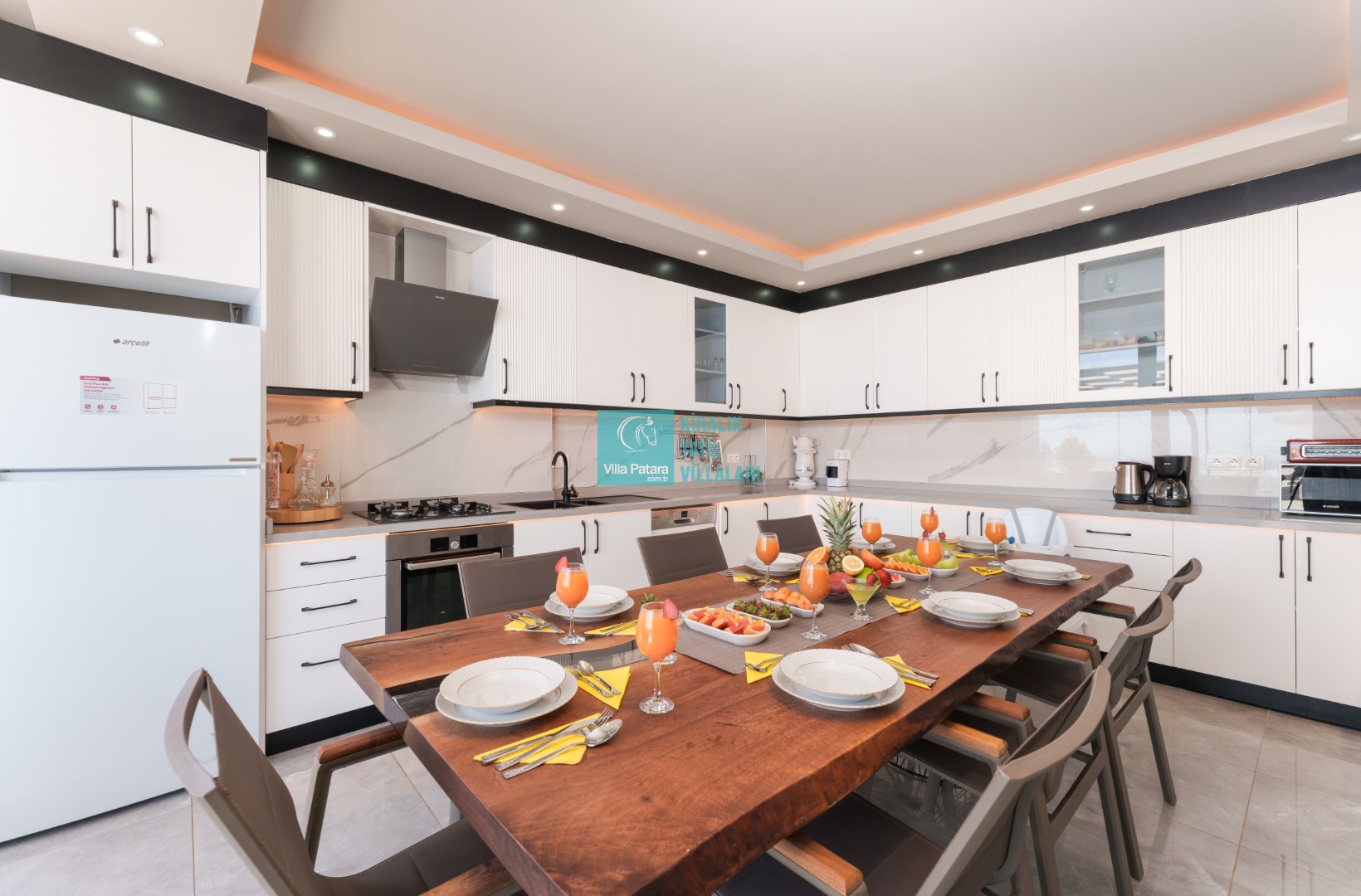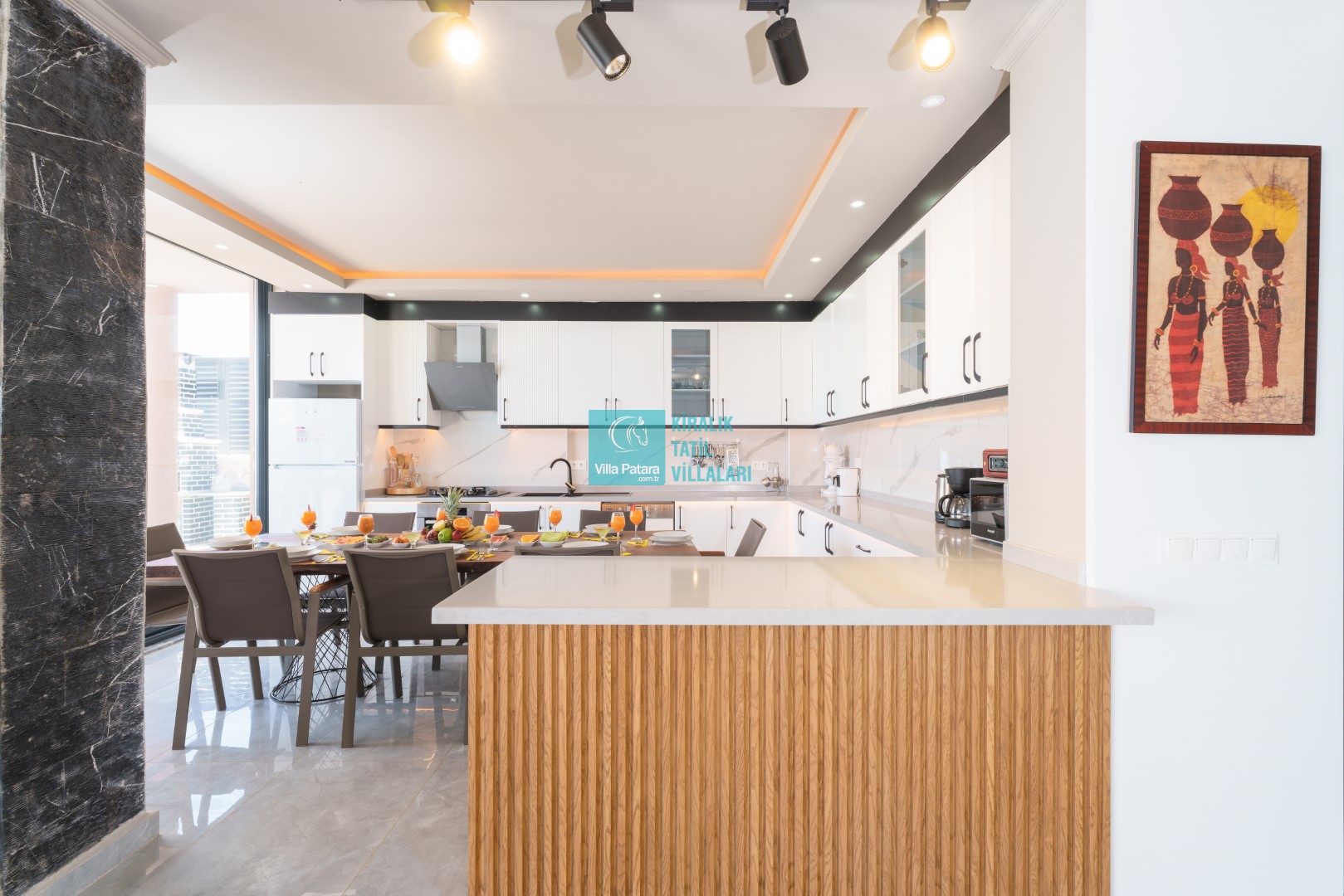 Mutfak : Modern Amerikan mutfak içerisinde buzdolabı, bulaşık makinesi, çamaşır makinesi, fırın, mikrodalga fırın, 4’lü ocak seti, su ısıtıcısı, tost makinesi, ekmek kızartma makinesi, kahve makinesi, mutfak araç gereçleri(tabak&bardaklar, tencere&tavalar, çatal&bıçaklar) ve 8 kişilik yemek masası bulunmaktadır.