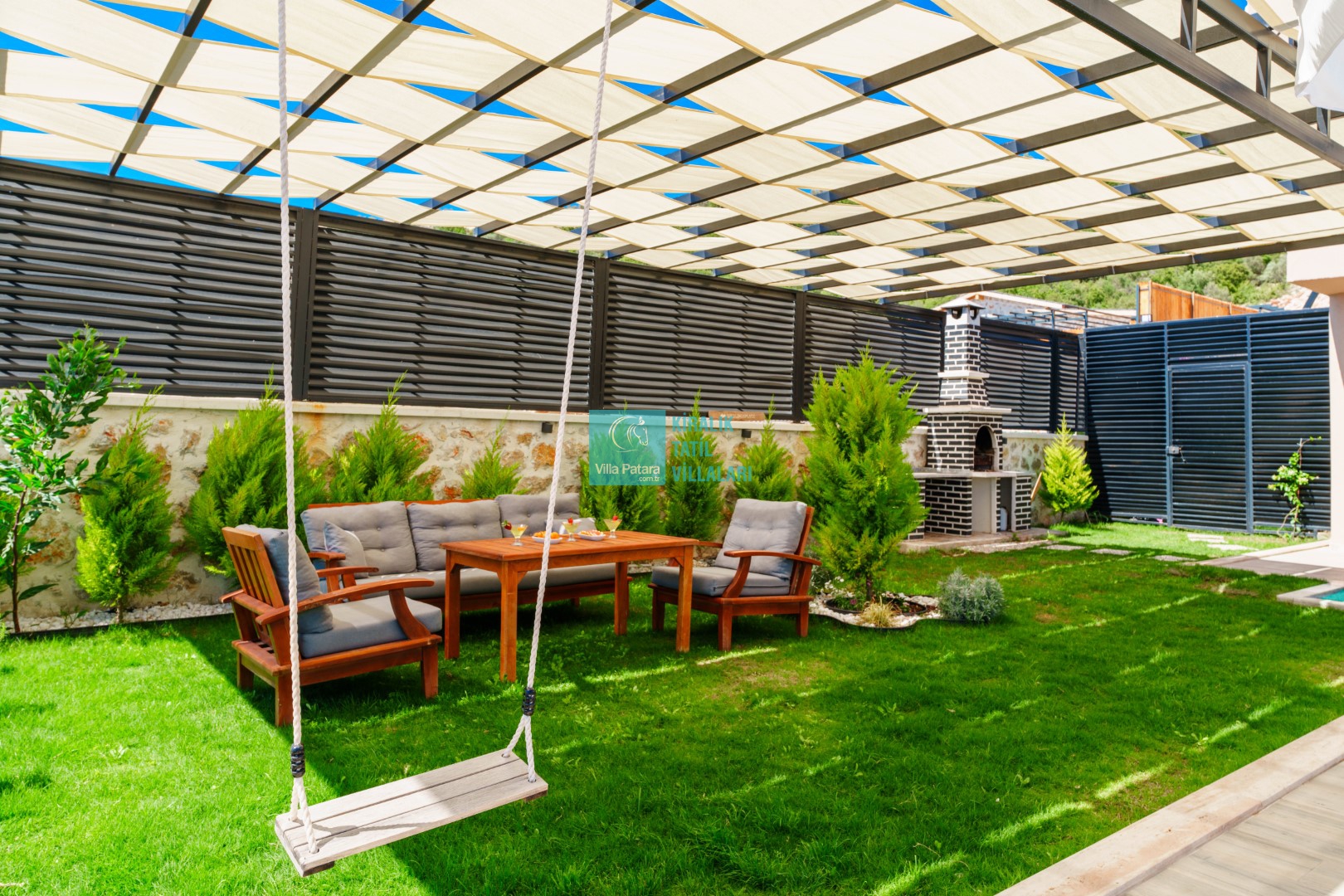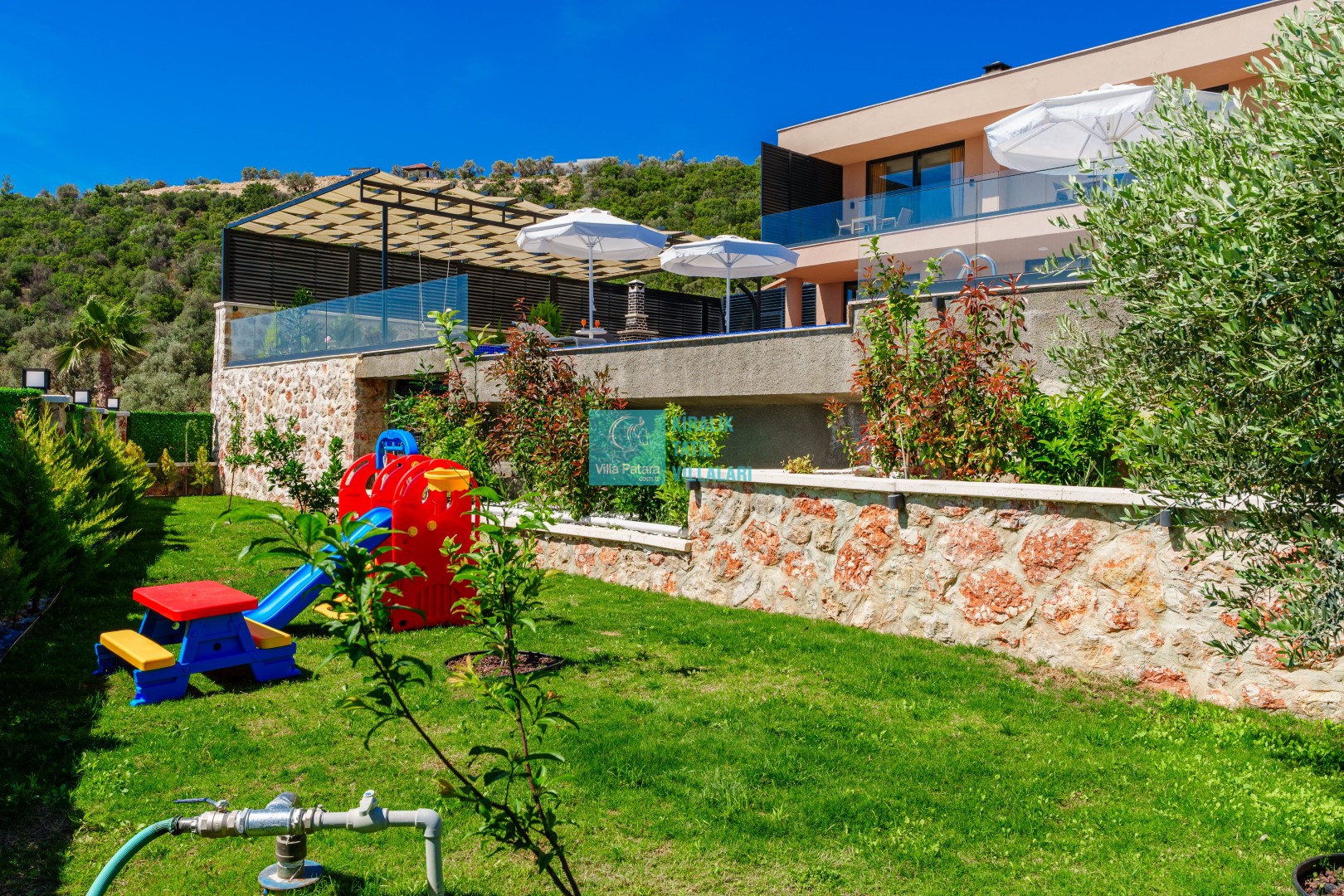 Bahçe : Özel bahçe içerisinde, özel yüzme havuzu, 8 ad. şezlong, 4 ad. güneş şemsiyesi, damla salıncak, çocuk oyun alanı, 2 kişilik salıncak, langırt, bahçe yemek masası ve sandalyeleri,bahçe oturma grubu ve taş barbekü bulunmaktadır.