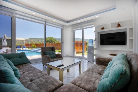 Şık dekore edilmiş salonda, oturma grubu, sehpa, su sebili, televizyon, uydu alıcı ve klima yer almaktadır. Ayrıca salondan havuz terasına çıkışta bulunmaktadır.
