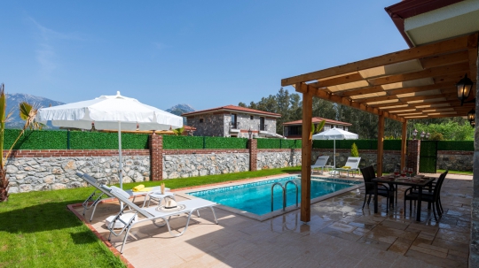 Fethiye'nin en gözde bölgelerinden Kayaköy'de konumlanan Villa Cemre, . 360 derece doğa manzarası eşliğinde, mahremiyet içerisinde unutulmaz bir tatil deneyimi yaşayabilirsiniz. Bölgenin en değerli lokasyonlarından birinde yer alan villa, hem doğal güzelliklere hem de şehir olanaklarına kolay erişim imkânı sağlar. Villa Cemre, 4 kişilik konaklama kapasitesiyle ailenizle birlikte rahat bir tatil geçirmeniz için ideal bir seçenektir. 2 yatak odası ve 2 banyosuyla misafirlerine konforlu bir yaşam alanı sunar. Taş yapısı ve otantik dizaynıyla dikkat çeken villa, modern yaşamın konforunu geleneksel mimariyle buluşturur. Klimalı yaşam alanları sayesinde yaz aylarında da rahat bir konaklama imkânı bulunmaktadır.