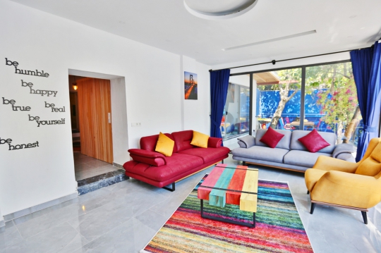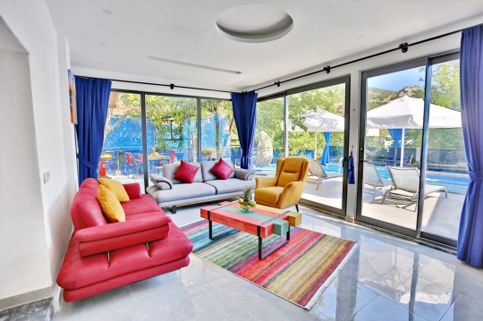 Salon : Modern oturma grubu, orta sehpa, Tv, Tv ünitesi, klima ve havuz terasına çıkış bulunmaktadır.