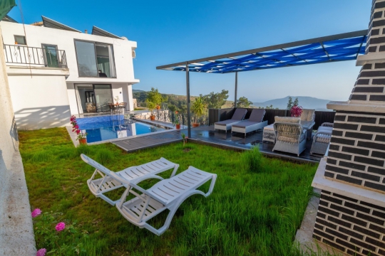 Korunaklı yüzme havuzu, şezlong, şemşiye, masa ve sandalye, mangal bulunmaktadır.