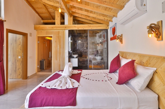En suit, 1 adet çift kişilik yatak, komodin, klima, jakuzi, sauna, hamam ,banyo ve tuvalet bulunmaktadır.