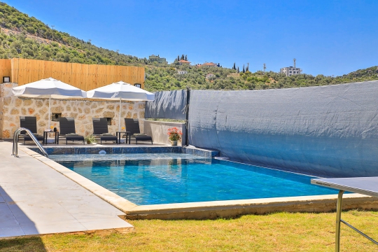 Kalkan Ulugöl bölgesinde bulunan 5 kişi konaklama kapasiteli yepyeni kiralık villadır. Kiralık Villa Egemen, muhafazakar villalar, jakuzili villalar ve balayı villaları kategorisinde yer almaktadır. Eşşiz doğa manzarasına sahip olan villamızın 2 yatak odası bulunmakta olup ana yatak odasında jakuzi yer almaktadır. Oldukça lüks ve kaliteli eşyalarla dizayn edilen villamız size ayrıcalıklı bir tatil sunmak için 2022 yılında siz değerli misafirlerimizin beğenisine sunulmuştur.Ayrıca, villamızın özel yüzme havuzu korunaklı olup, çekirdek aileler ve balayı çiftleri için oldukça uygun bir seçenektir.