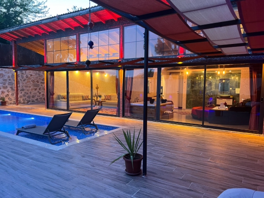 Salon : Havuz ve doğa manzaralı Oturma grubu, Uydu TV, Klima, 2 kişilik yemek masası, Havuz kenarına çıkış bulunmaktadır.