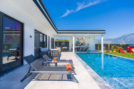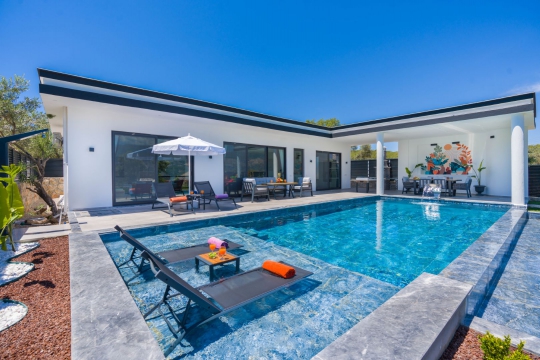 Terasında özel yüzme havuzu, şezlonglar, güneş şemsiyeleri, langırt, yemek masası, bahçe oturma grubu, barbekü alanı bulunmaktadır.