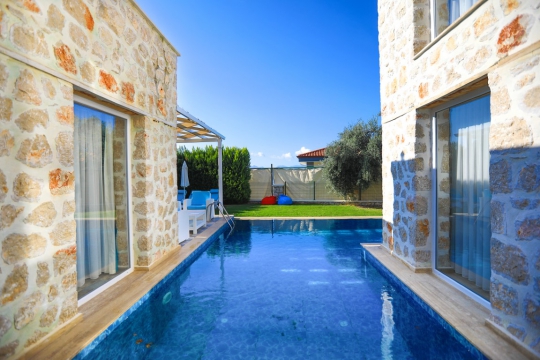 Villa Emir 2 , Kalkan/Üzümlü Mahallesinde konumlanmış olup 3 suit yatak odalı, 6 kişilik, korunaklı havuz ve bahçeli taş yapı bir villadır.
