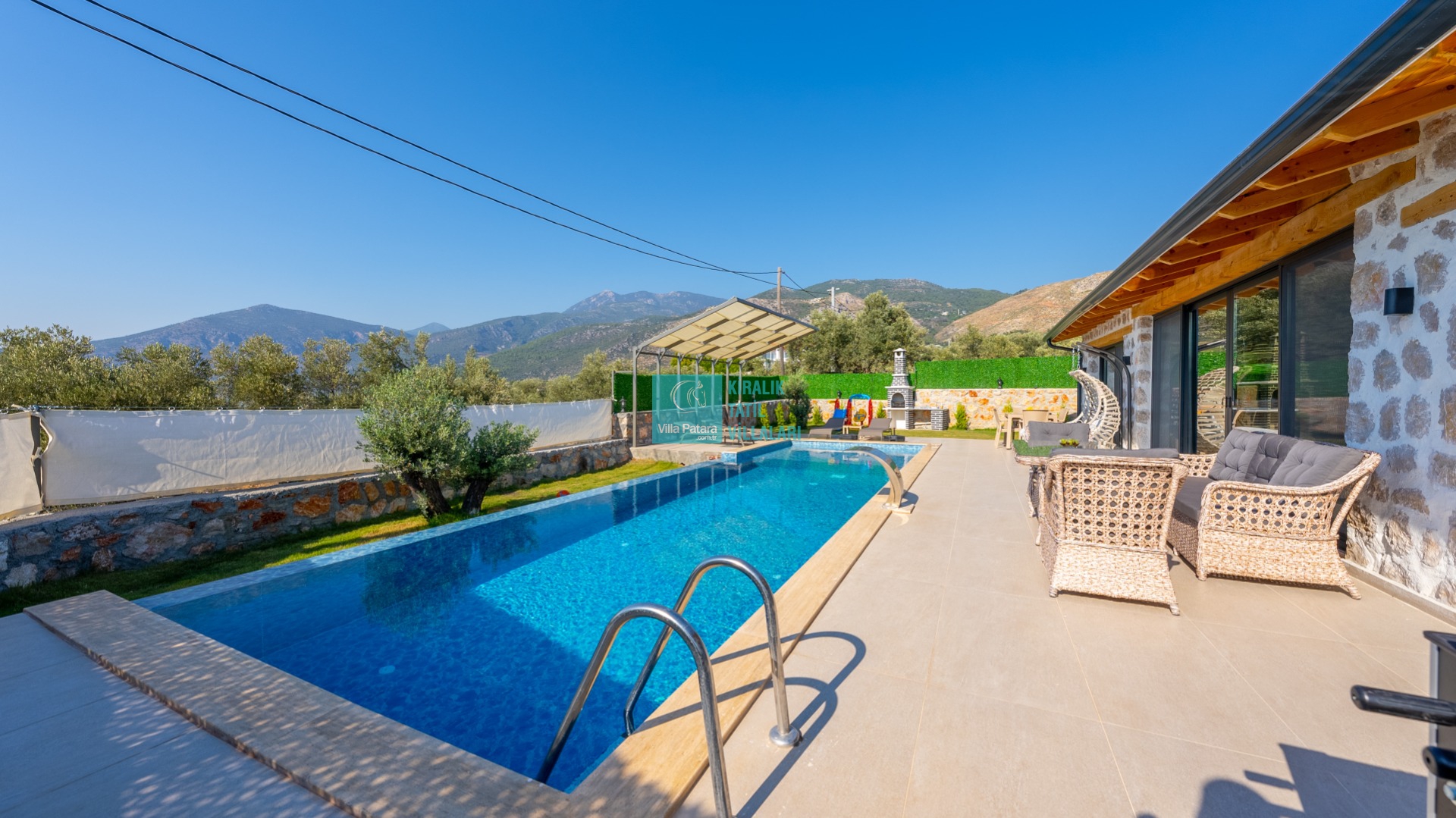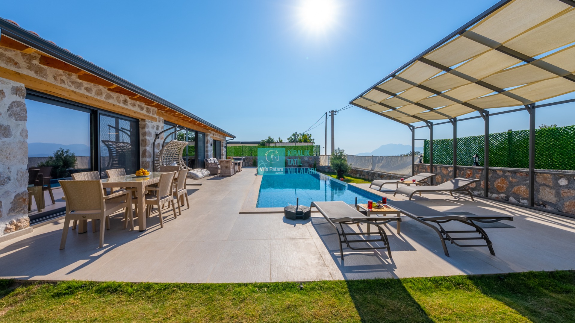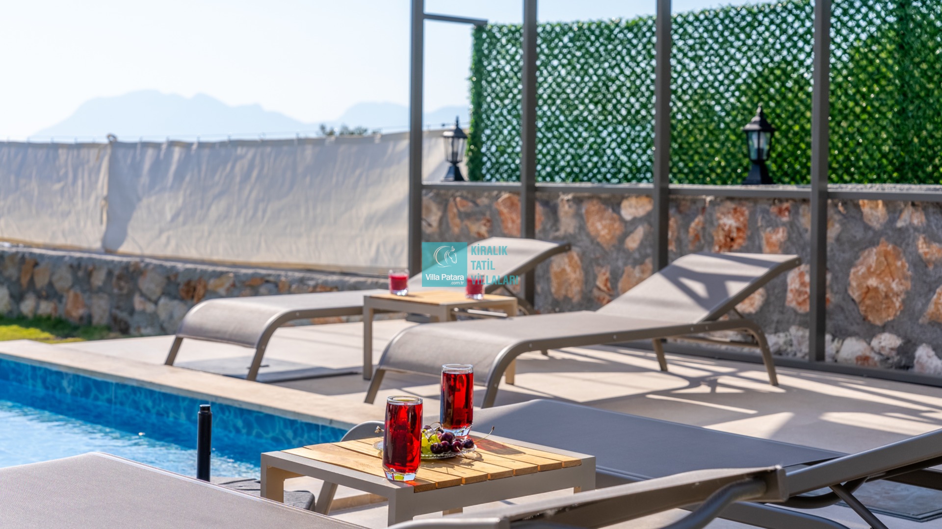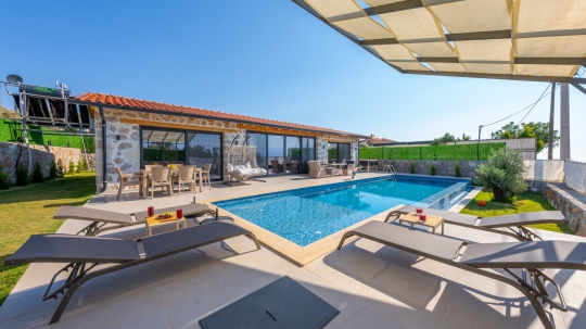 Özel yüzme havuzu tam korunaklı olup, havuz terasında olabildiğince şık döşemeler kullanılmıştır. Hem çekirdek aileler hem de balayı çiftleri için dizayn edilen villamızın Süit yatak odalarında çift kişilik jakuzi bulunmaktadır.