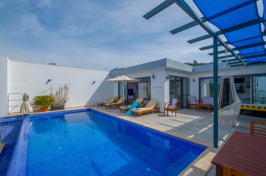 Kalkan merkeze 10 km mesafede bulunan villamız, tatilcilerin hem şehir merkezinde hem de sakin bir villa konumunda tatil geçirmelerine olanak sağlıyor.