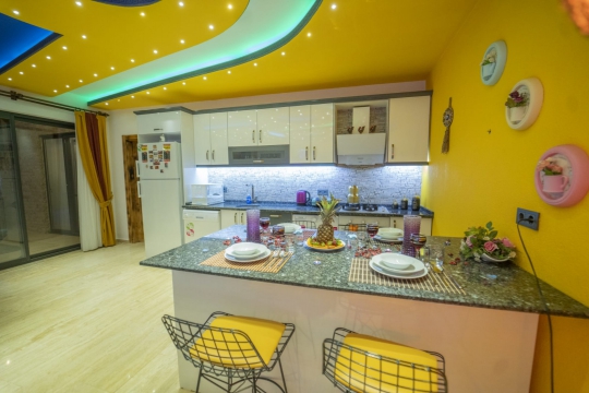 Mutfak: Amerikan tarzı mutfak, buzdolabı, bulaşık makinesi, çamaşır makinesi, yemek masası, fırın, 4’lü ocak, kettle, 4 kişilik yemek takımı, tava, tencereler, çatal, bıçak takımı bulunmaktadır.