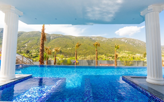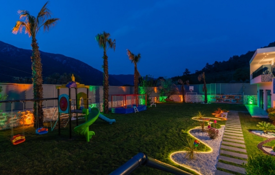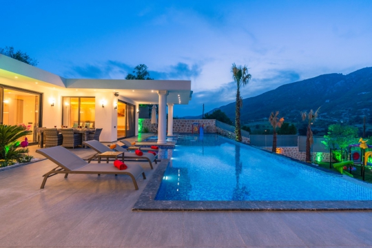Kiralık villa Ferzan, Kalkan/Hacıoğlan bölgesinde konumlanmıştır. Villamız kalkan da lüks kiralık tatil villaları arasındadır. 6 kişilik kapasiteye sahip 3 yatak odalı özel havuzlu korunaklı lüks villalarımız arasındadır. Villamızda jakuzi, küvet, çoçuklar için oyun alanı(sandalye,masa, kitap,oyuncaklar), sinema odası, masa tenisi, langırt, playstation, küçük çoçuk parkı ( kaydırak ve salıncak), büyük çocuk parkı( kaydırak, salıncak, top havuzu, trambolin, tahterevalli, futbol kalesi, basketbol potası), havuz başında barbekü, nargile, oturma grubu, yemek masası, apple yatak bulunmaktadır. Villamızın büyük havuzunda çoçuk havuzu, jakuzisi ve şelalesi bulunmaktadır. Villamız 400 m² çim alana sahiptir. Kalkan şehir merkezine 15 dakikalık yol mesafesindedir. Villamızın havuzu korunaklı olup muhteşem bir doğa manzarasına sahiptir. Villamızın alt kısmında ise spa merkezi bulunmaktadır.