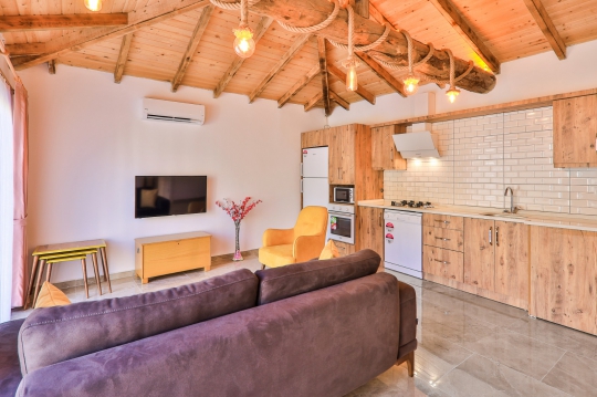 Oturma grubu, uydu alıcı, TV, klima, ütü ve ütü masası, elektrik süpürgesi, havuza çıkış bulunmaktadır.